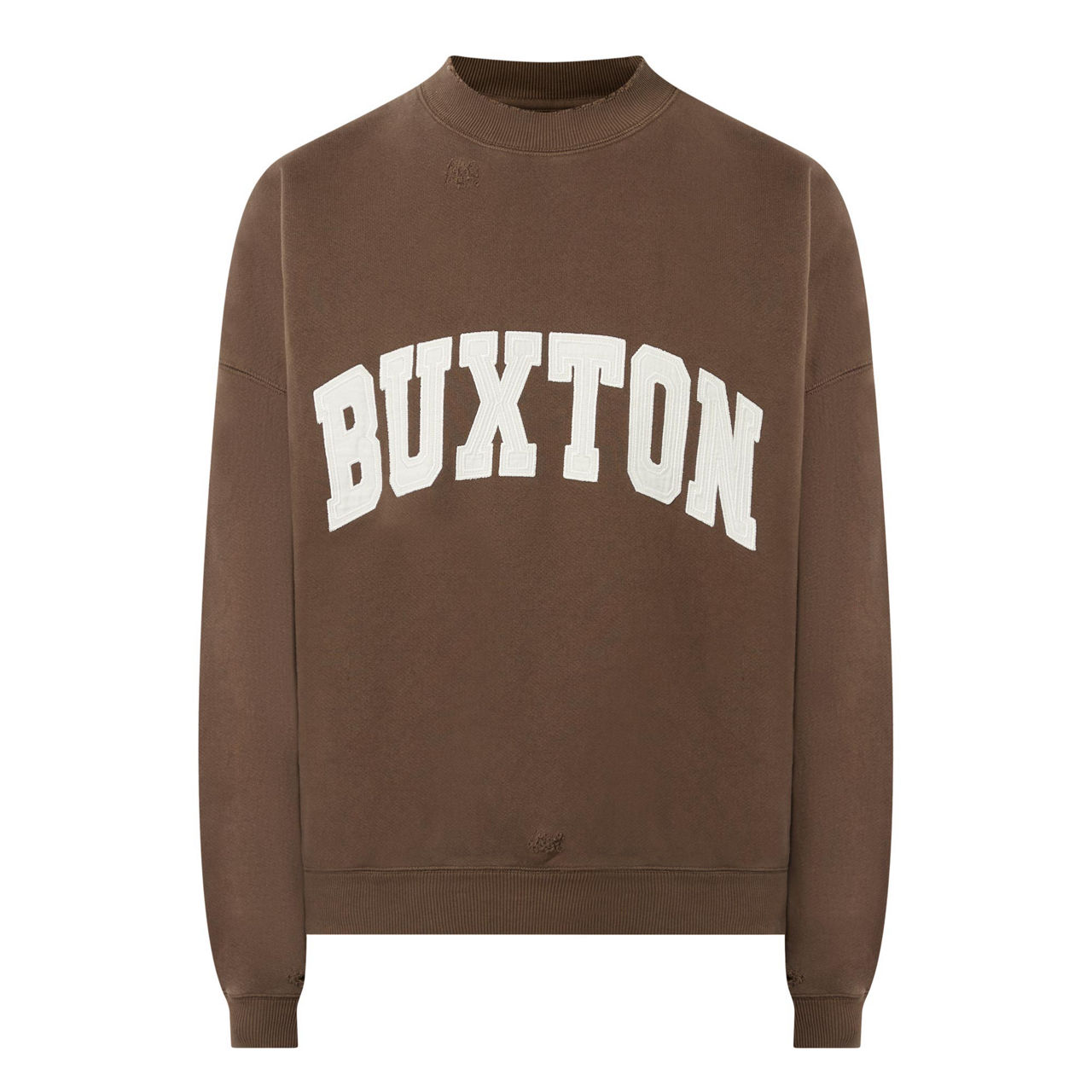 - Crew neckline, distressed lettering, long sleeves, ribbed trims, straight hemline