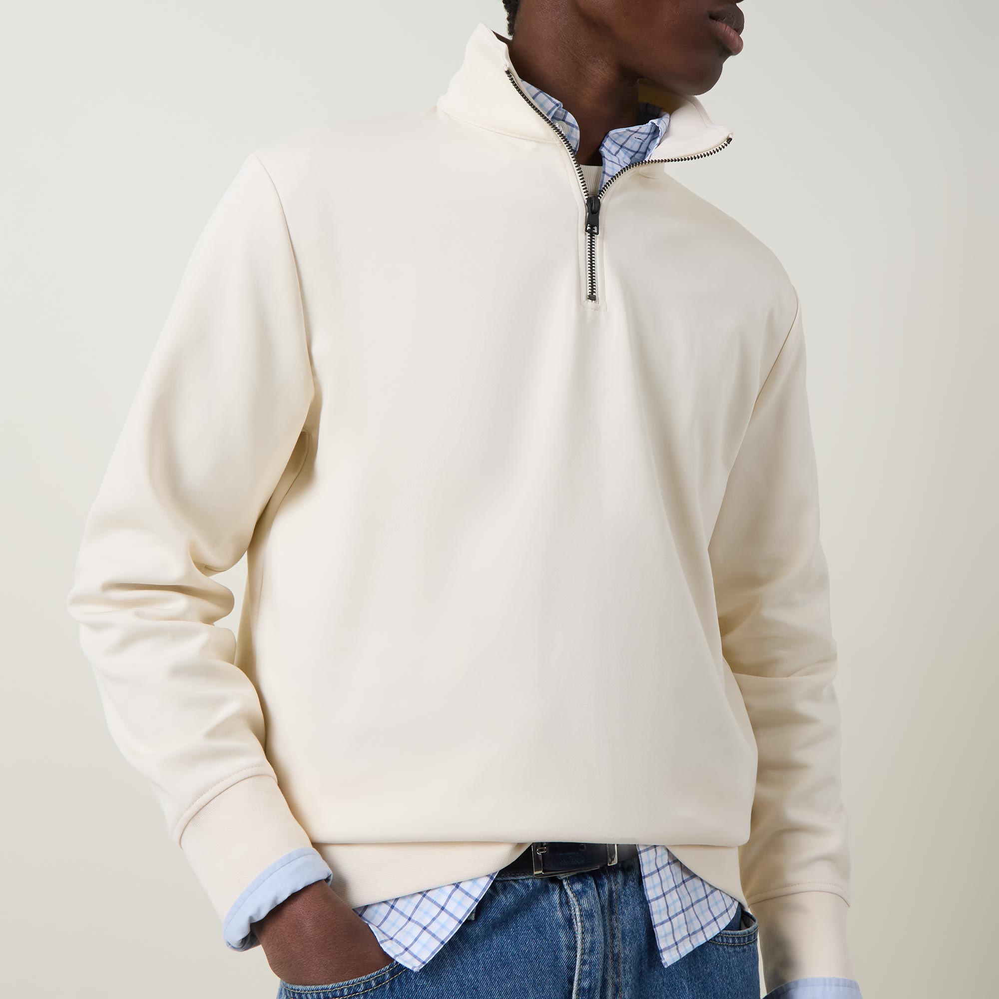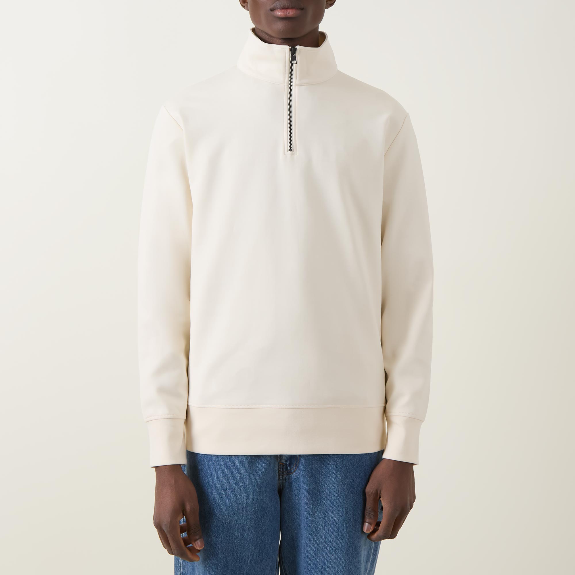 - Half-zip fastening, standing collar, long sleeves, ribbed trims, straight hemline, logo details