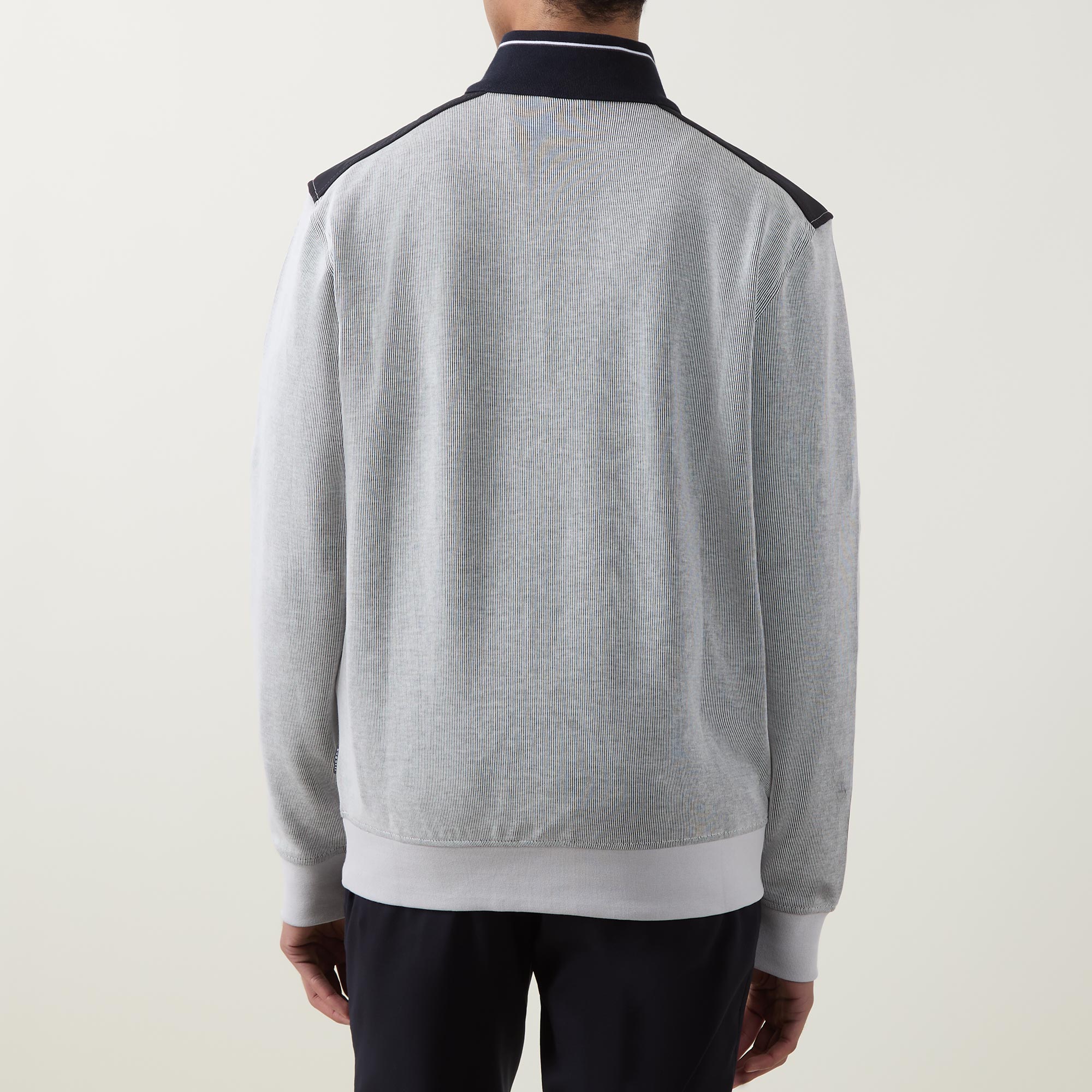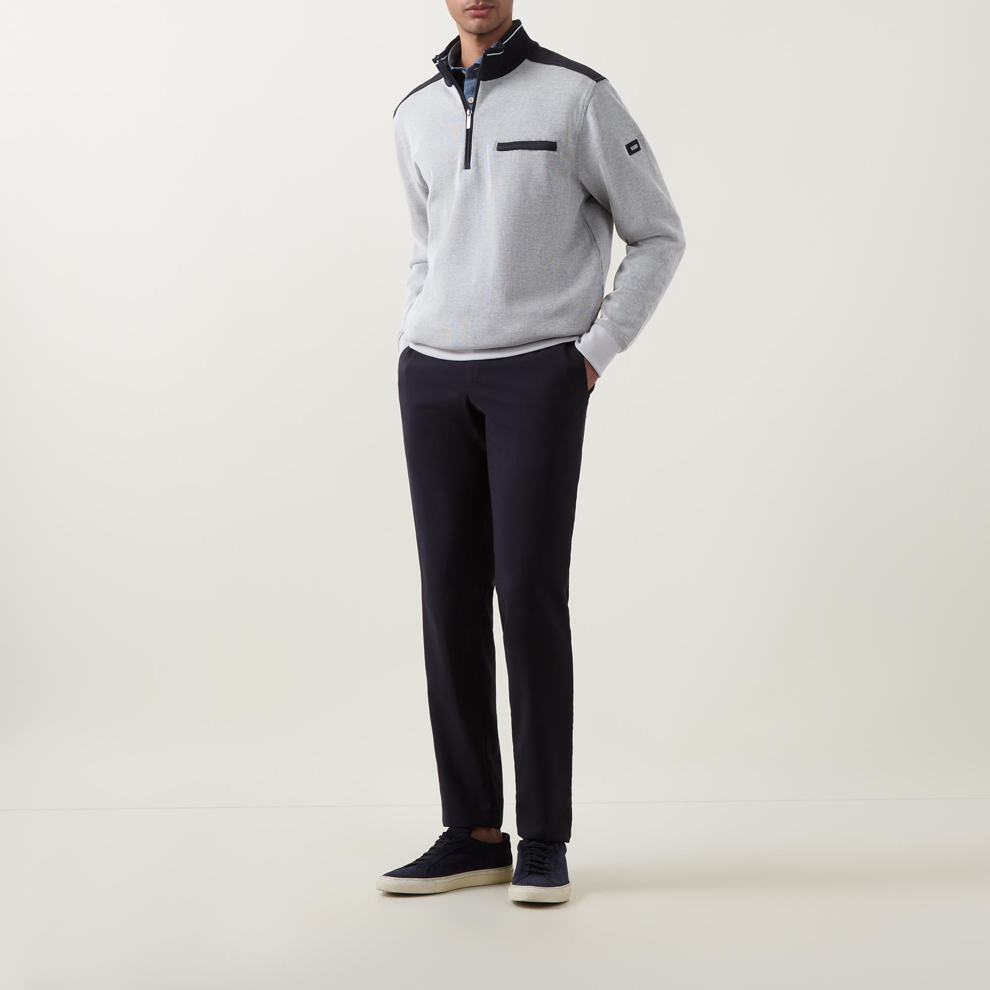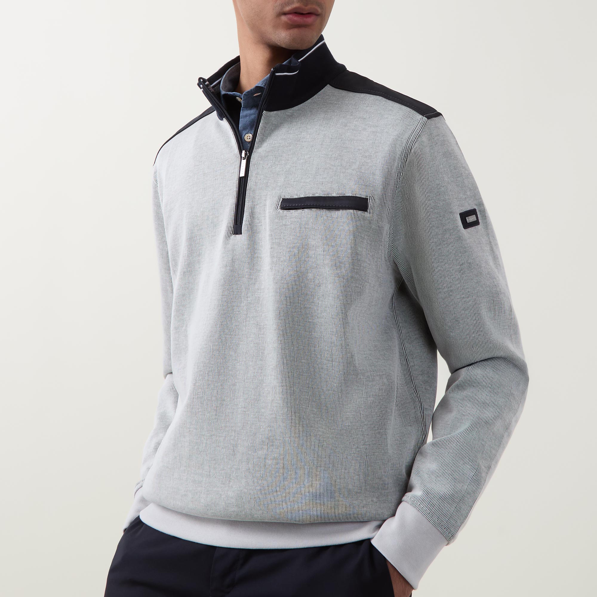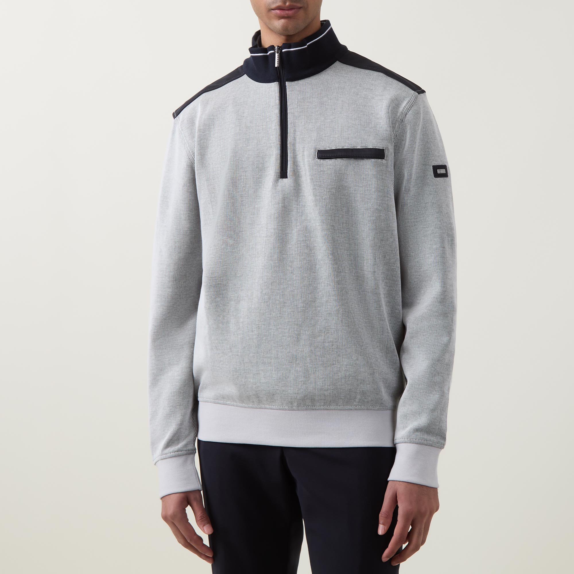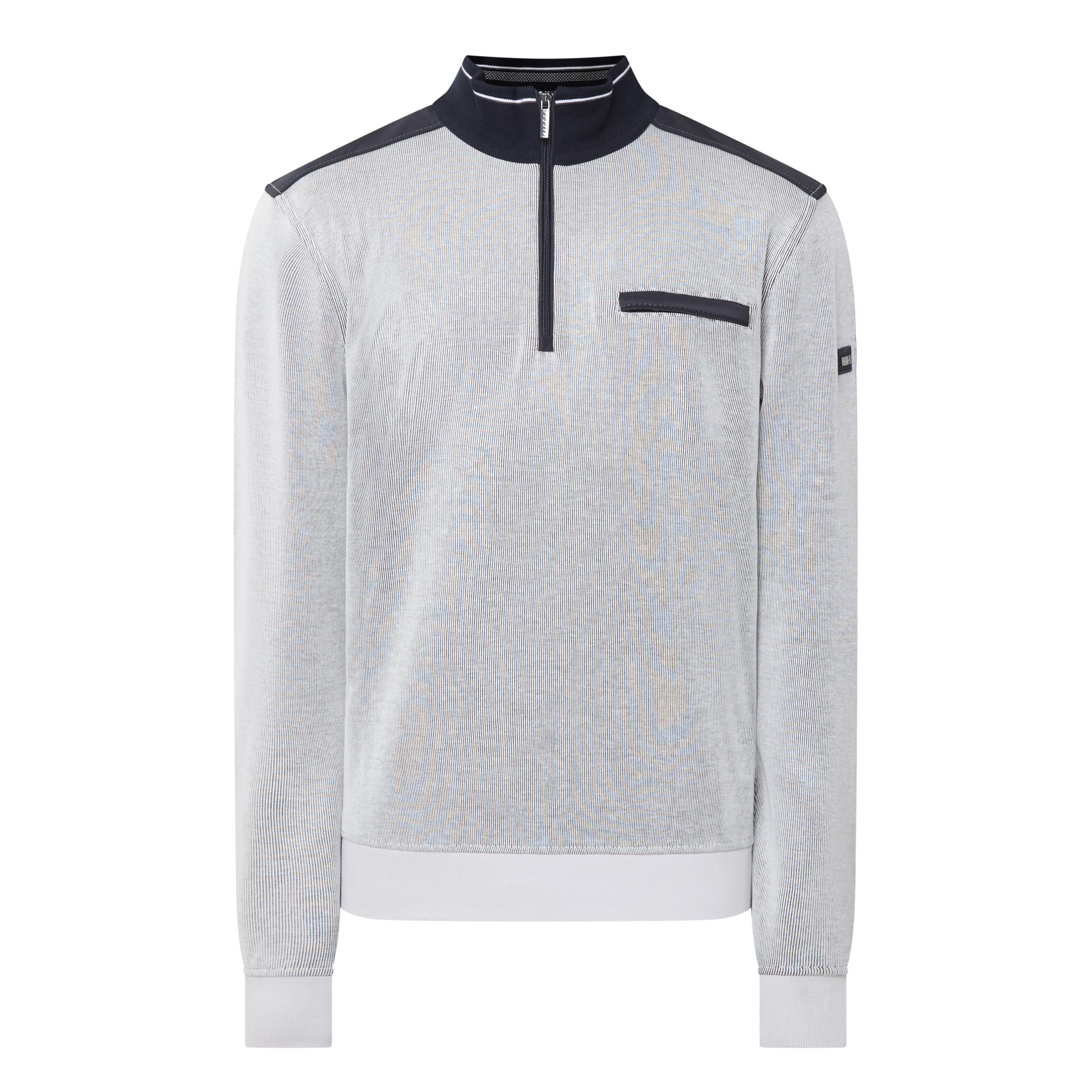 - High neckline, quarter-zip fastening, long sleeves, ribbed trims, chest pocket, contrast shoulder details, logo detail