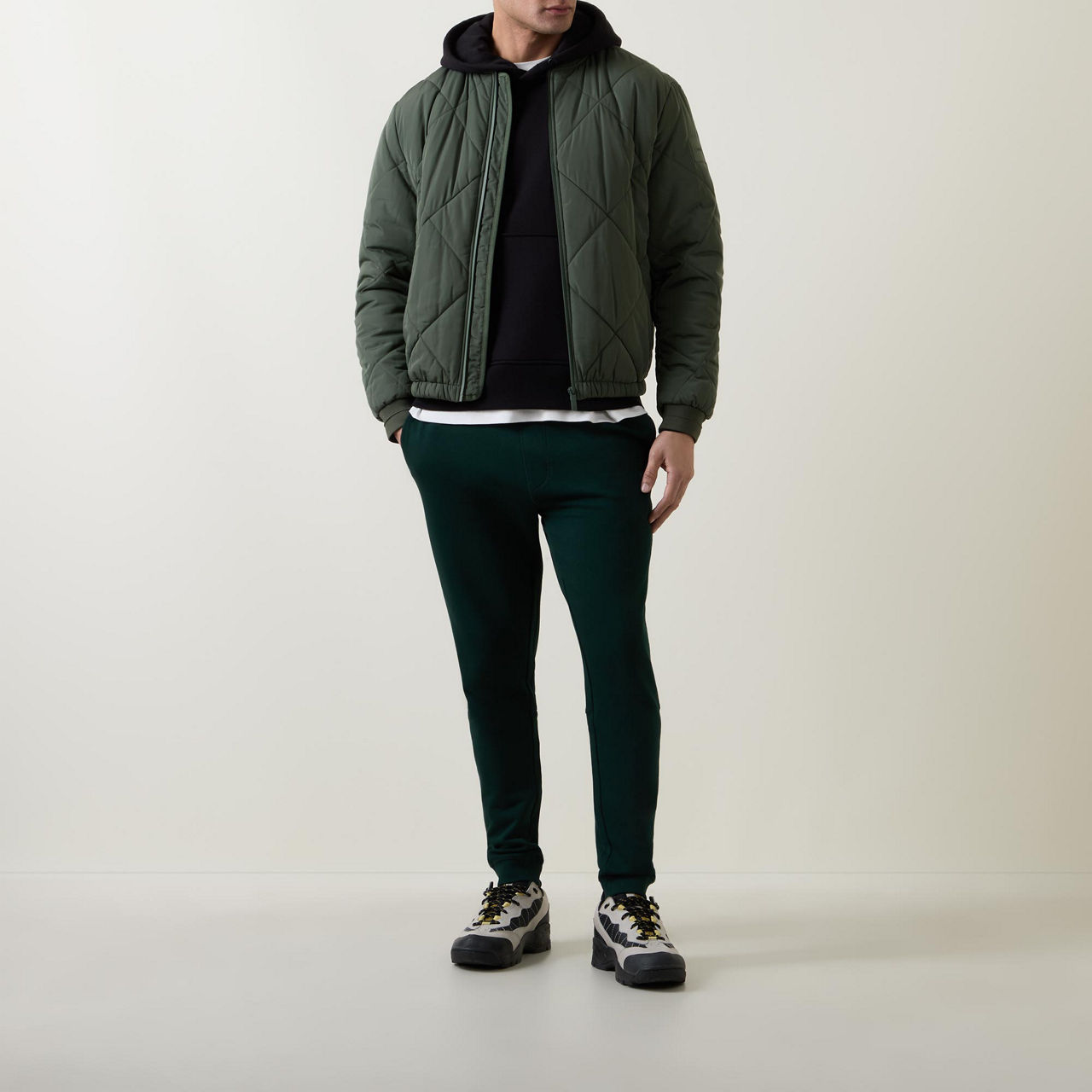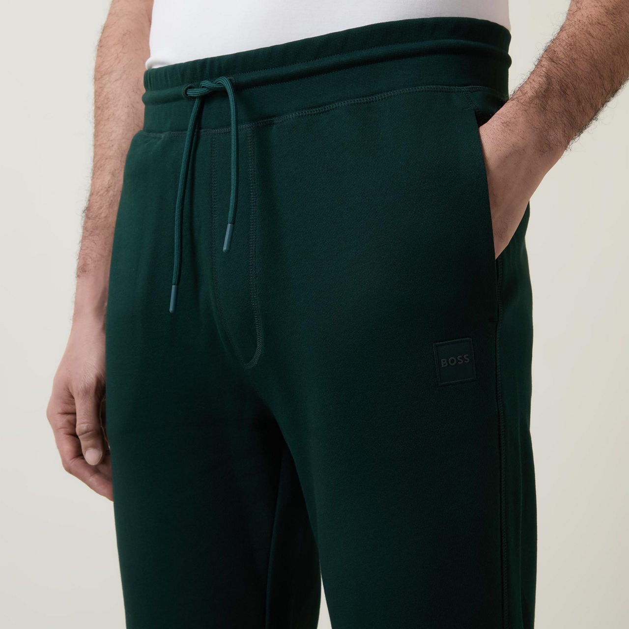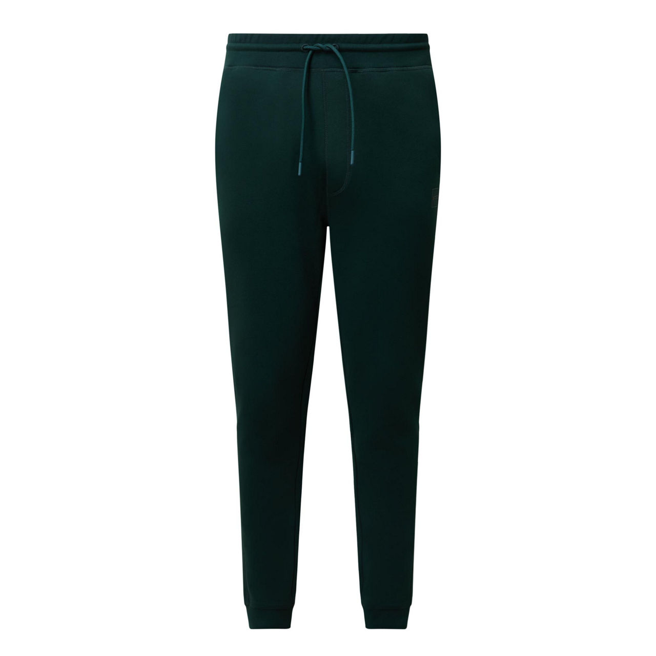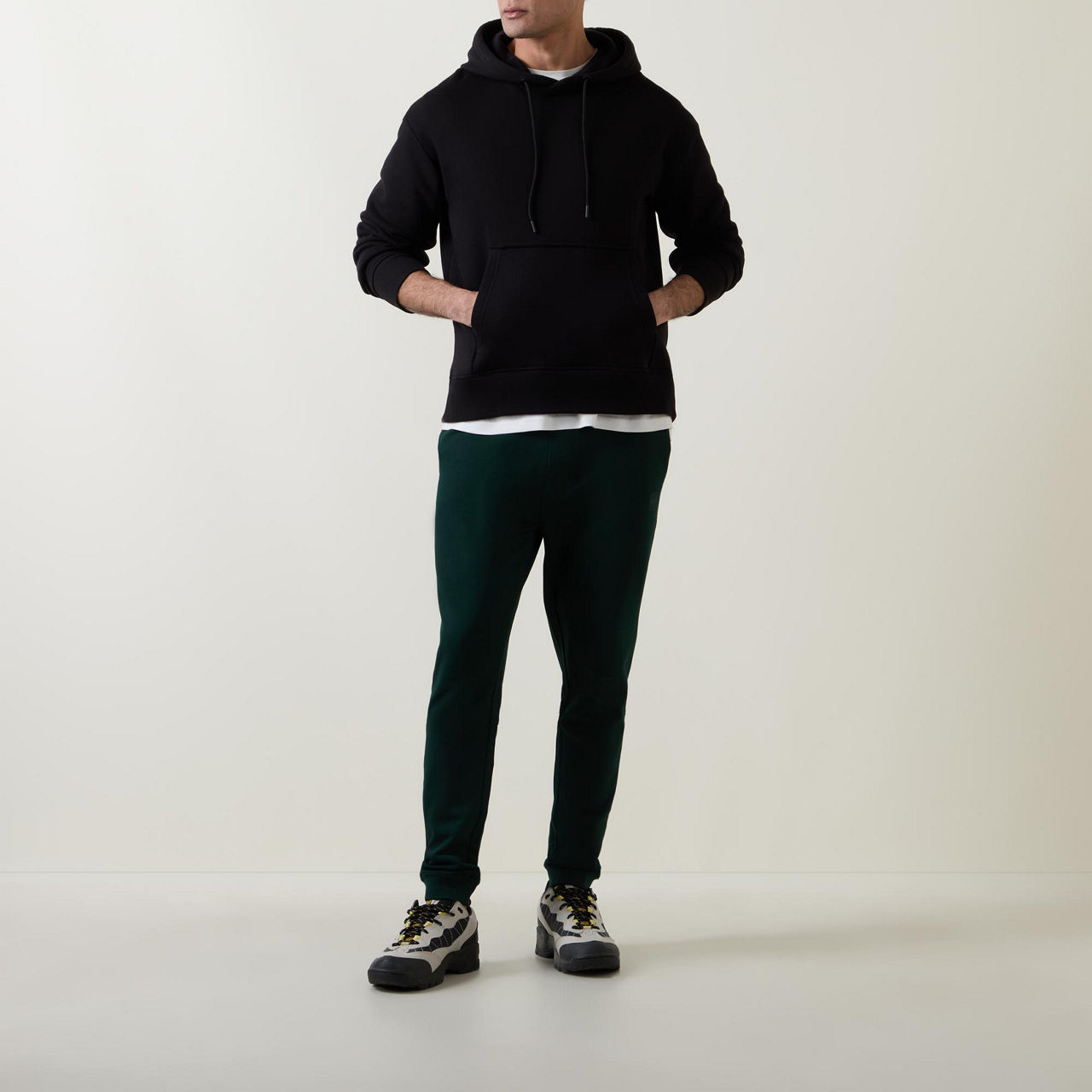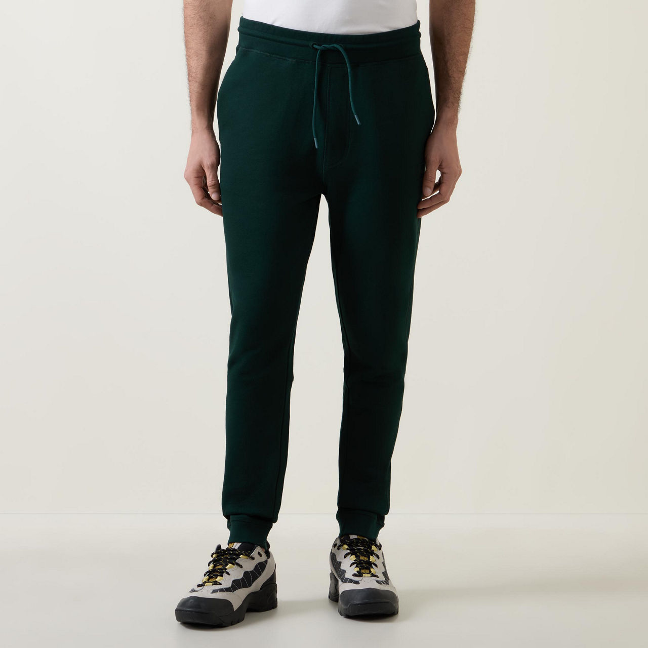 - Mid-rise, slim-leg, elasticated waistband, drawstring fastening, two side slit pockets, one rear welt pocket, tonal logo badge, cuffed ankles, smooth finish