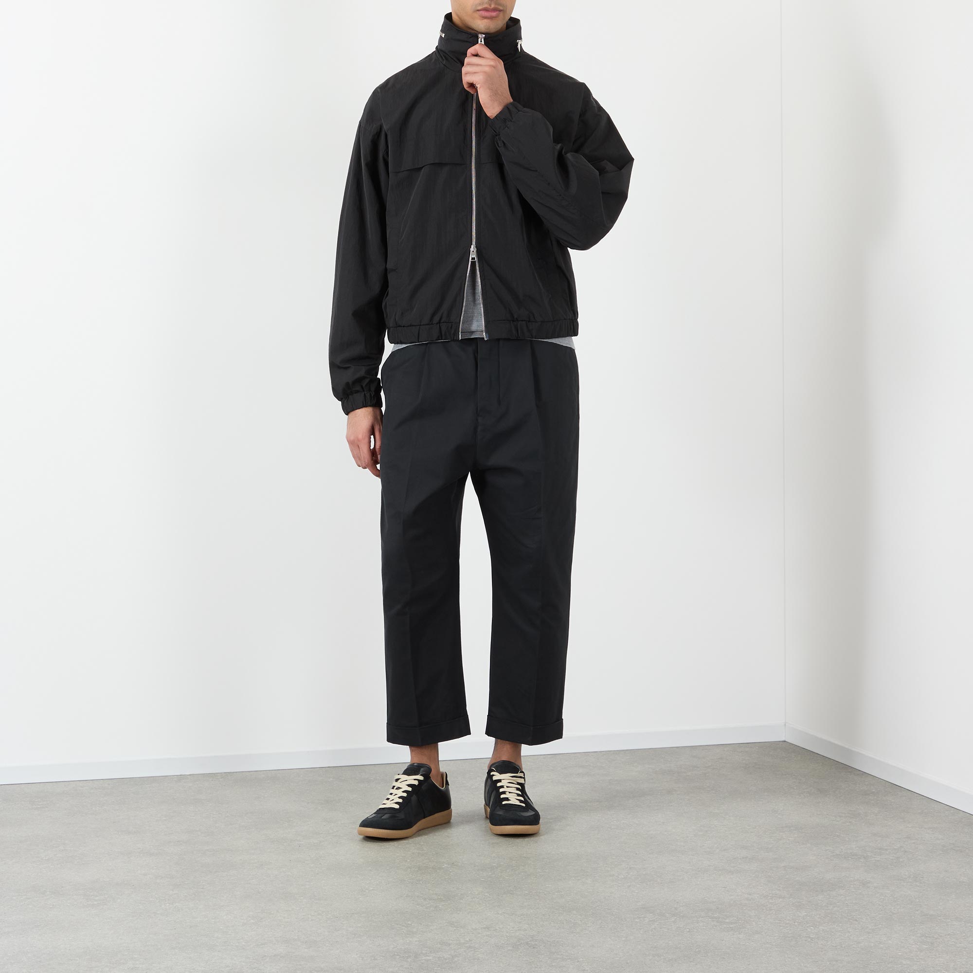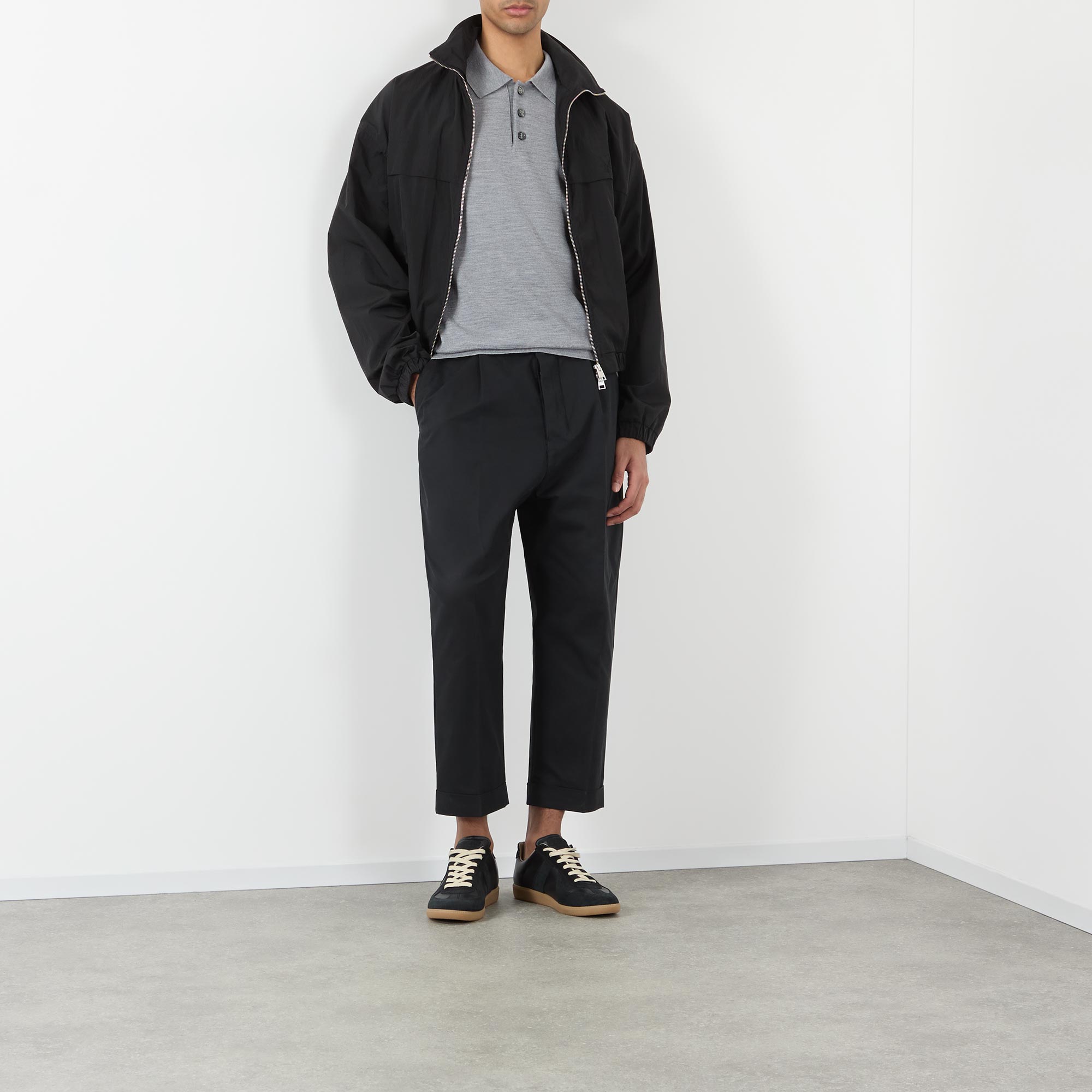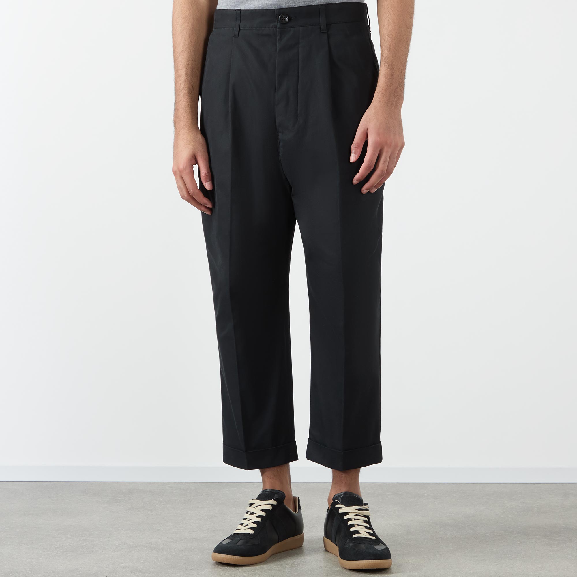 - Button and fly zip fastening, belt loops, side entry pockets, rear pockets, carrot-shape, pleated details, logo badge to the rear, cuffed hems