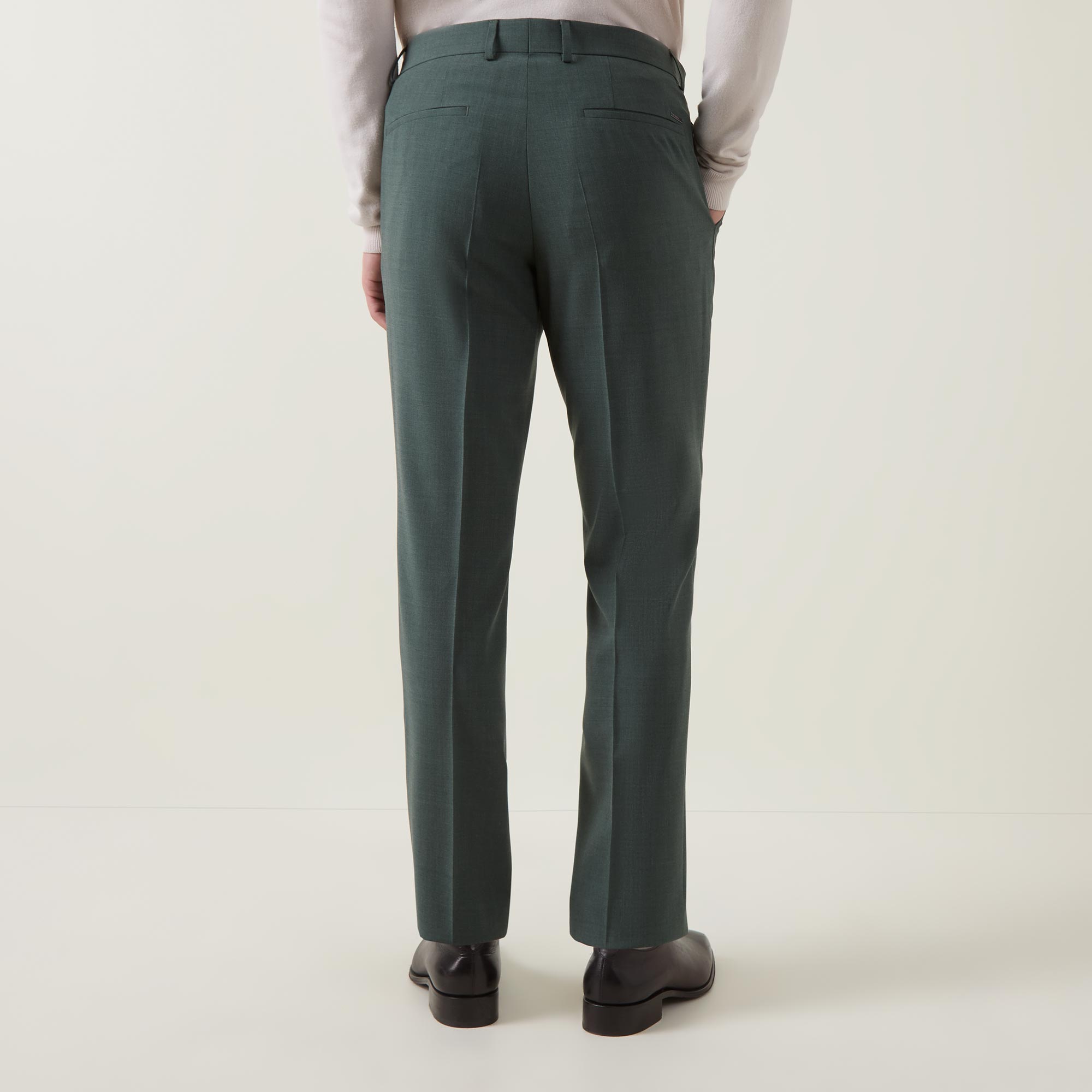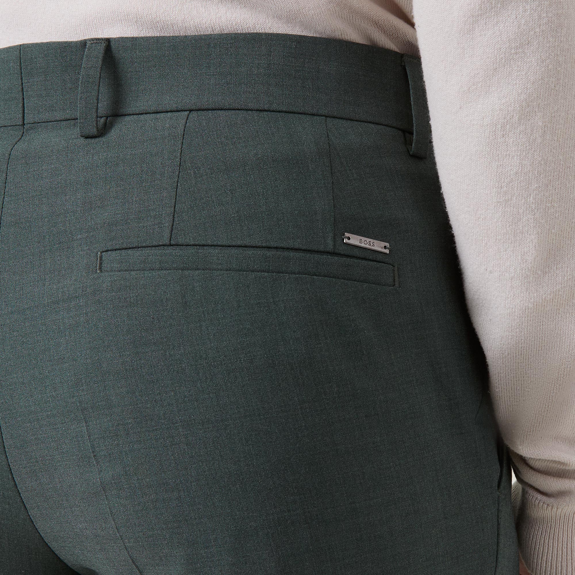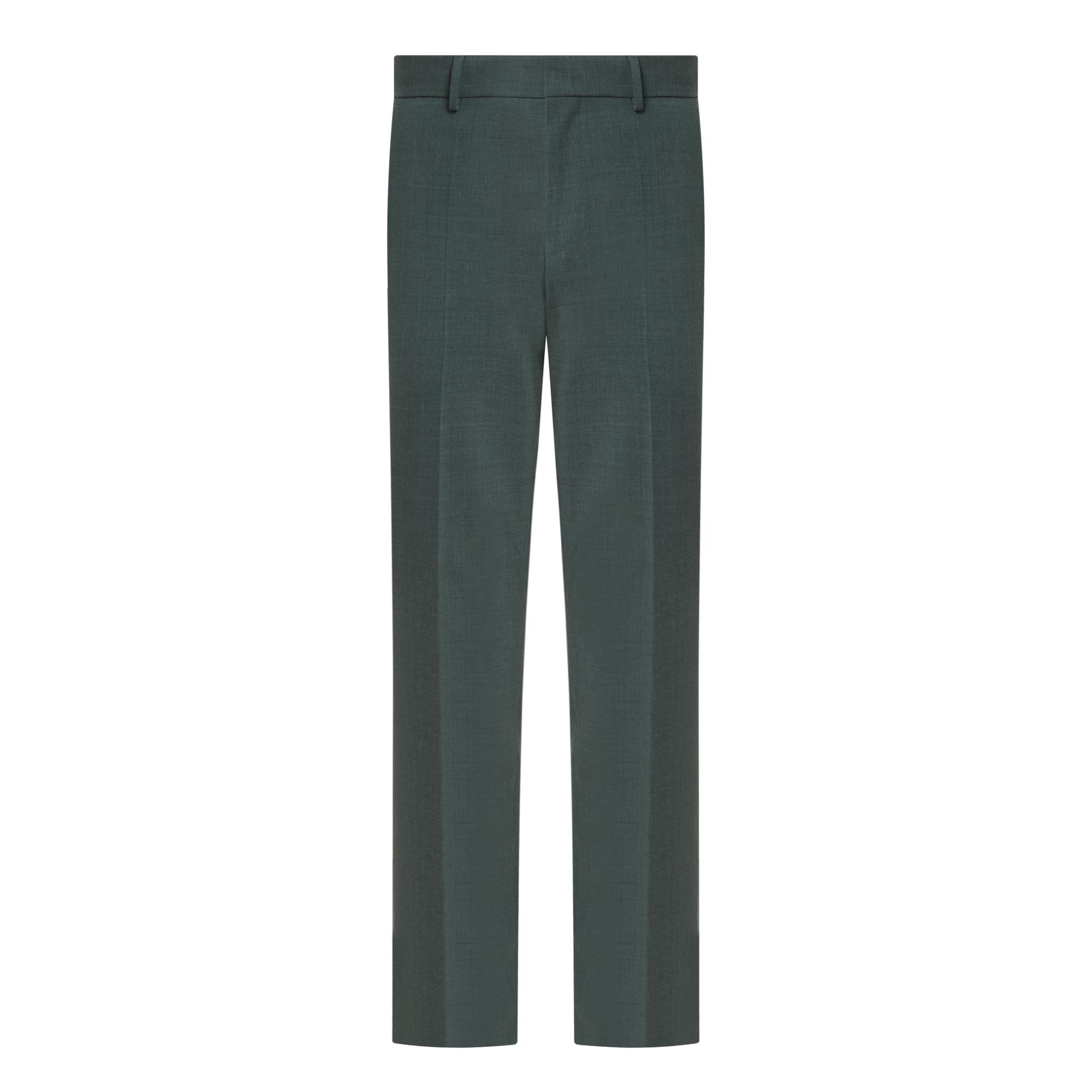 - Mid rise, slim leg, belt loops, concealed fly with hook and bar fastening, two side entry pockets, two rear welt pockets, clean hems, pressed creases, logo detail