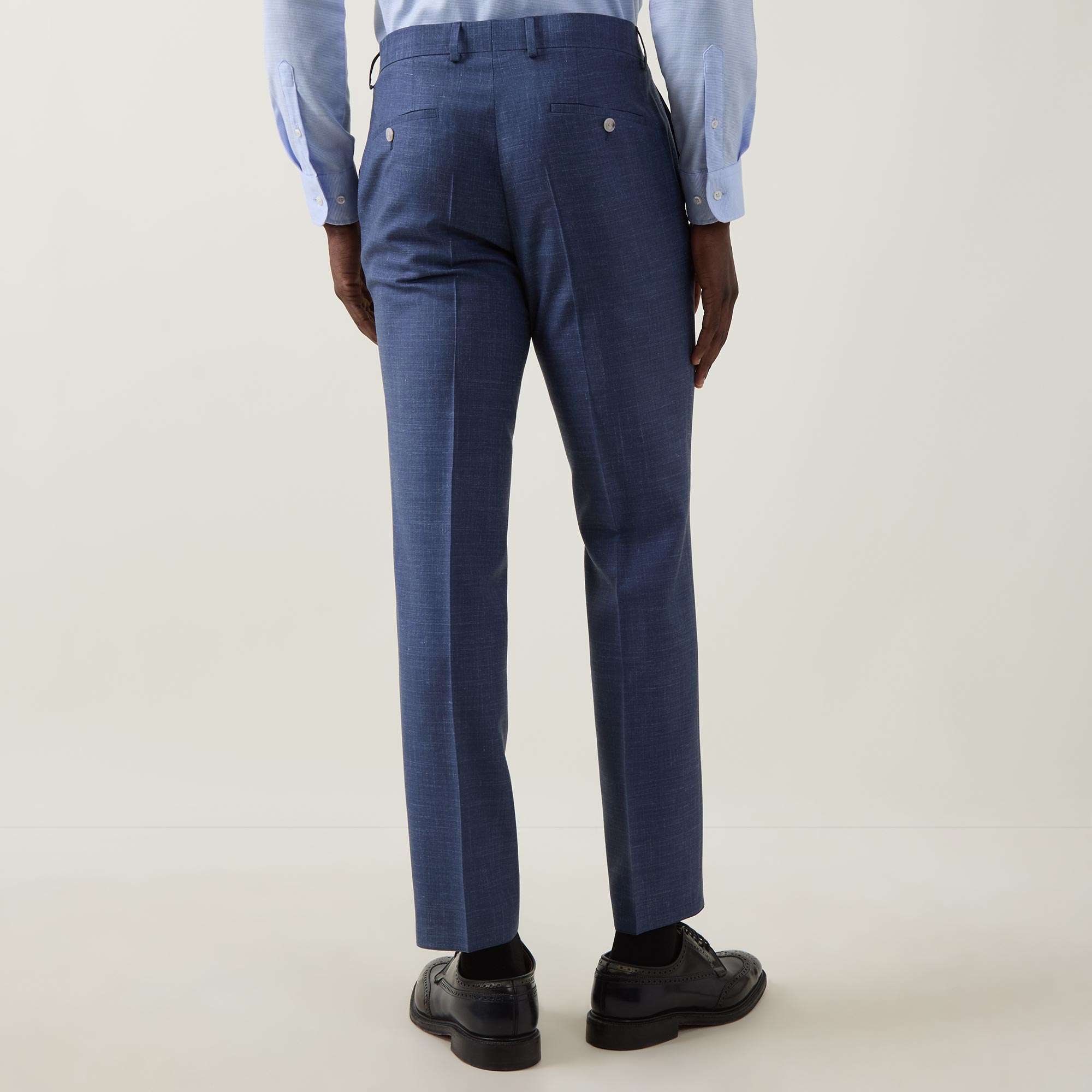 - Buttoned tab and fly zip fastening, belt loops, side entry pockets, rear jet pockets, pressed creases, partially lined, subtle micro pattern