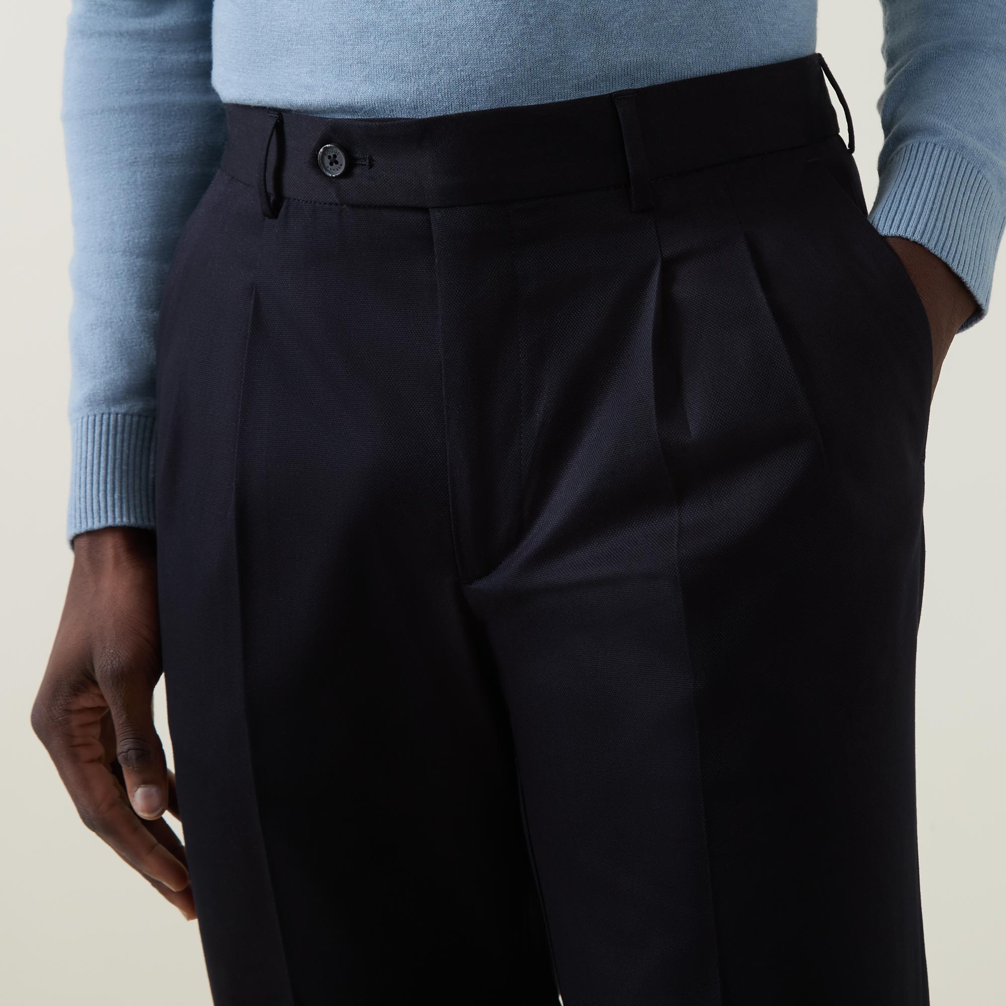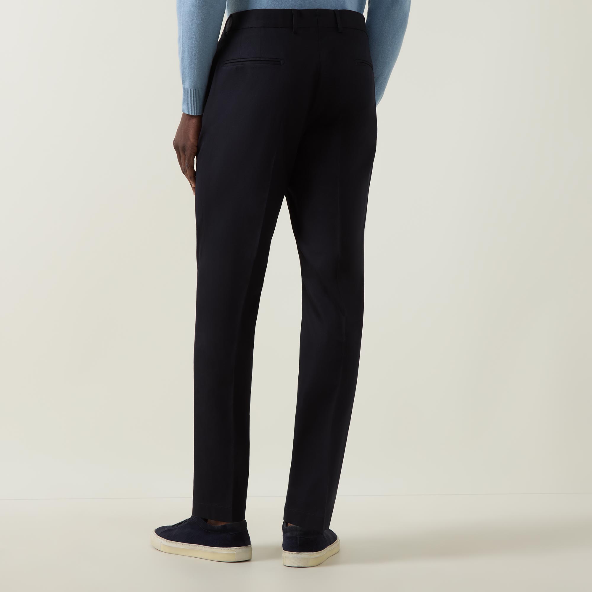 - Zip and button fly, mid-rise, belt loops, two side pockets, darted detail, pressed creases, two rear jet pockets, slim leg