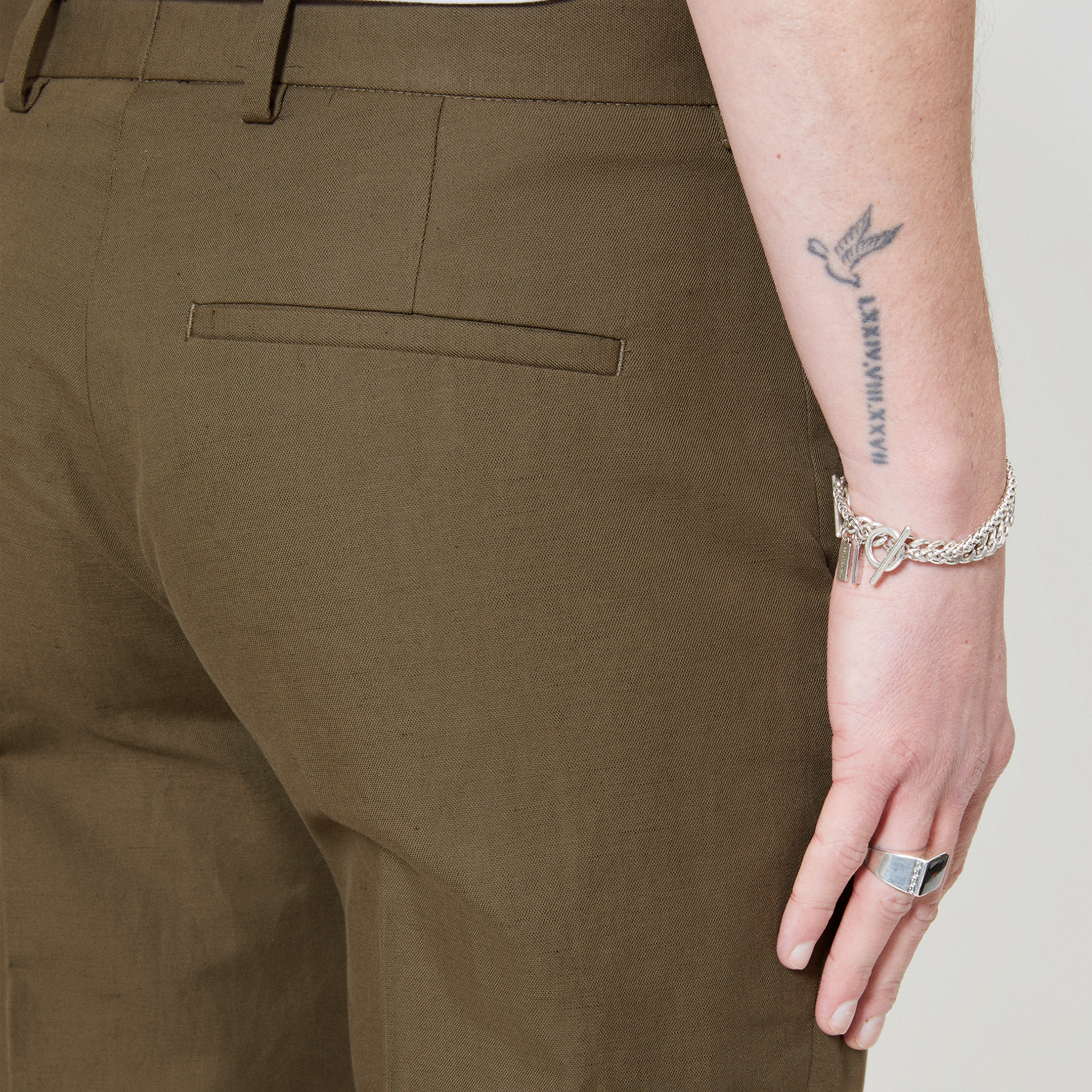 - Medium waistband with belt loops, zip closure with reminder button and staple, stitched Italian side pockets, welt back pockets