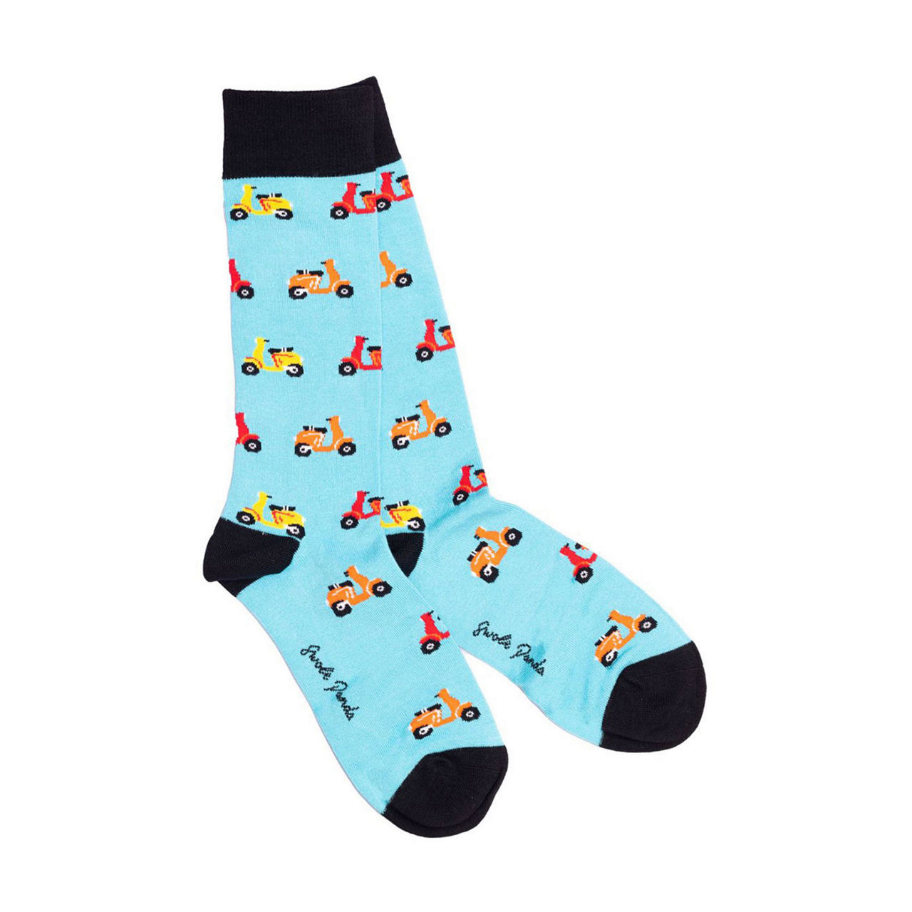 - Crew length, reinforced heel and toe, logo detail, scooter pattern