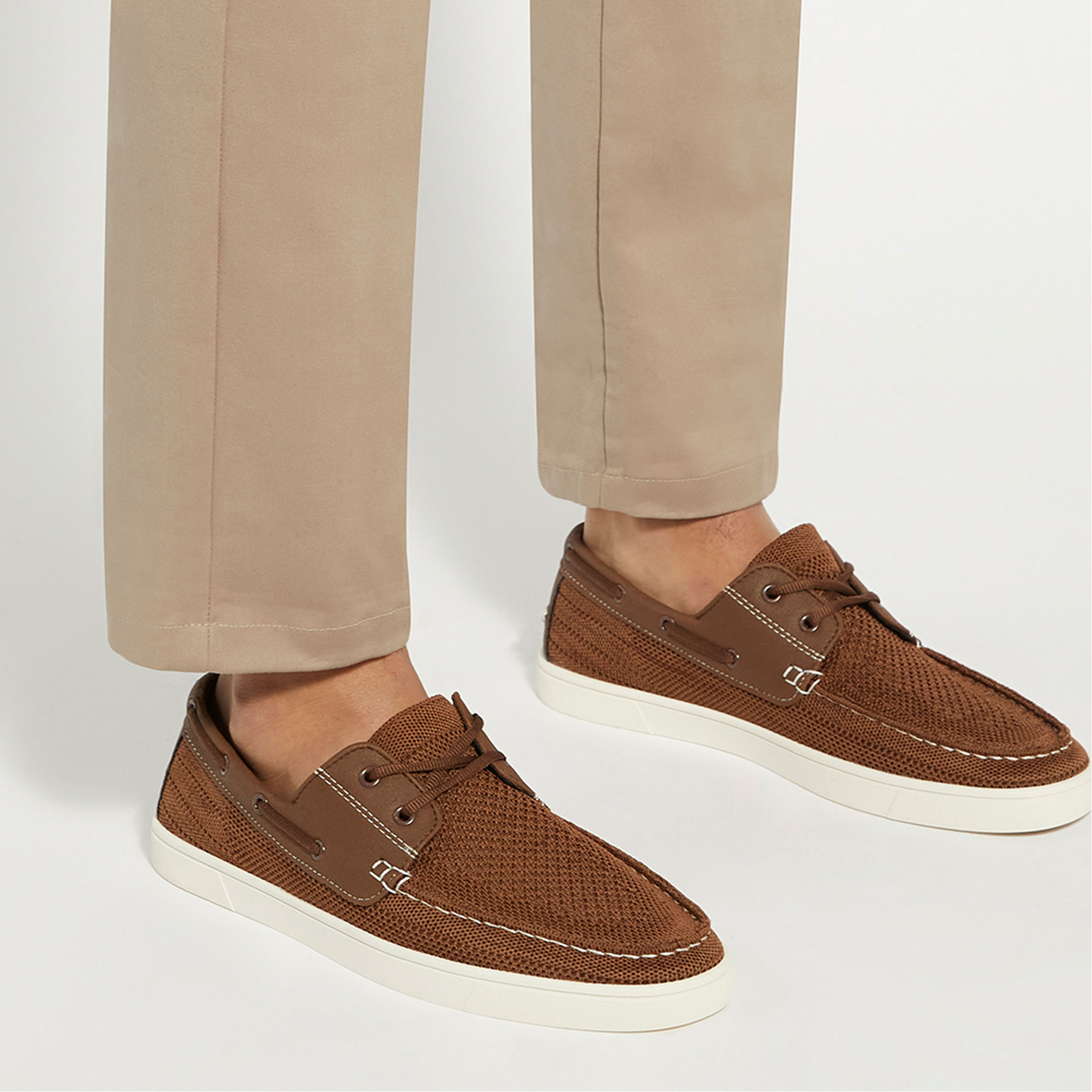- Lightweight knitted finish, deck shoe aesthetic, sporty contrasting cup sole, padded insock, lace-up trim, slip-on style, round toe, contrast stitching, contrast panels