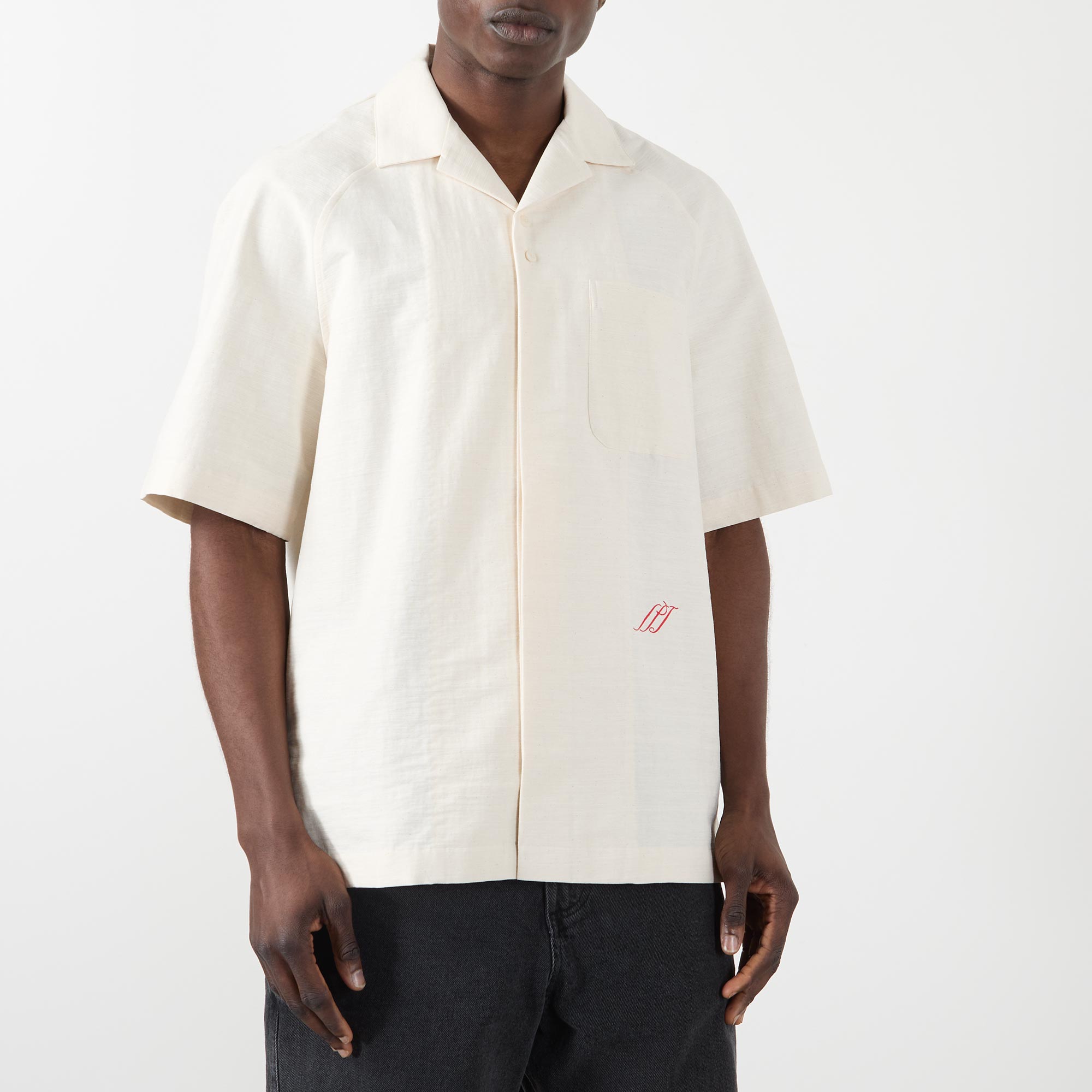 • Camp collar, dropped shoulders, short sleeves, concealed front placket, one chest patch pocket, straight hem, rear logo detailing, 'J' locker loop