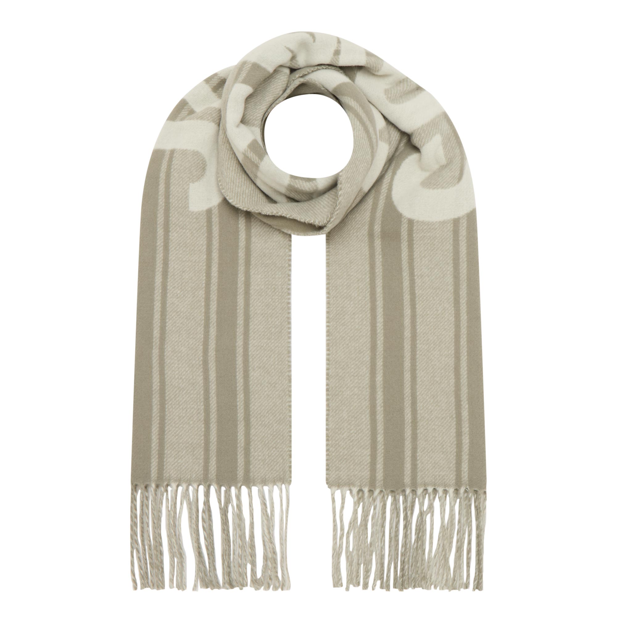• Tonal striped design, logo branding, fringed edges, smooth fabric, wrap style