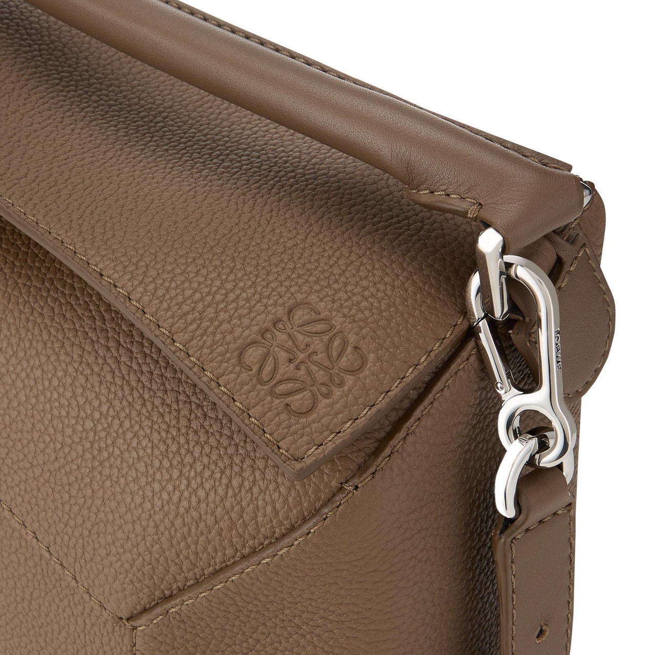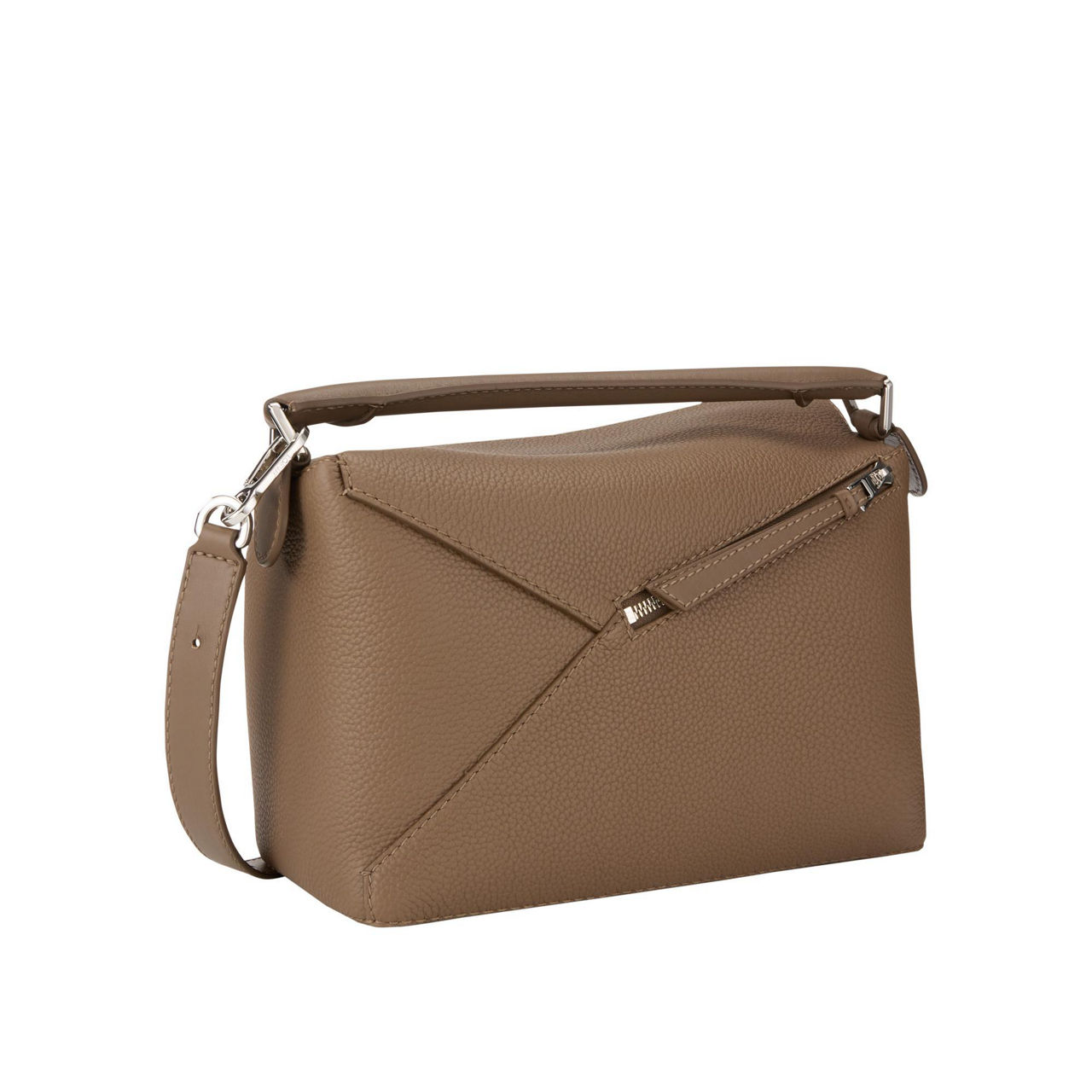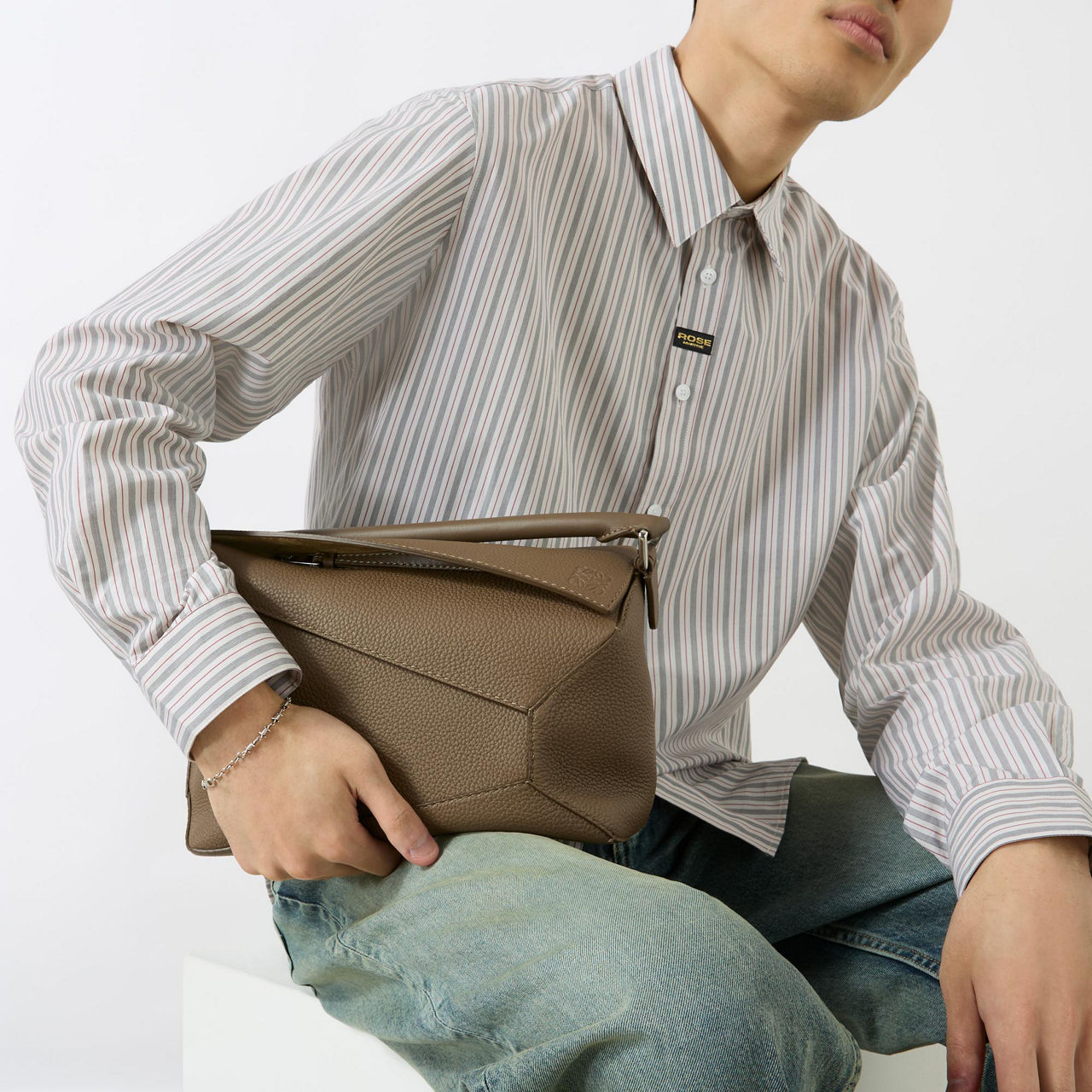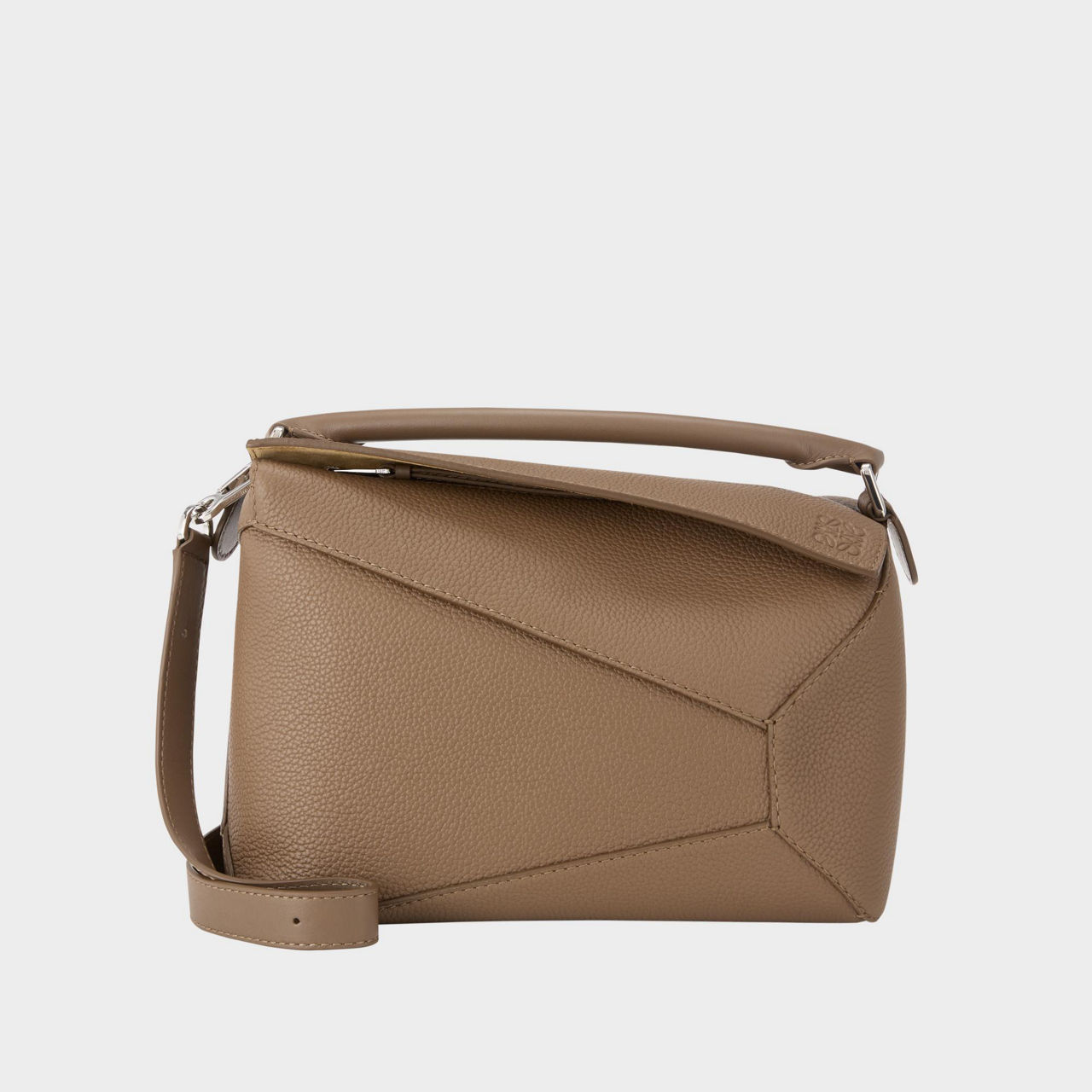 The Puzzle bag from Loewe is instantly recognisable thanks to its unique cuboid shape. Cut from grained leather, it boasts a top carry handle and detachable strap that can be worn over the shoulder or crossbody, finished with an embossed Anagram logo details and distinctive geometric lines.