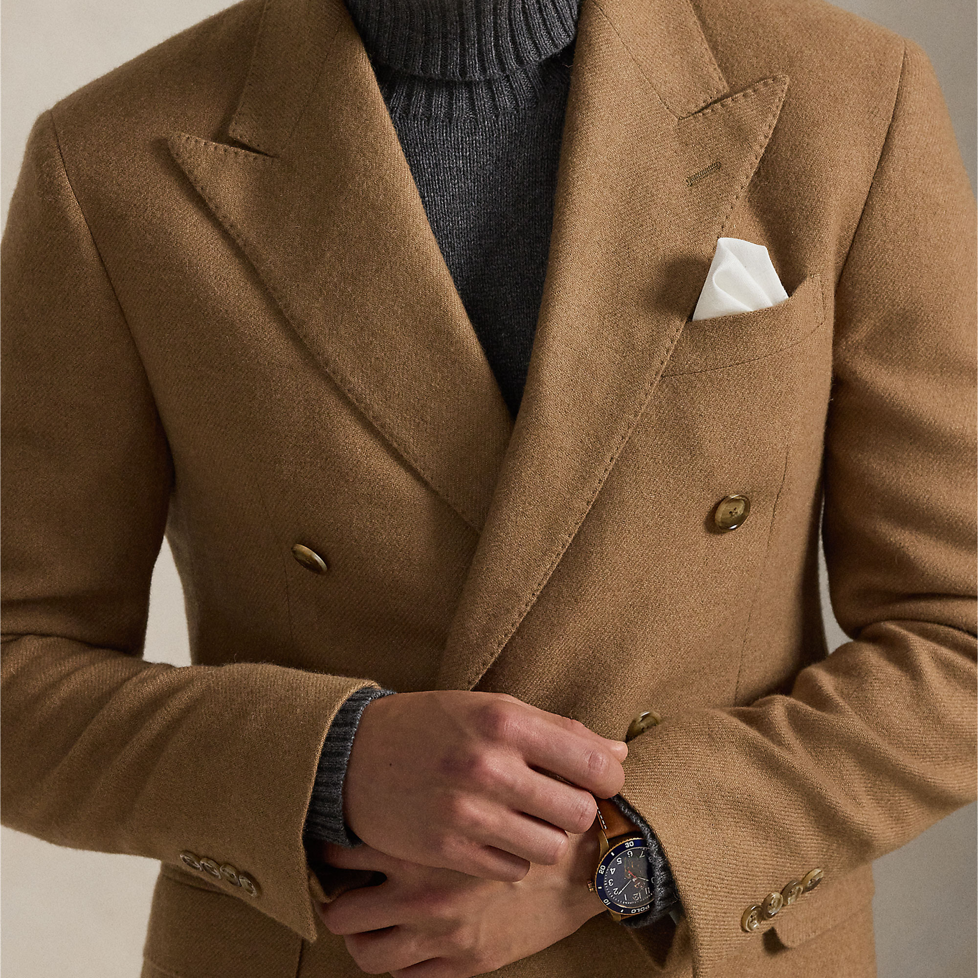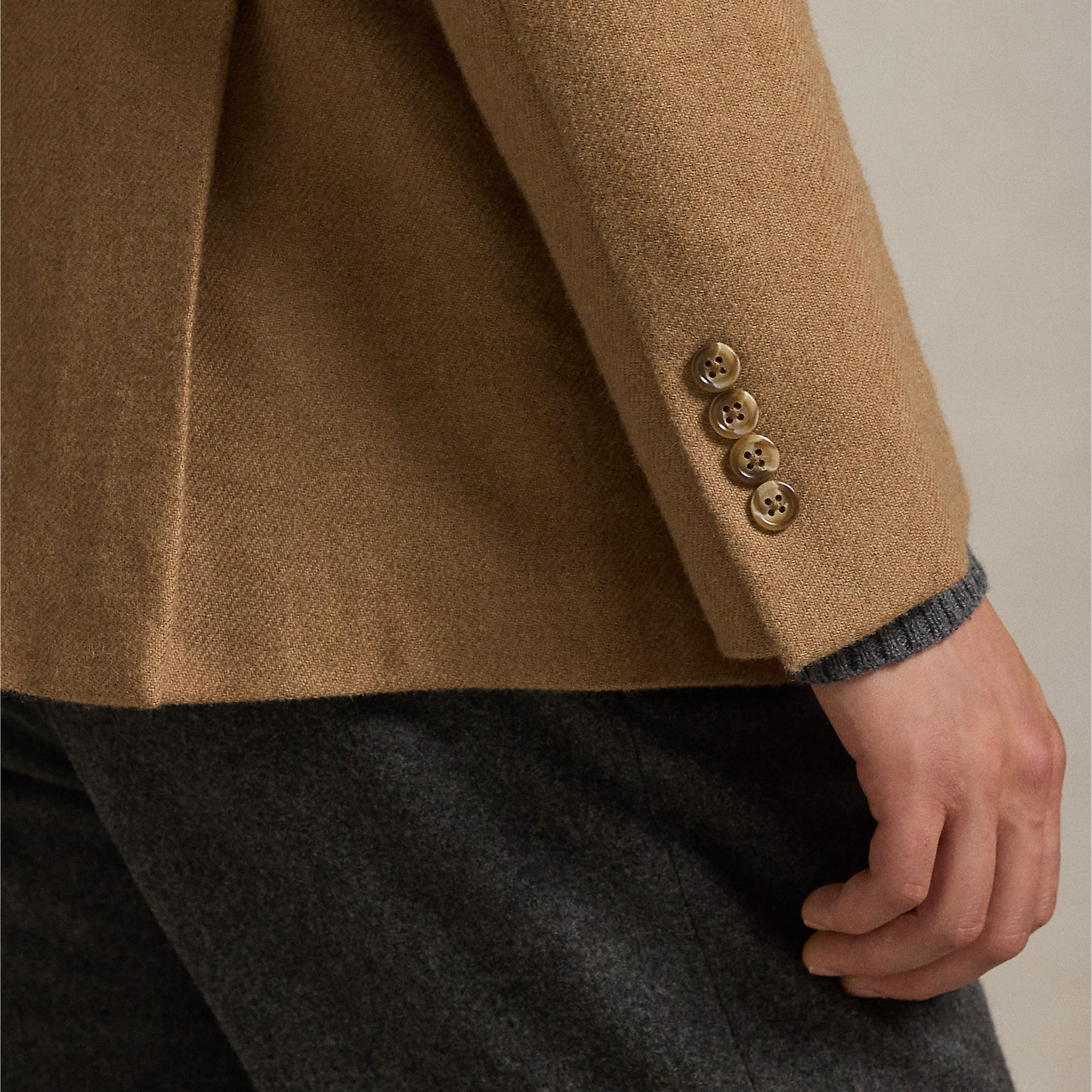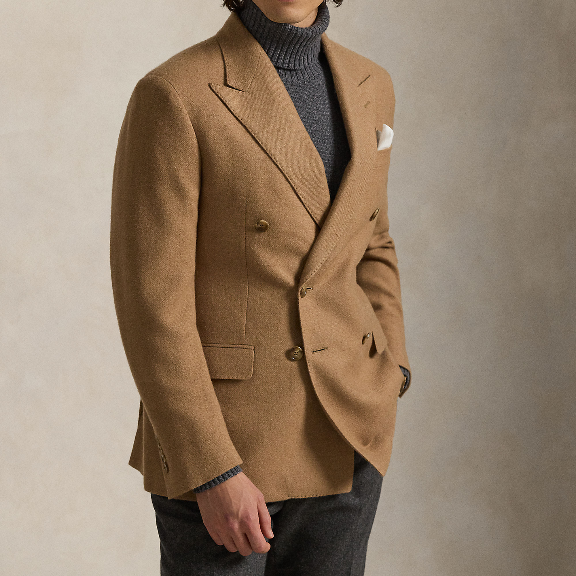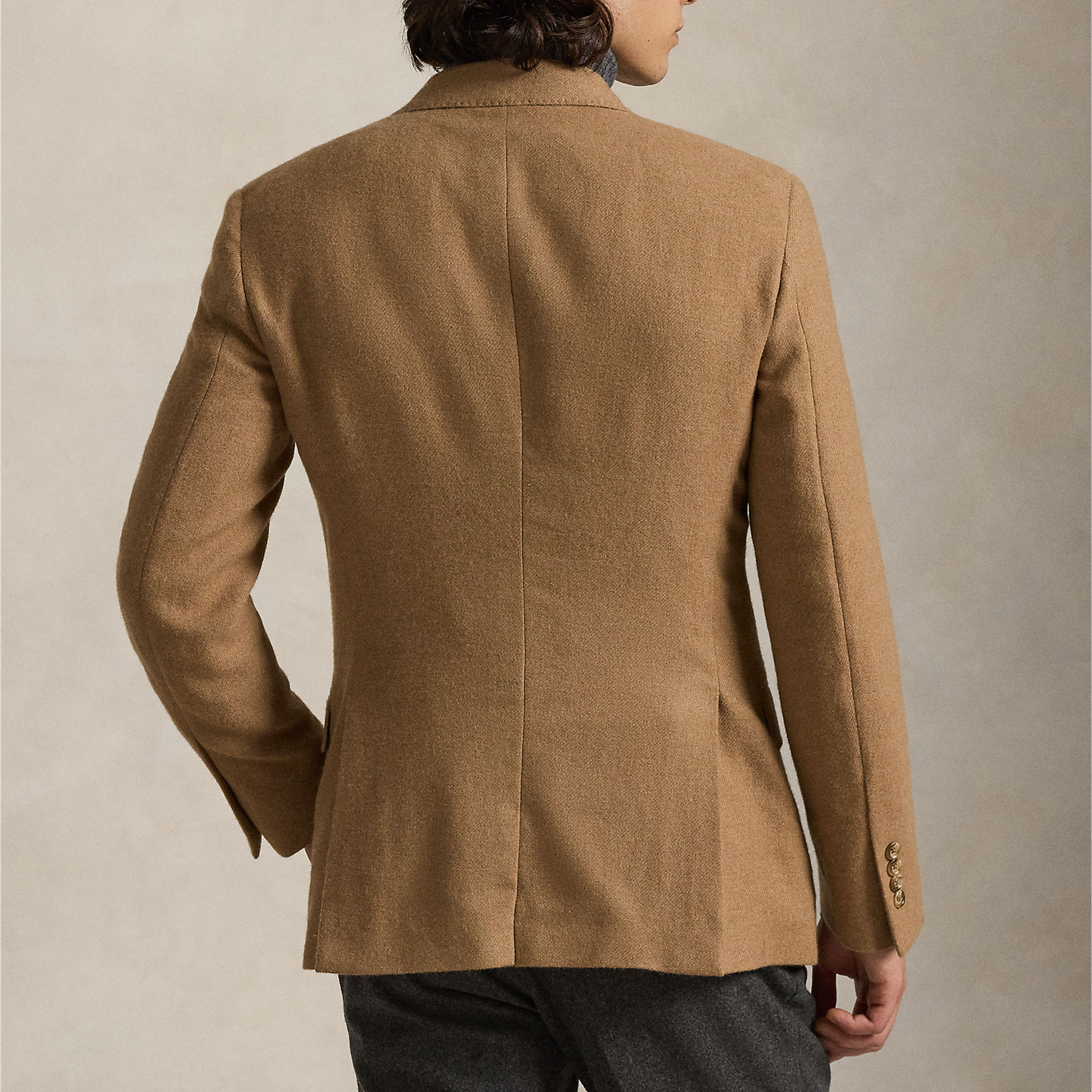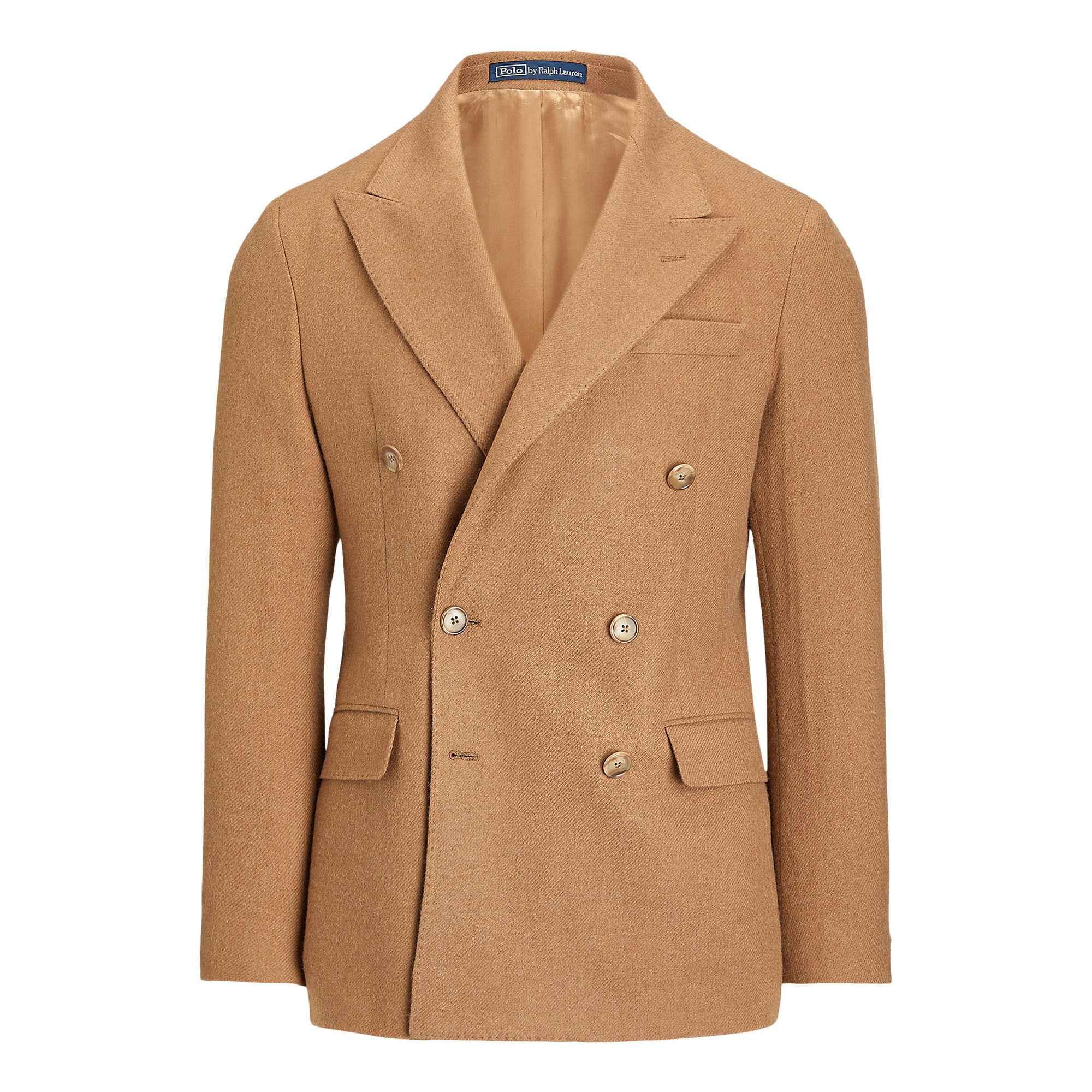 • Structured chest and shoulders, full lining, fine camel hair twill, double-breasted, long sleeves, button fastenings