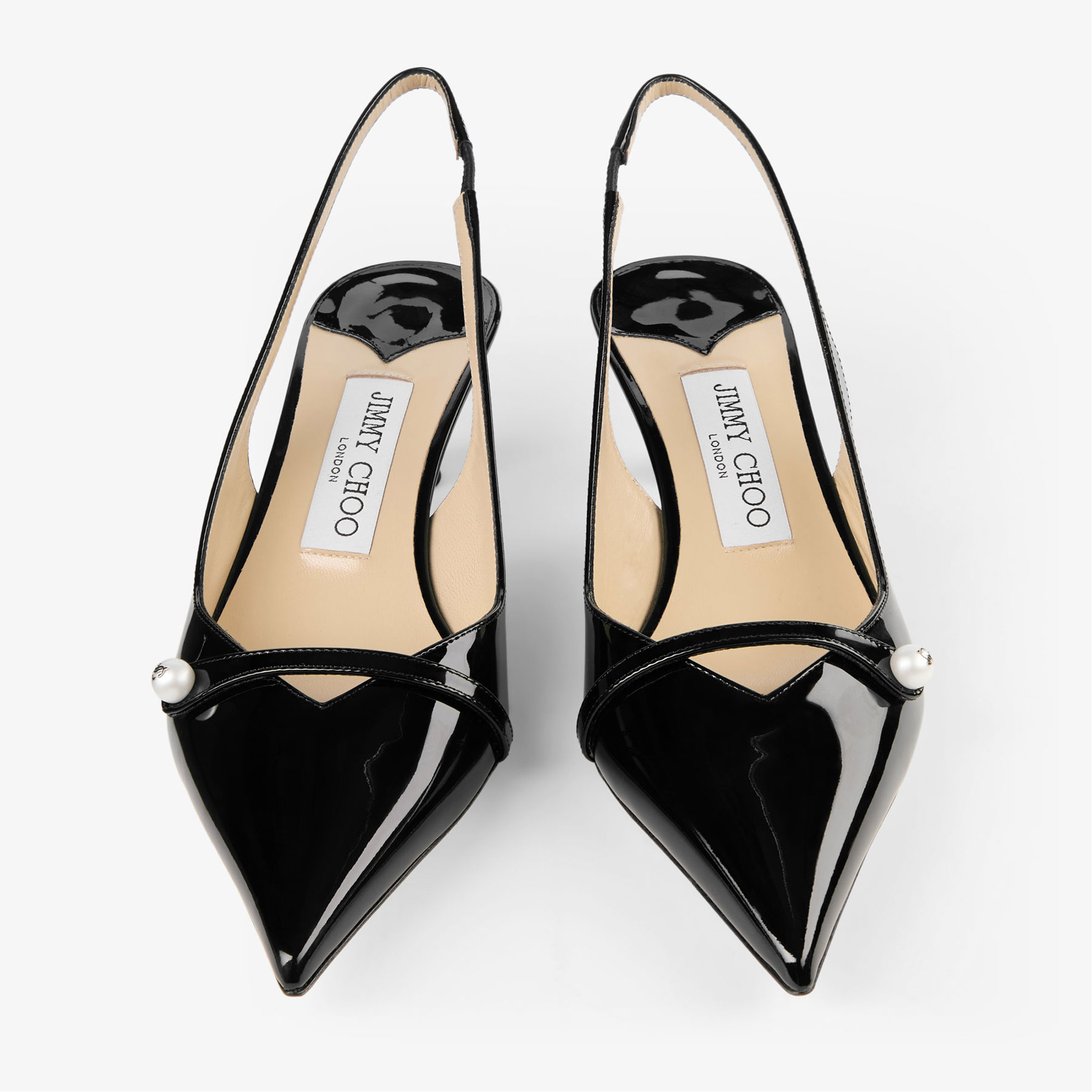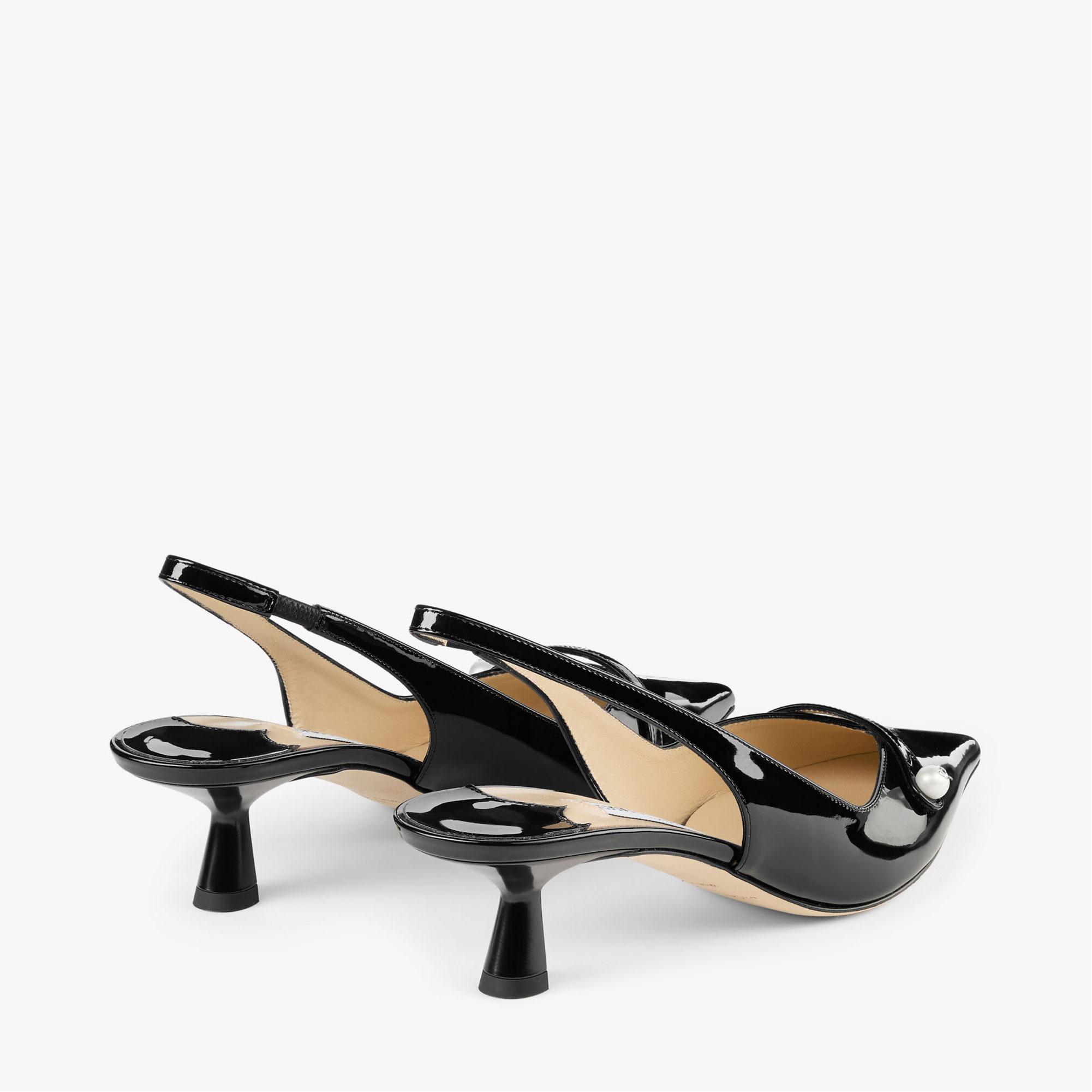 - Patent nappa leather, elasticated slingback strap, pointed toe, leather lining, kick heel, pearl-embellished strap