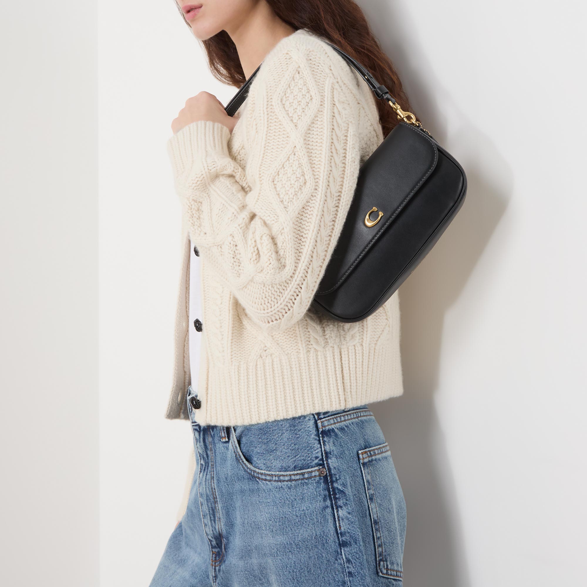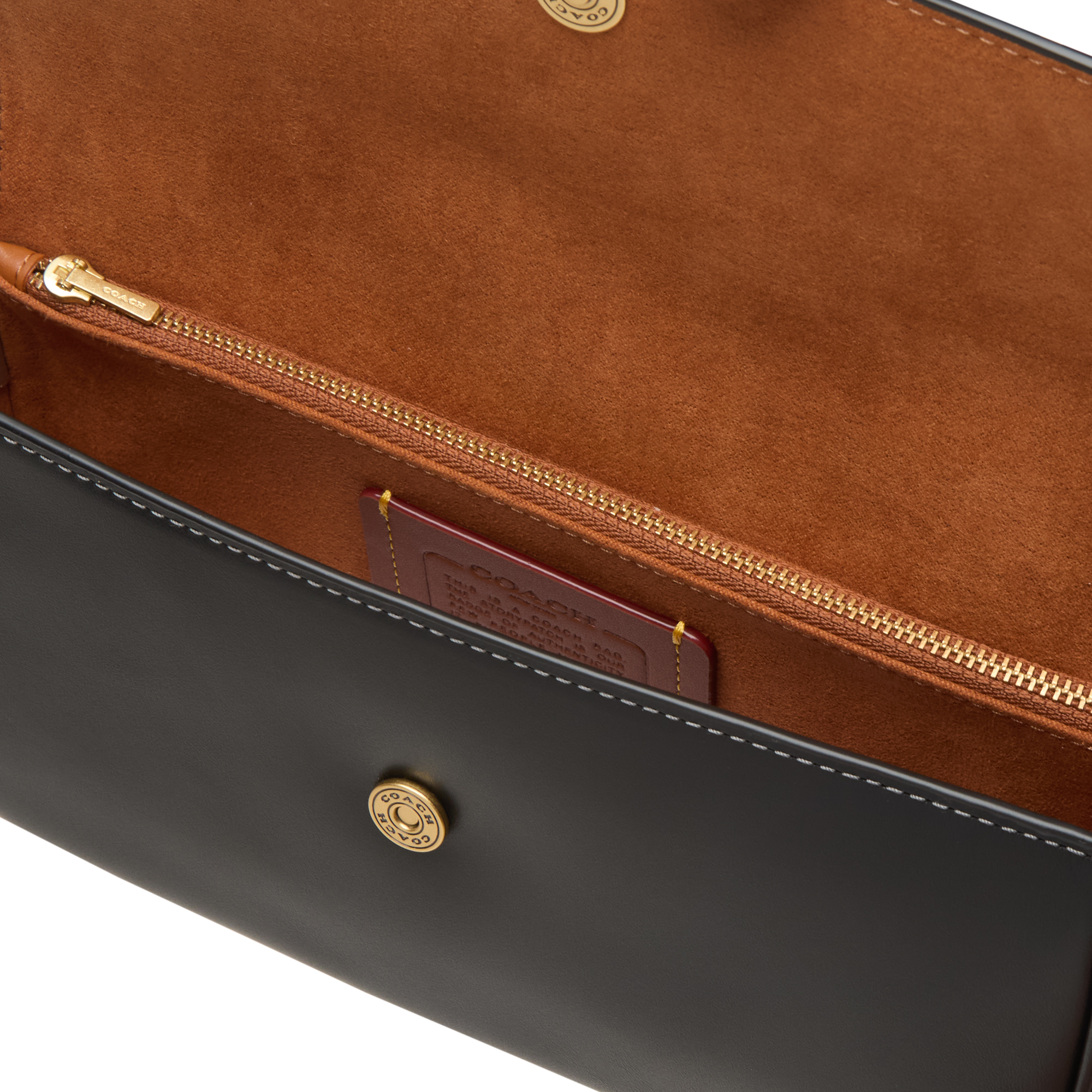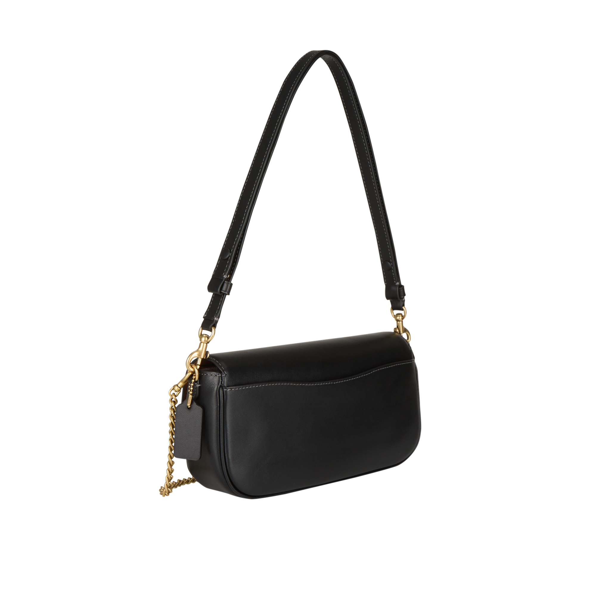 - Foldover flap closure, snap-button fastening, detachable gold-tone chain strap, detachable adjustable leather strap, contrast stitching, front C logo hardware, back slip pocket, attached logo luggage tag, smooth leather finish