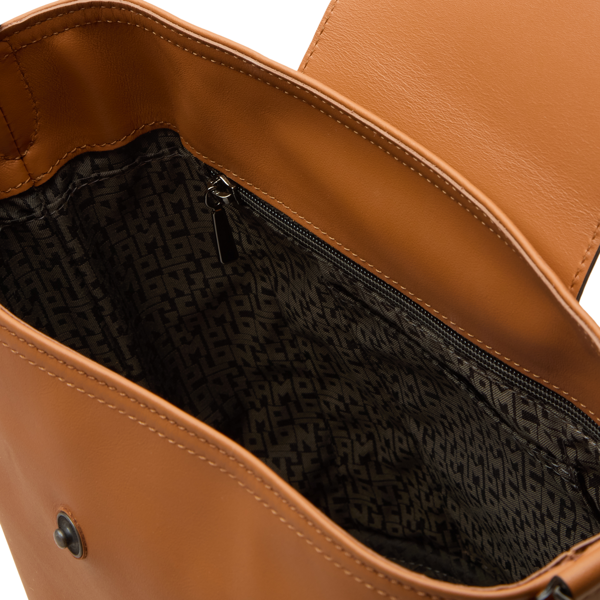 - Top-zip fastening, flap front closure, logo detail, shoulder strap, smooth finish