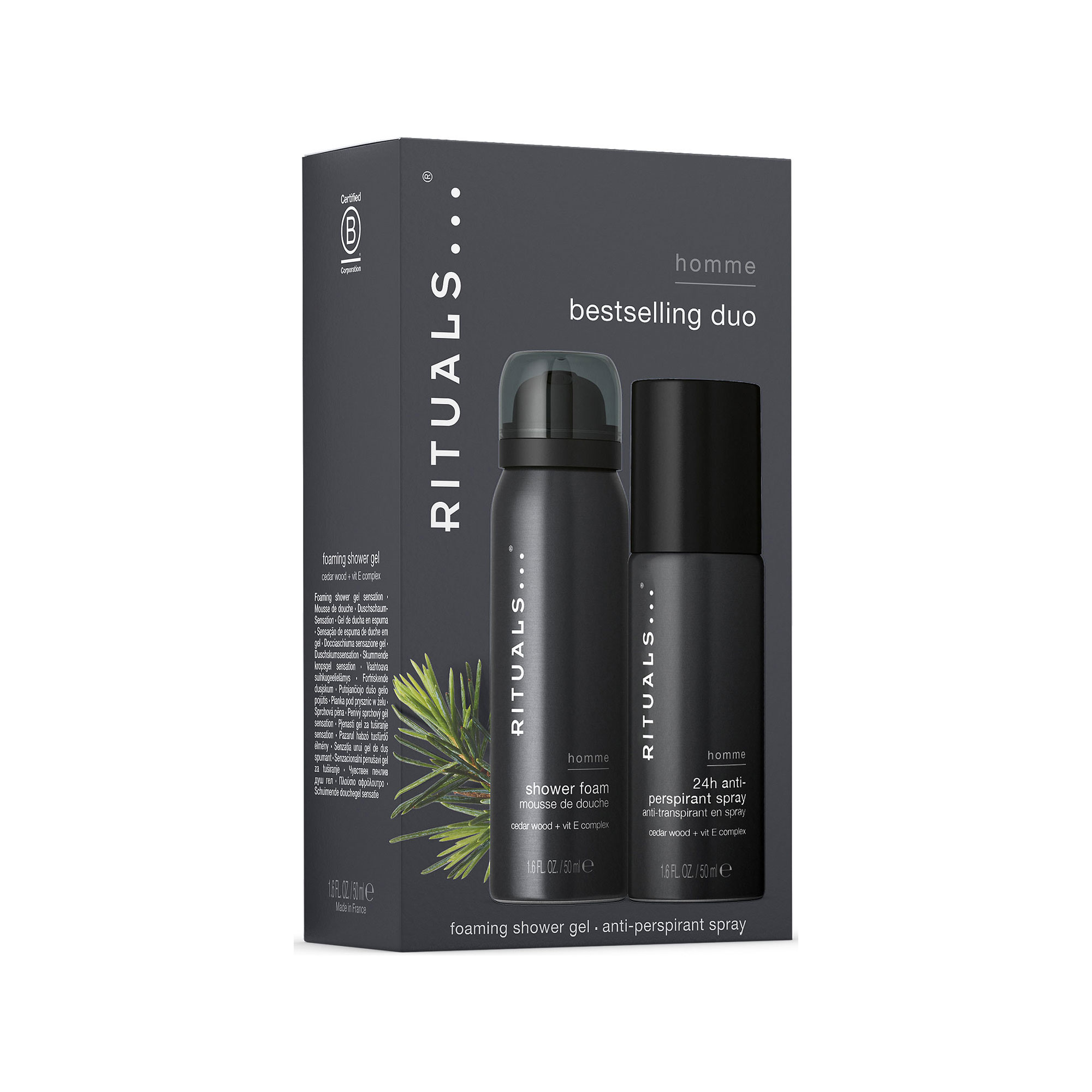 - Rituals Homme shower foam: Aqua/Water, Sodium Coco-Sulfate, Sorbitol, Coco-Glucoside, Isopentane, Caprylyl/Capryl Glucoside, Cocamidopropyl Betaine, Isopropyl Palmitate, Parfum/Fragrance, PEG-120 Methyl Glucose Dioleate, Isobutane, Tocopheryl Acetate, Juniperus Virginiana (Cedar) Wood Extract, Tocopherol, Citric Acid, Sodium Benzoate, Sodium Chloride, Glycerin, Guar Hydroxypropyltrimonium Chloride, Citronellol, Limonene, Coumarin.Rituals Homme 24h Anti-Perspirant Spray: Butane, Propane, Aluminum Chlorohydrate, Isopropyl Palmitate, Isobutane, Dicaprylyl Ether, C12-15 Alkyl Benzoate, Parfum/Fragrance, Octyldodecanol, Cedrus Libani Bark Extract, Tocopheryl Acetate, Ethylhexylglycerin, Tocopherol, Disteardimonium Hectorite, Propylene Carbonate, Aqua/Water, Caprylic/Capric Triglyceride, Citral, Citronellol, Coumarin, Linalool, Limonene.
