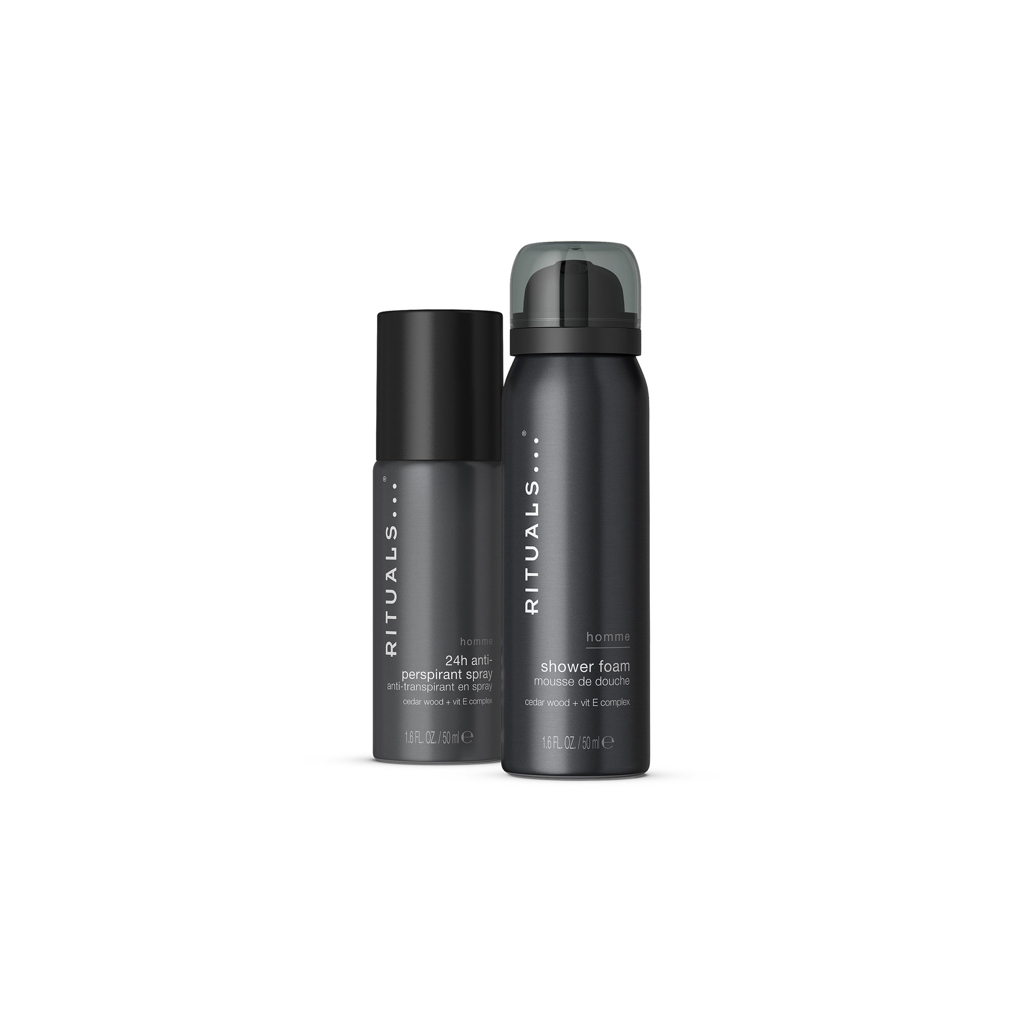 - Rituals Homme Shower Foam 50ml WARNING. Pressurized container: May burst if heated. Do not spray in eyes. IF IN EYES: Rinse cautiously with water for several minutes. Keep away from heat, hot surfaces, sparks, open flames and other ignition sources. No smoking. Do not pierce or burn, even after use. Protect from sunlight. Do not expose to temperatures above 50°C/122°F. Contains 4% by mass of flammable ingredients. Keep out of reach of children.Rituals Homme 24h Anti-Perspirant Spray 50ml DANGER. Extremely flammable aerosol. Pressurized container: May burst if heated. Keep away from heat, hot surfaces, sparks, open flames and other ignition sources. No smoking. Do not spray on an open flame or other ignition source. Do not pierce or burn, even after use. Protect from sunlight. Do not expose to temperatures above 50°C/122°F. °C/122°F. Keep out of reach of children. Do not apply to irritated or damaged skin.