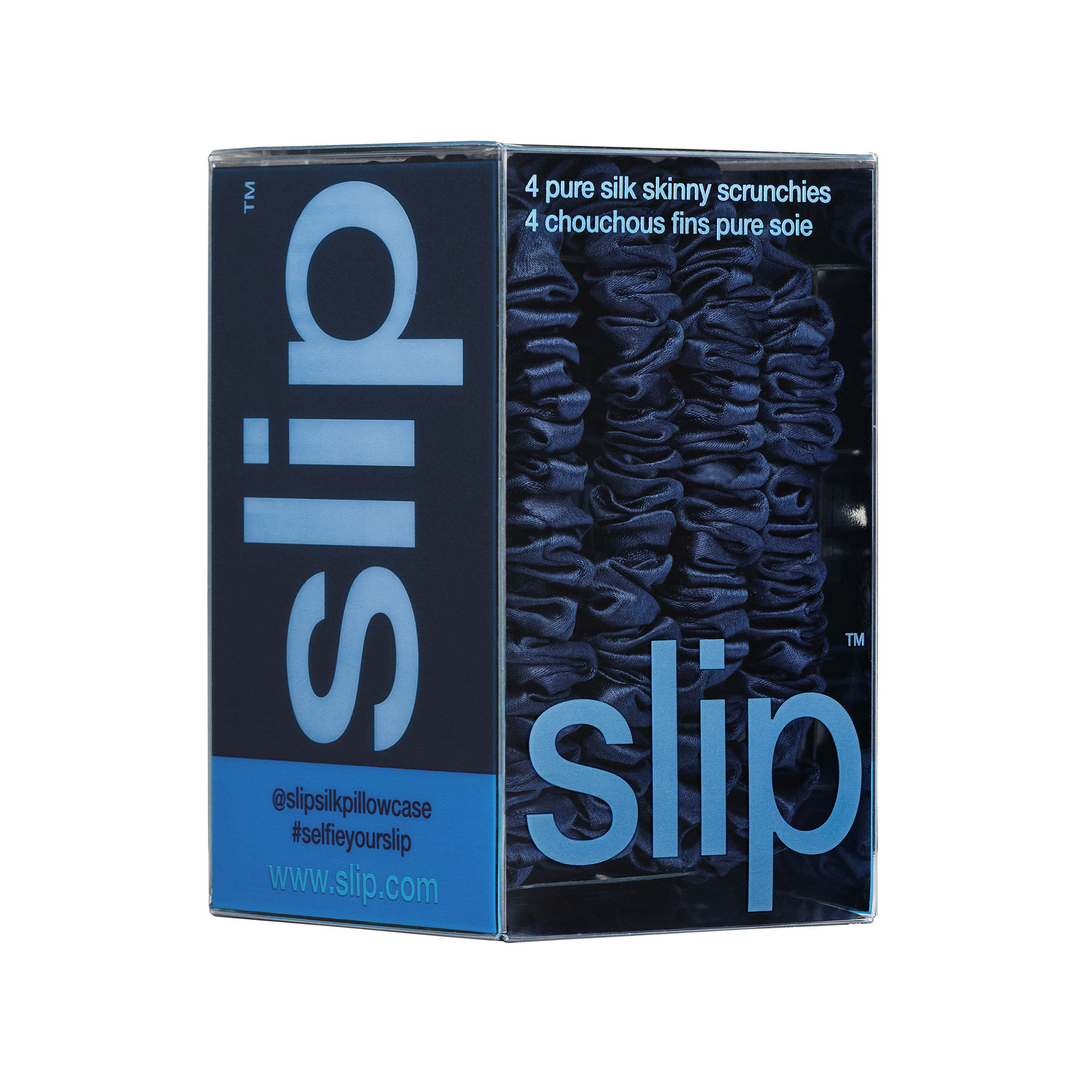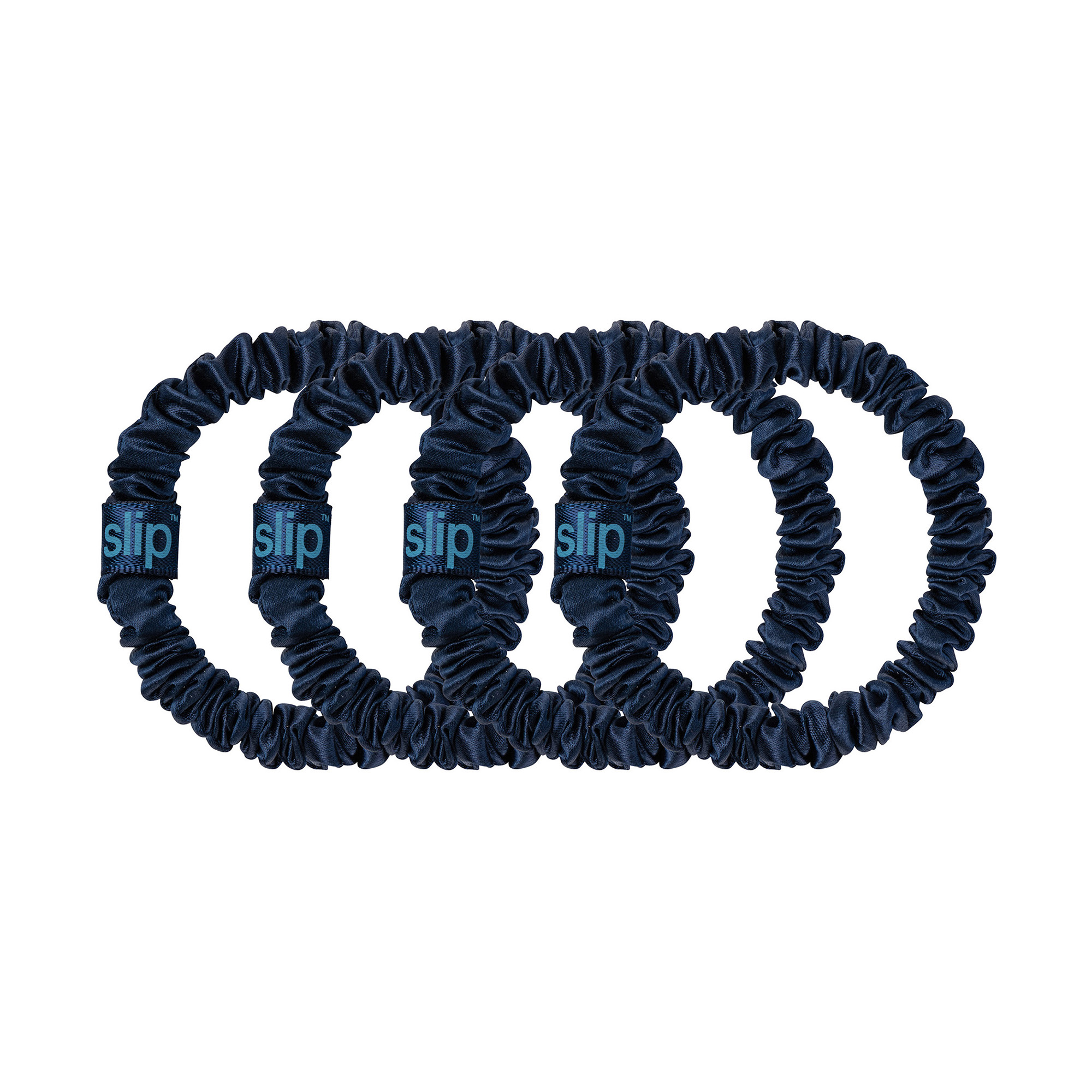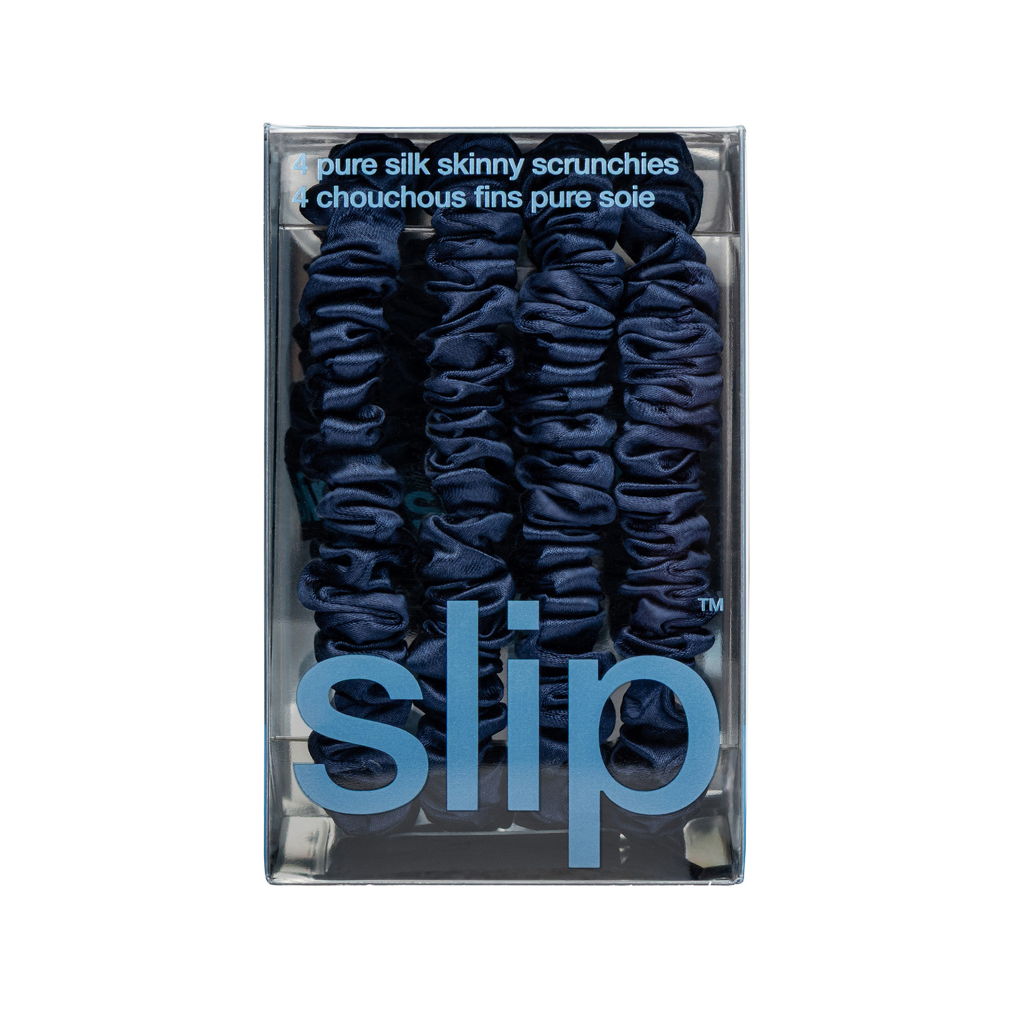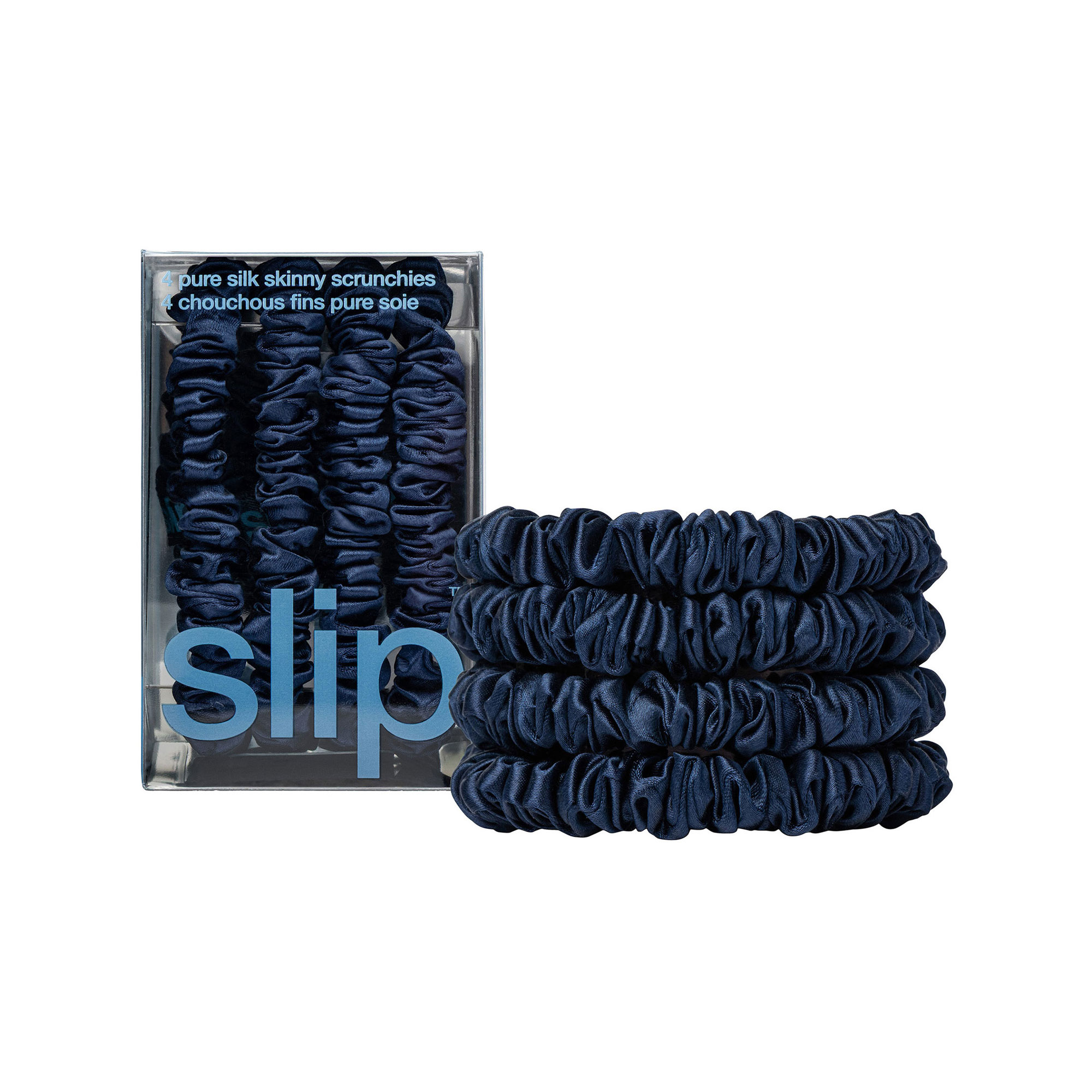 • Contains 4 navy pure silk skinny scrunchies