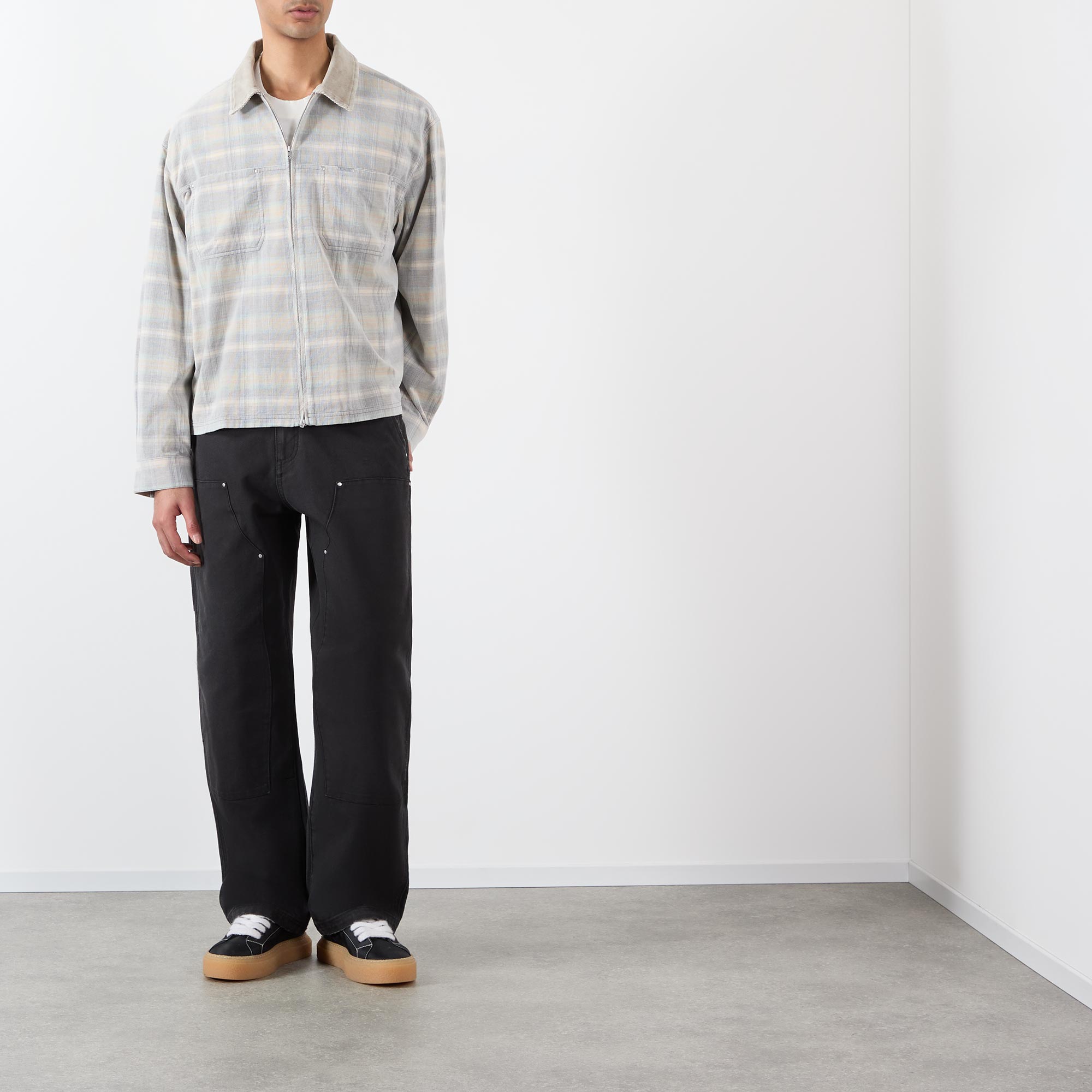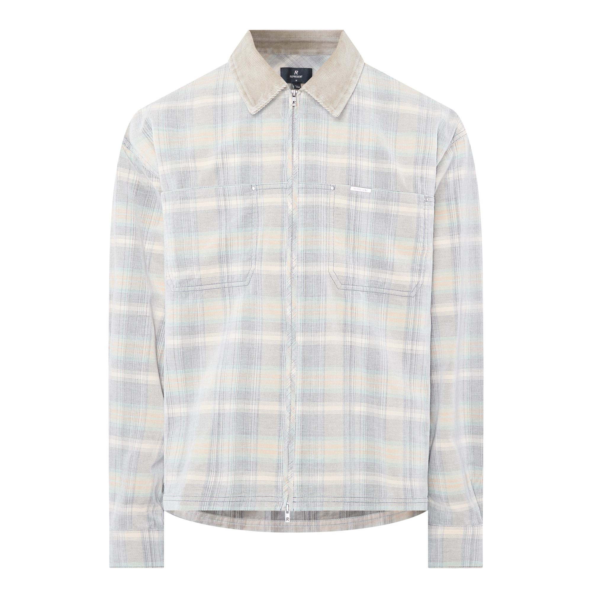 - Corduroy point collar, dropped shoulders, long sleeves, buttoned cuffs, two-way front zip closure, two chest patch pockets, straight hem, logo detail, check print, flannel finish