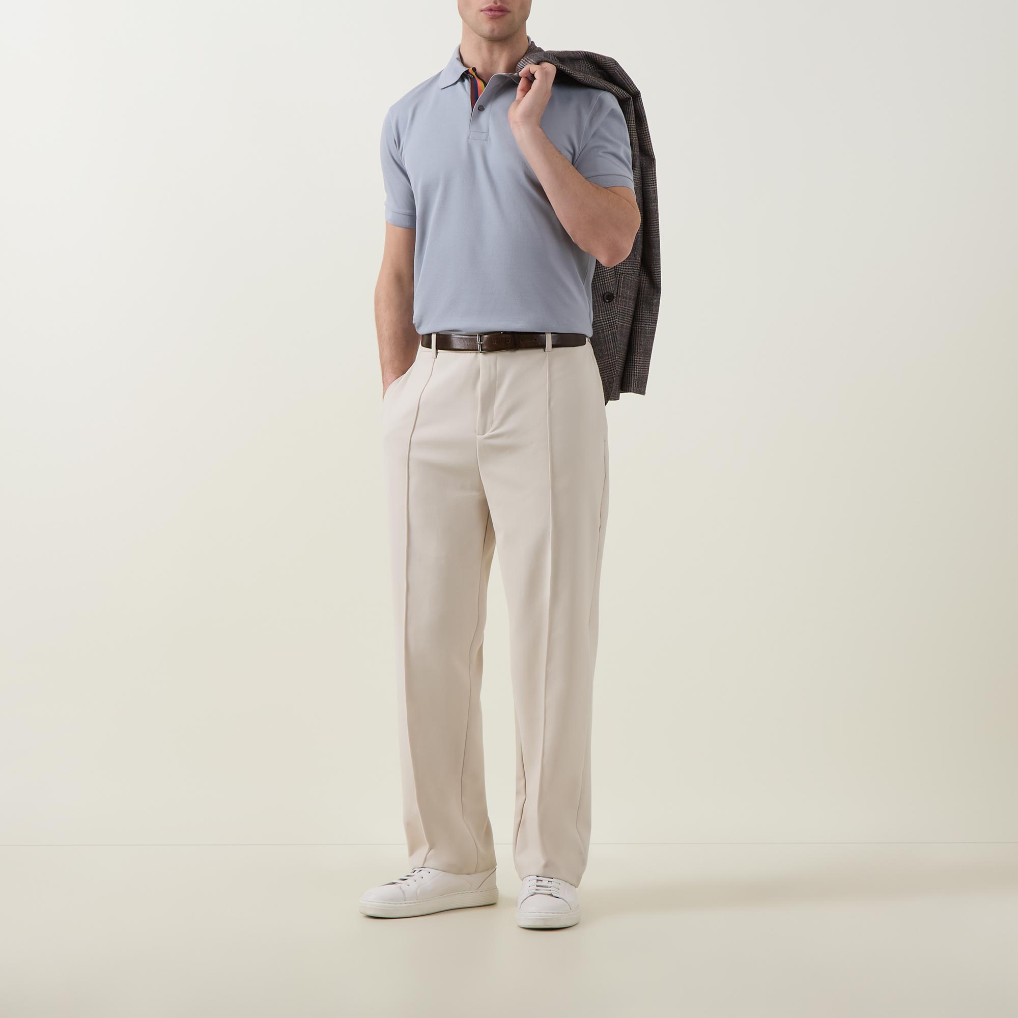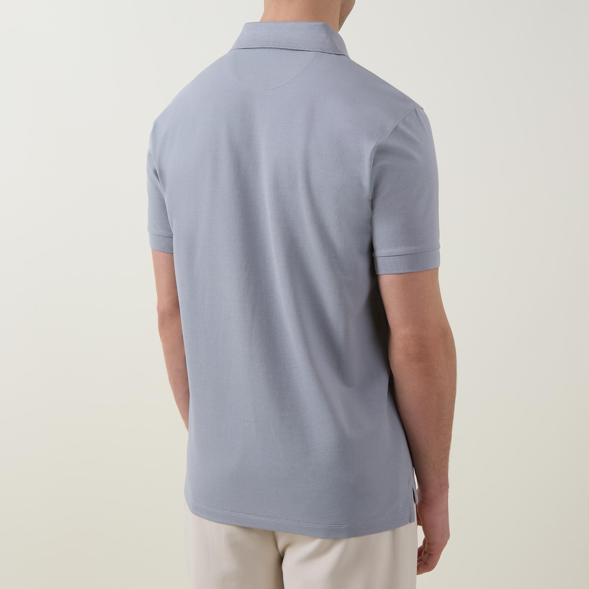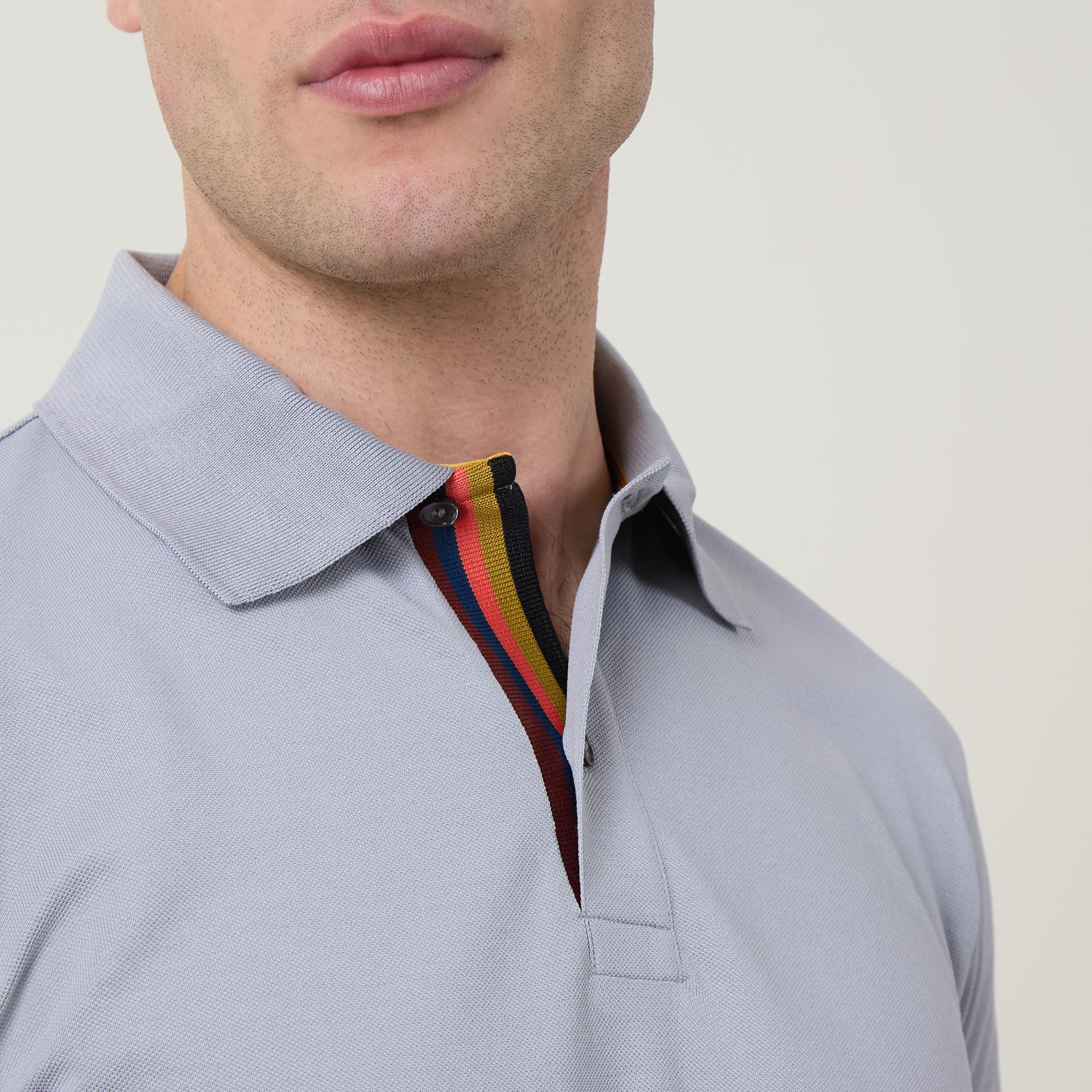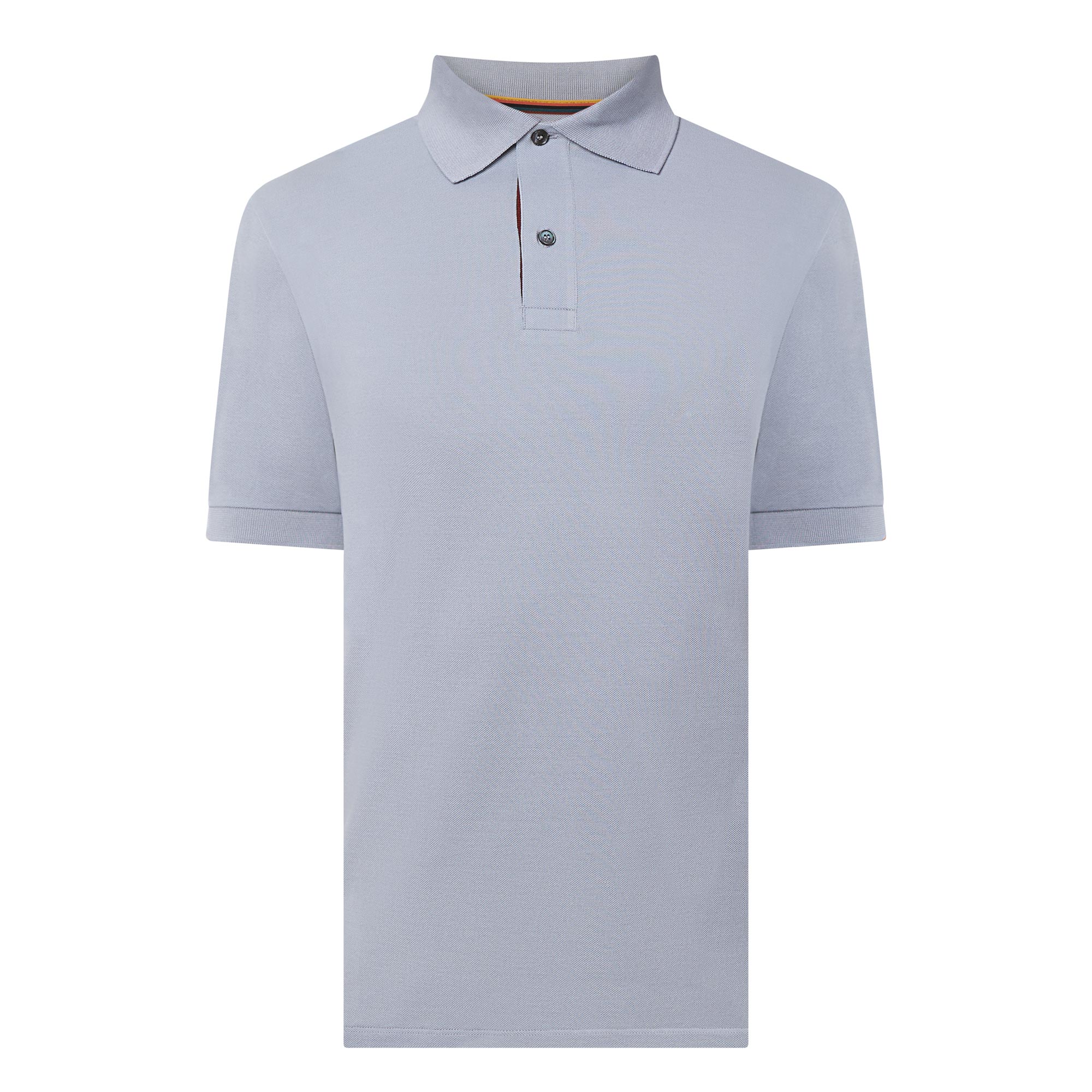 - Flat knit collar and cuffs, short sleeves, straight hemline, split side seams, button fastening, Artist Stripe placket, logo details