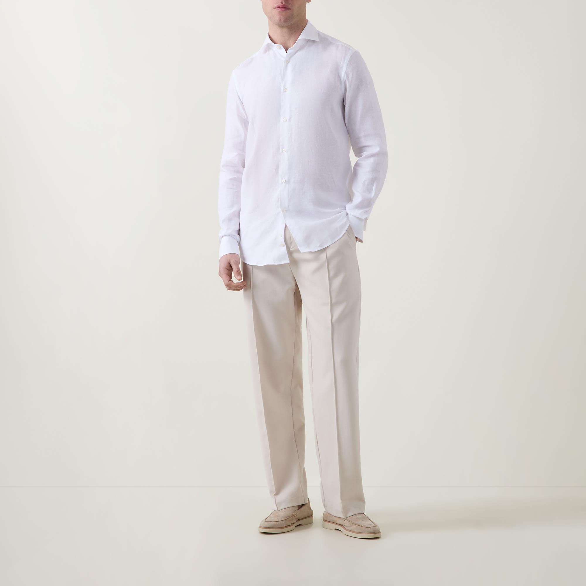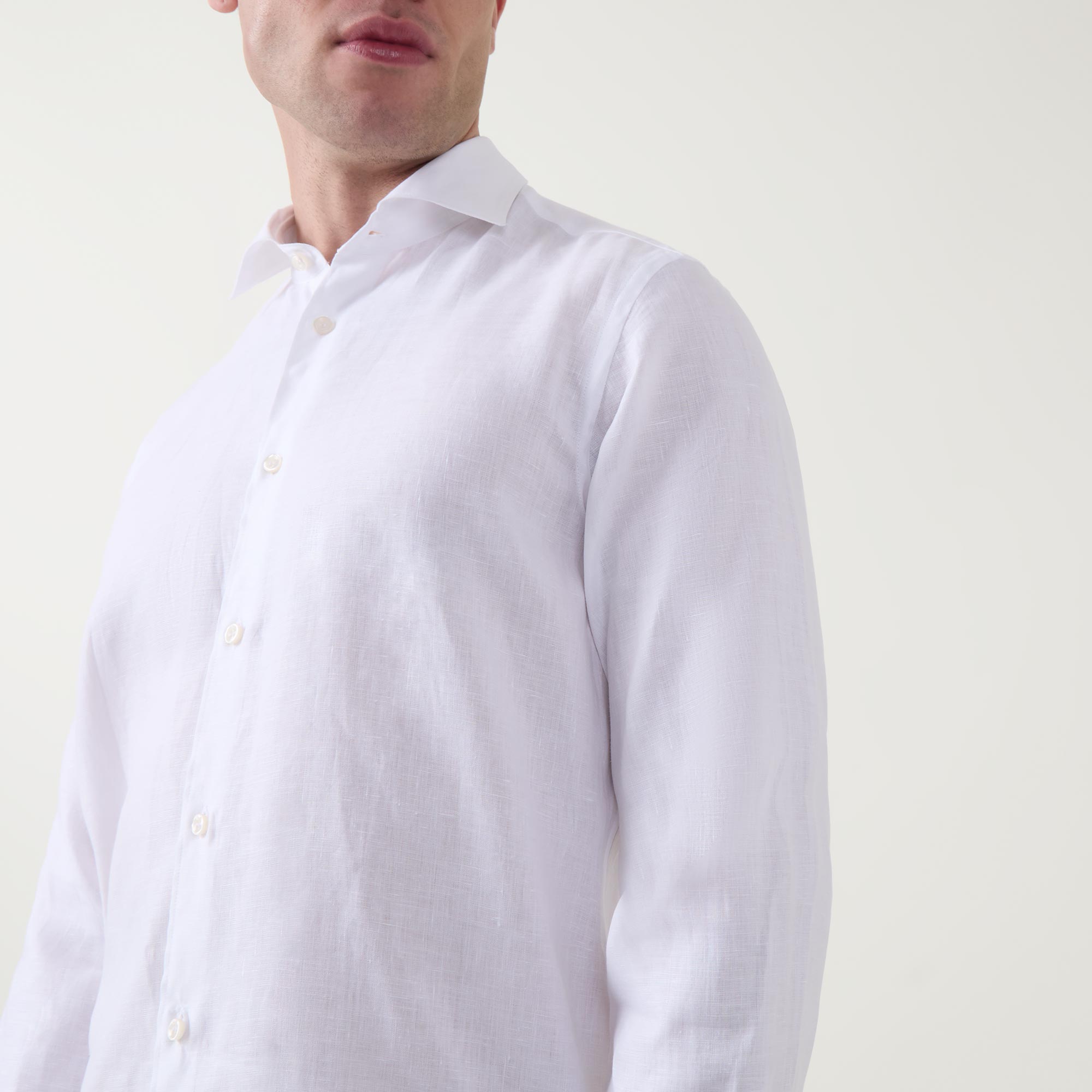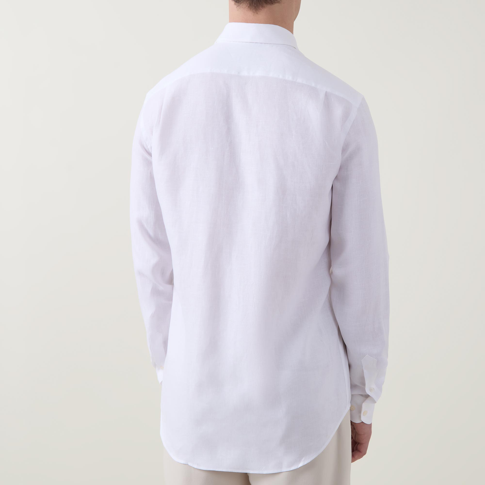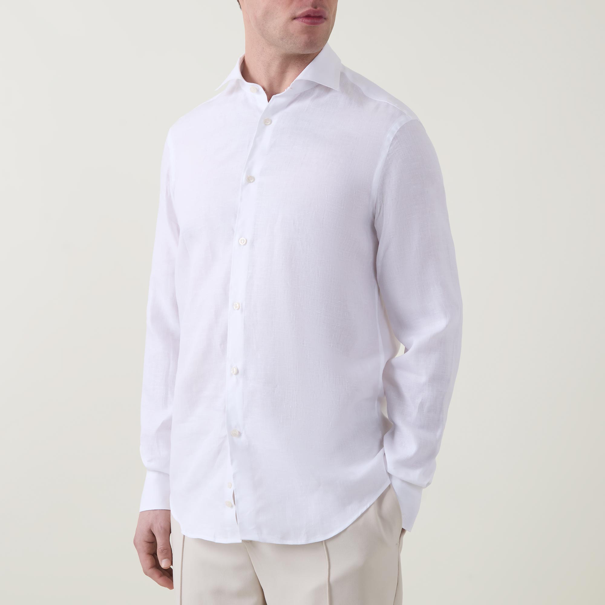 - Cutaway collar, long sleeves, front button fastening placket, single-button cuffs, tonal stitching, curved hemline, smooth fabric