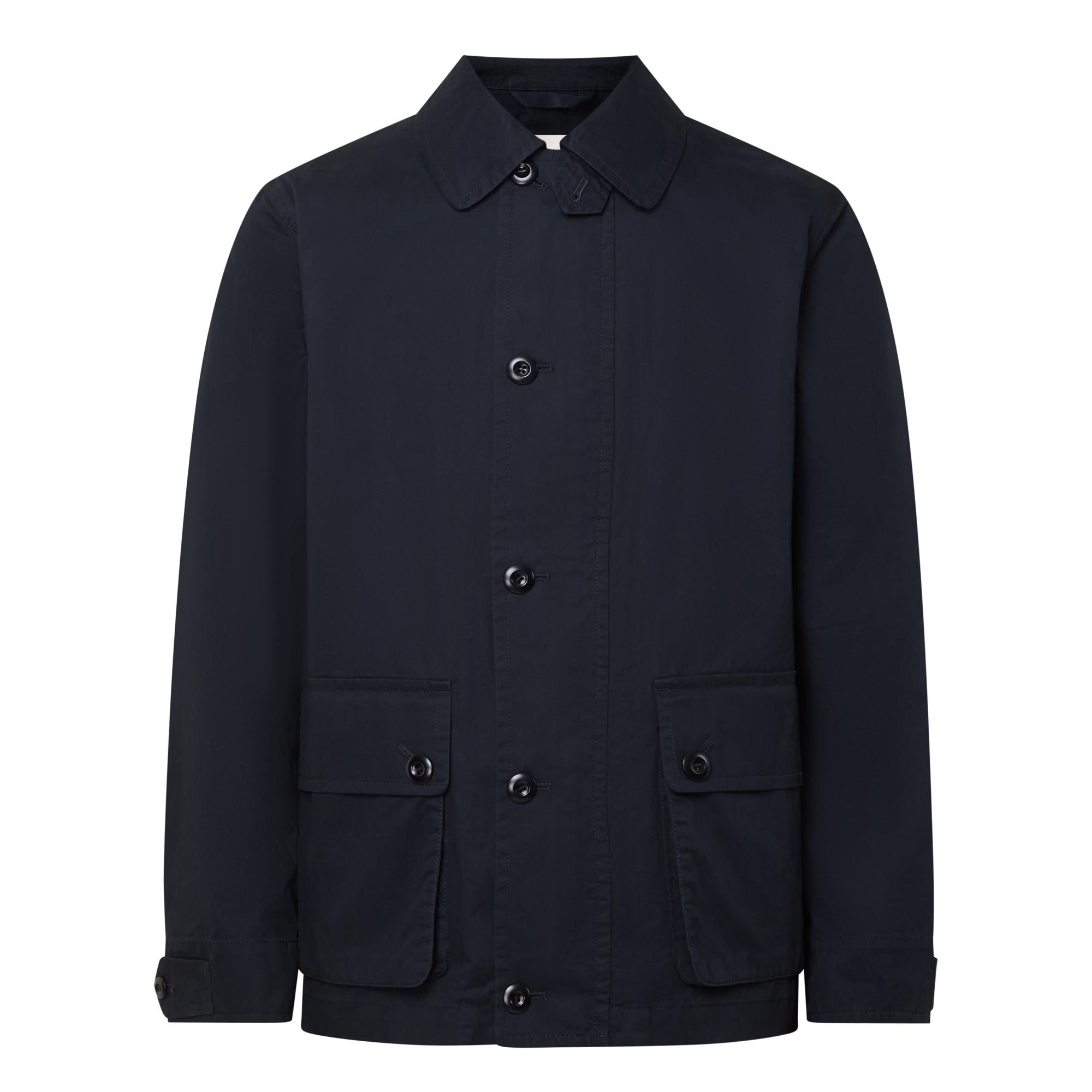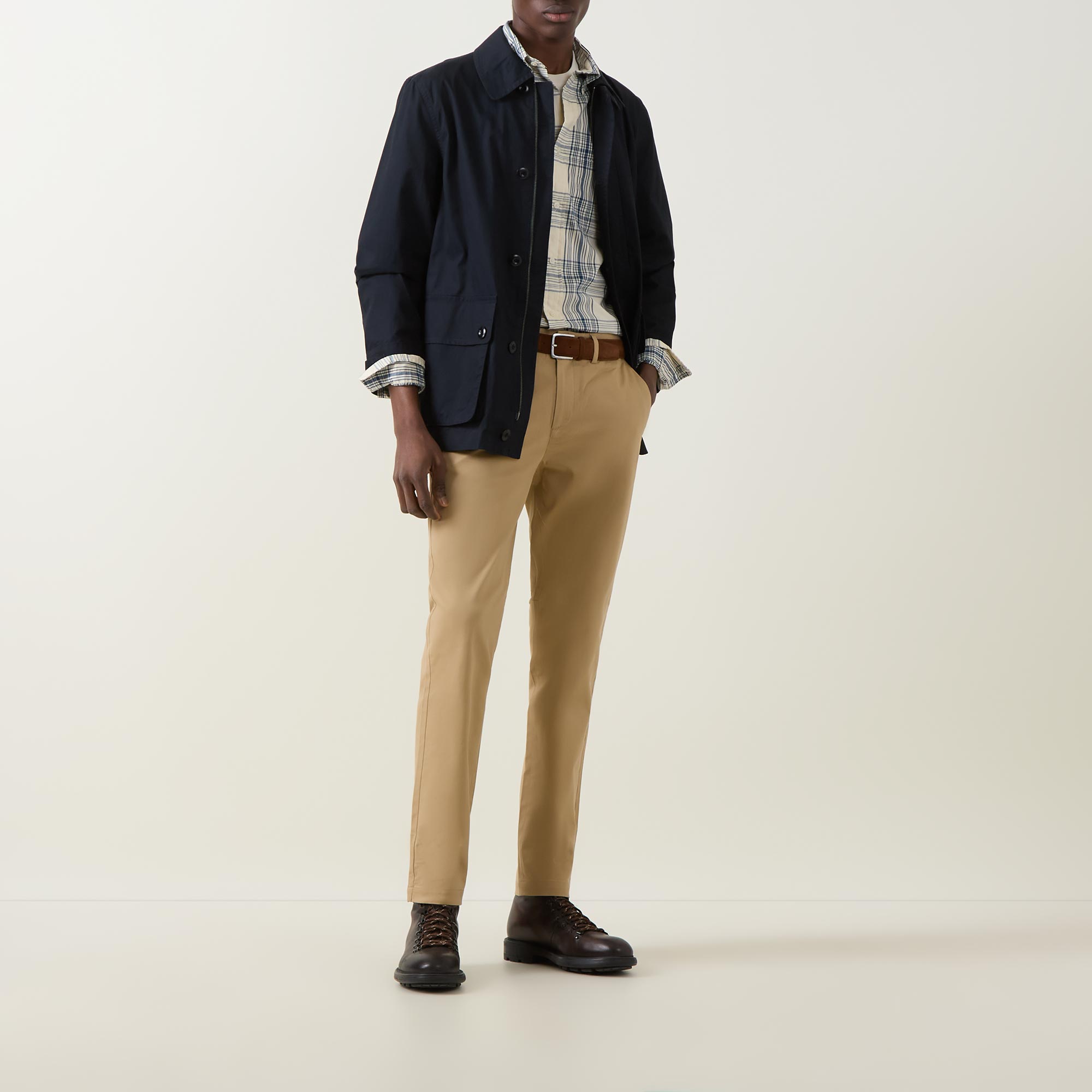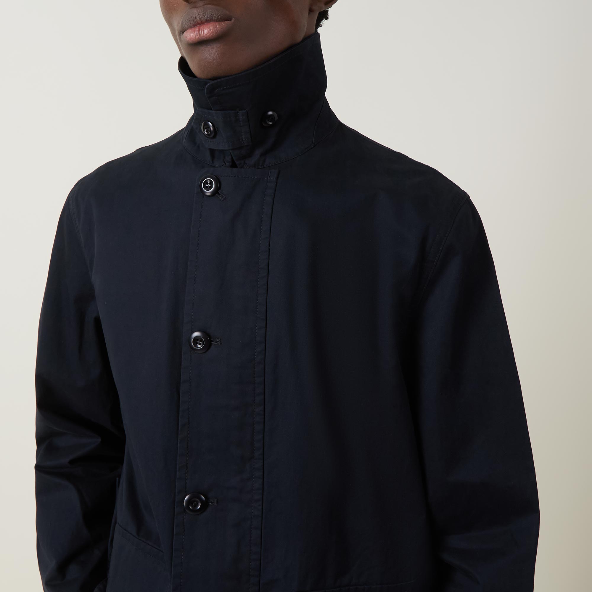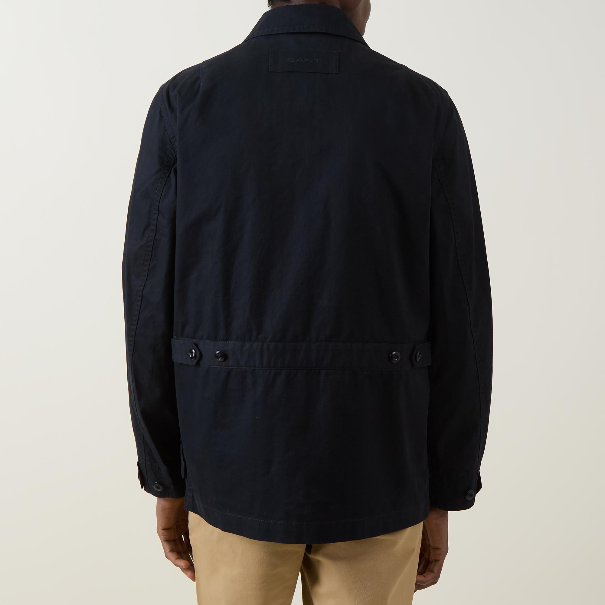 • Adjustable collar with throat latch, button fastening, patch pockets with flap and button closure, button adjustable tabs to the back, dipped hemline, logo details, hanging loop
