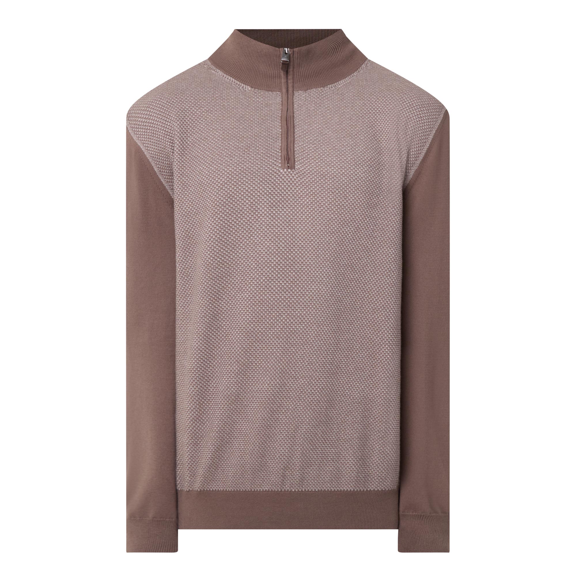 - Funnel neckline, long sleeves, ribbed trims, straight hemline, half-zip fastening, contrast front panel