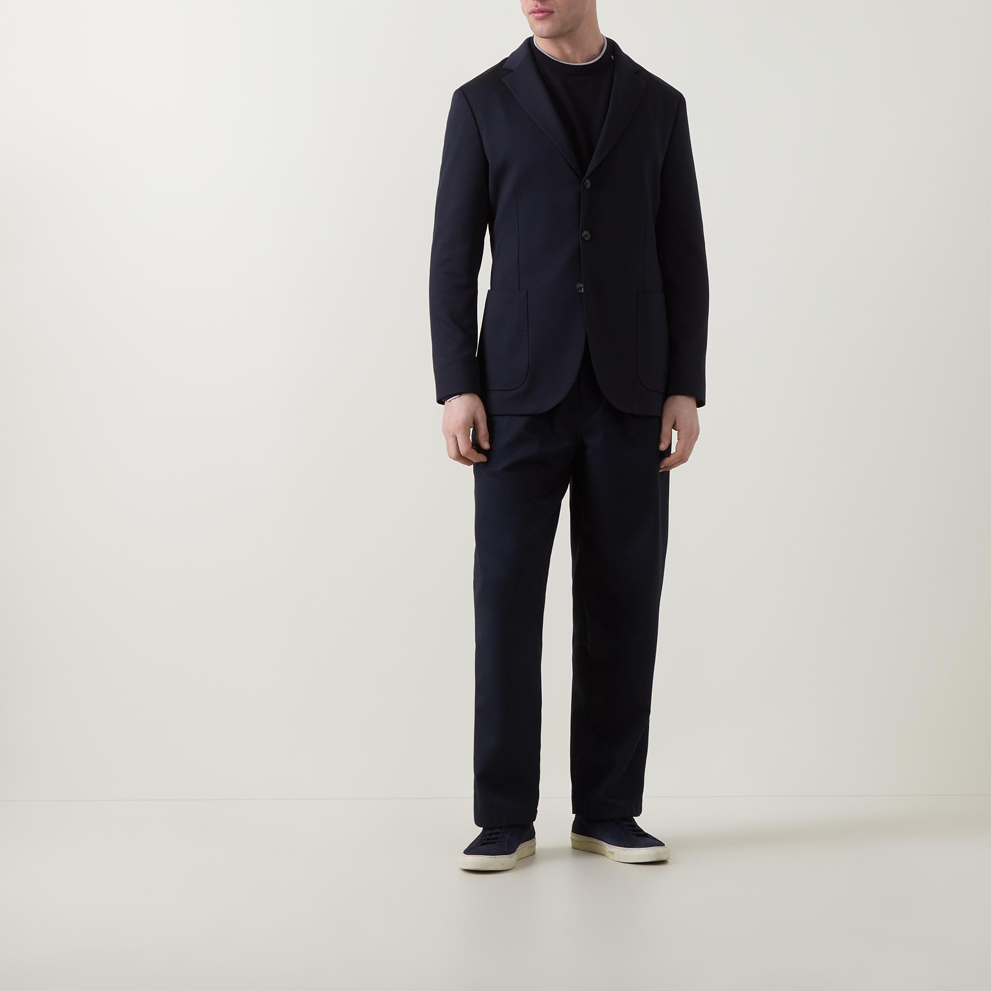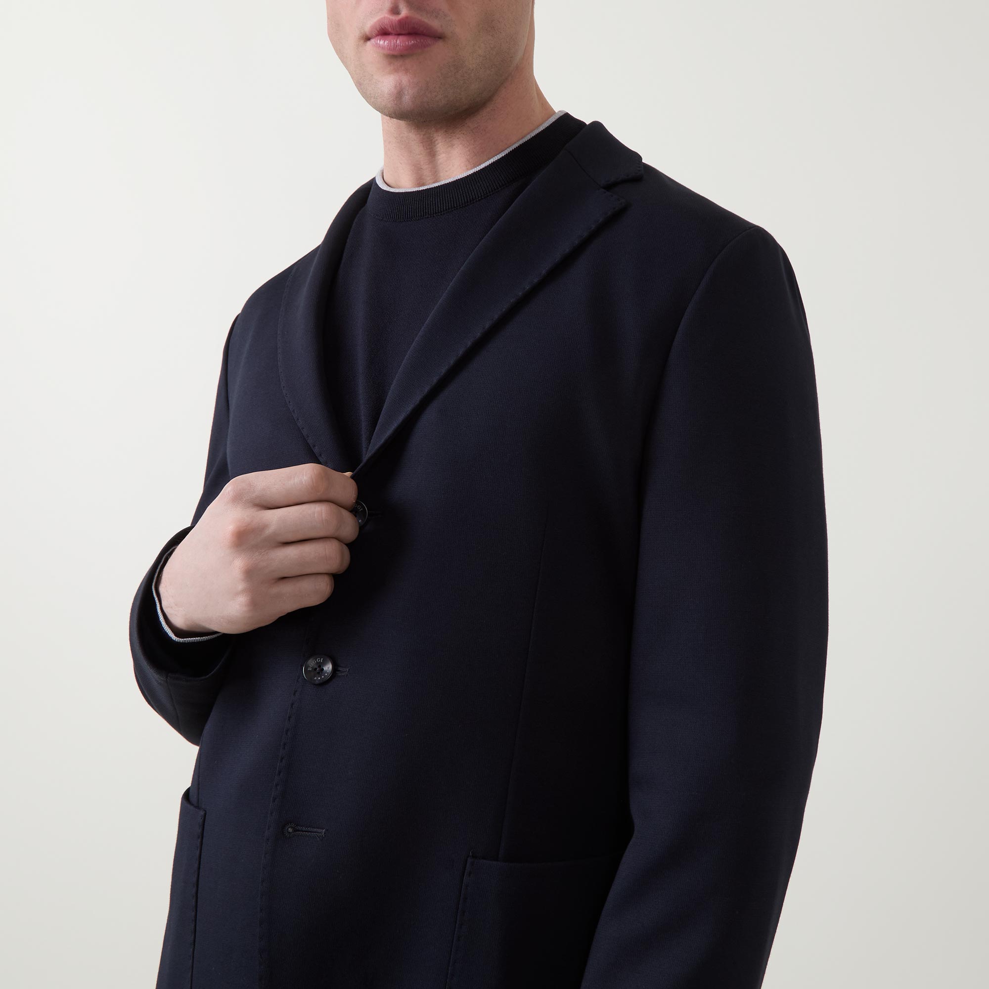 - Notched lapels, single-breasted, unlined, patch pockets, button fastening, detachable gilet and hood, stretch-fused fabric, vented to the back