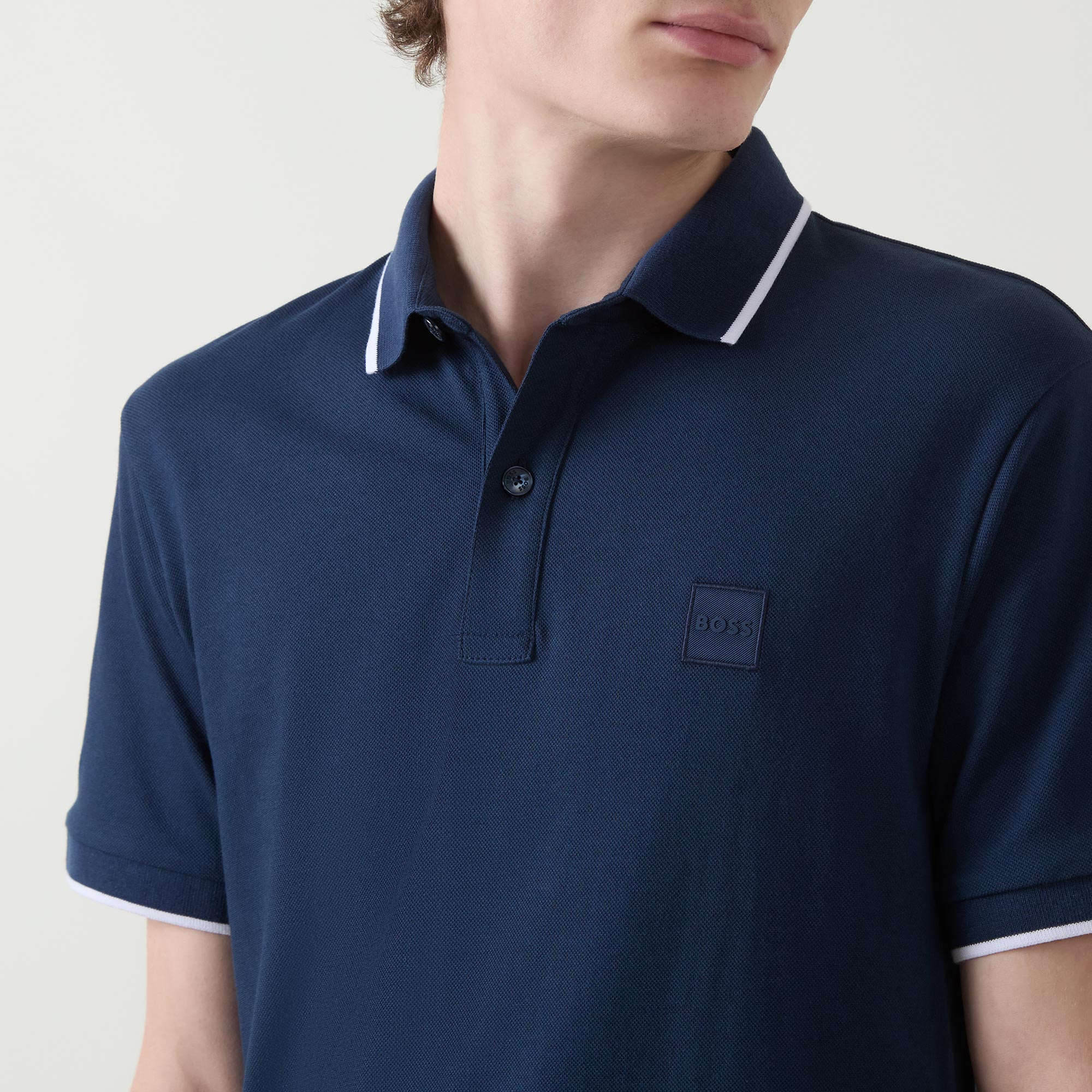 • Polo collar, short sleeves, tipped trims, logo detail, button fastenings