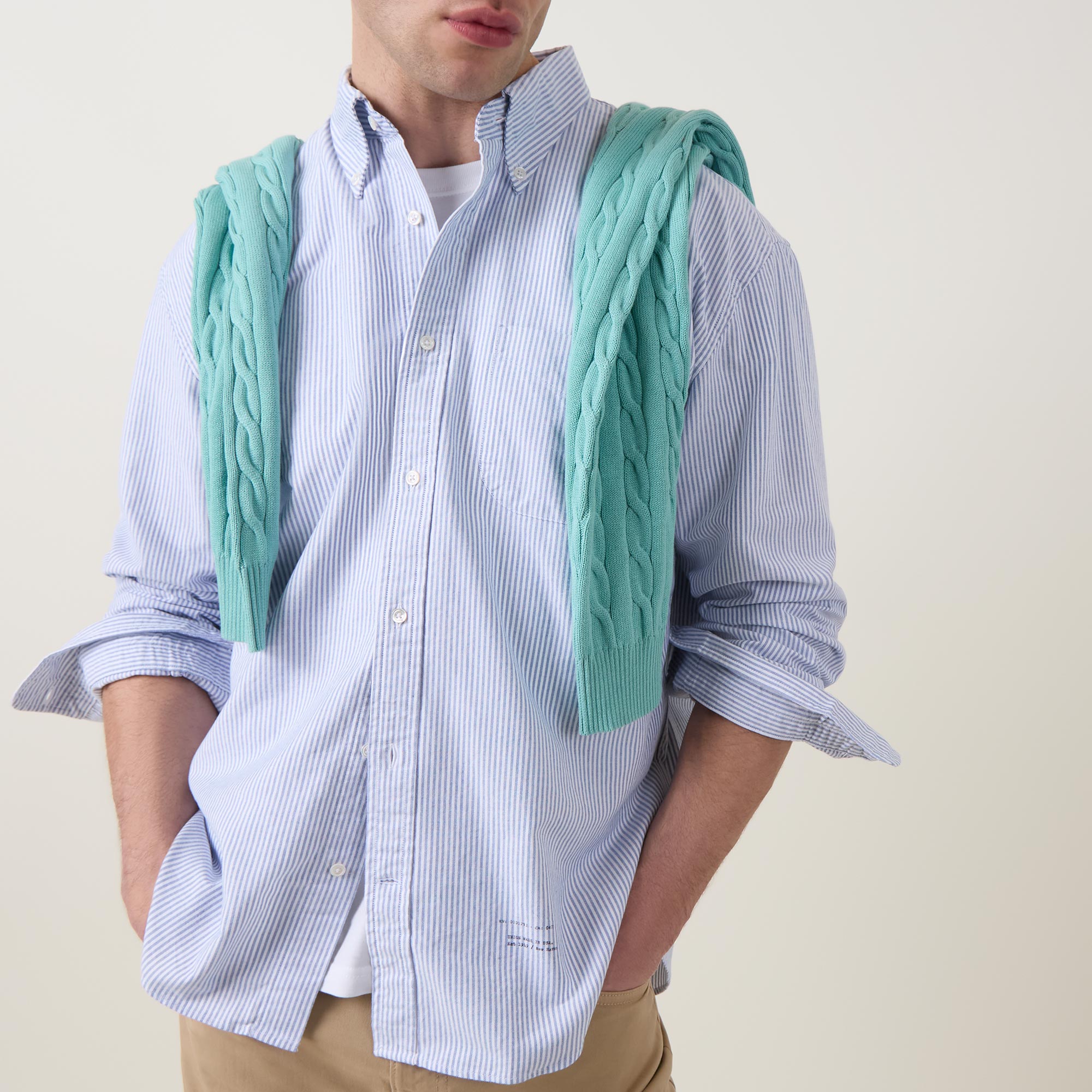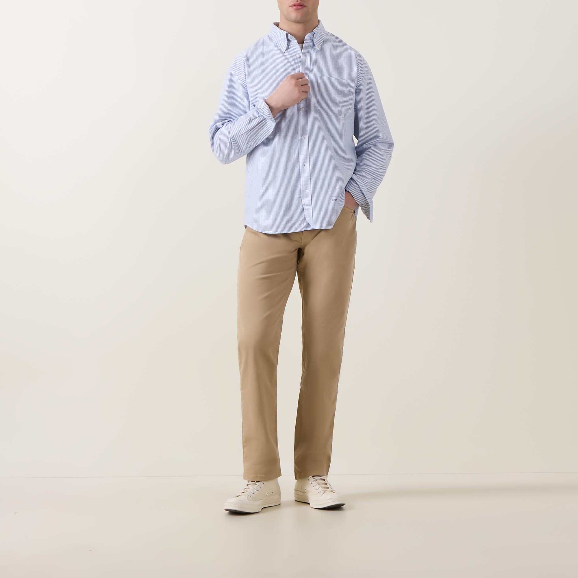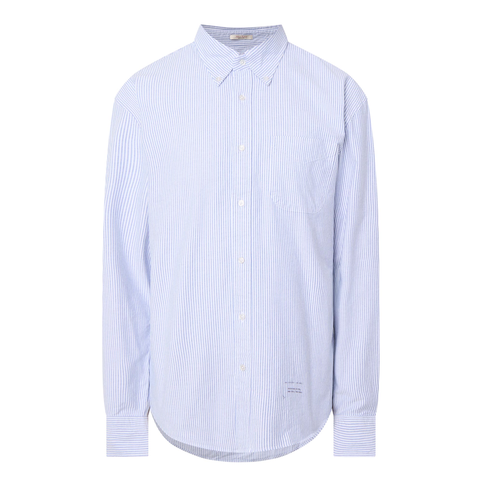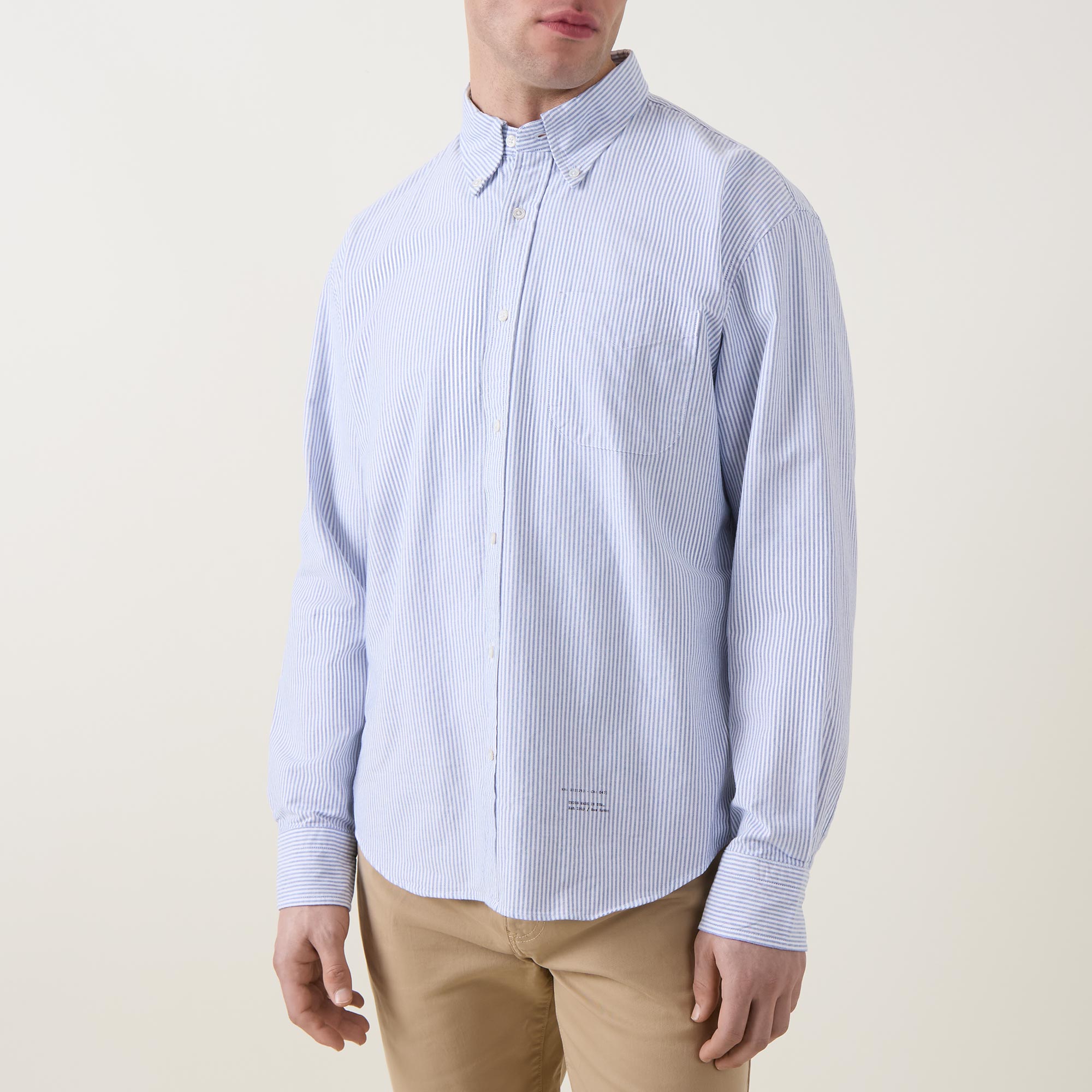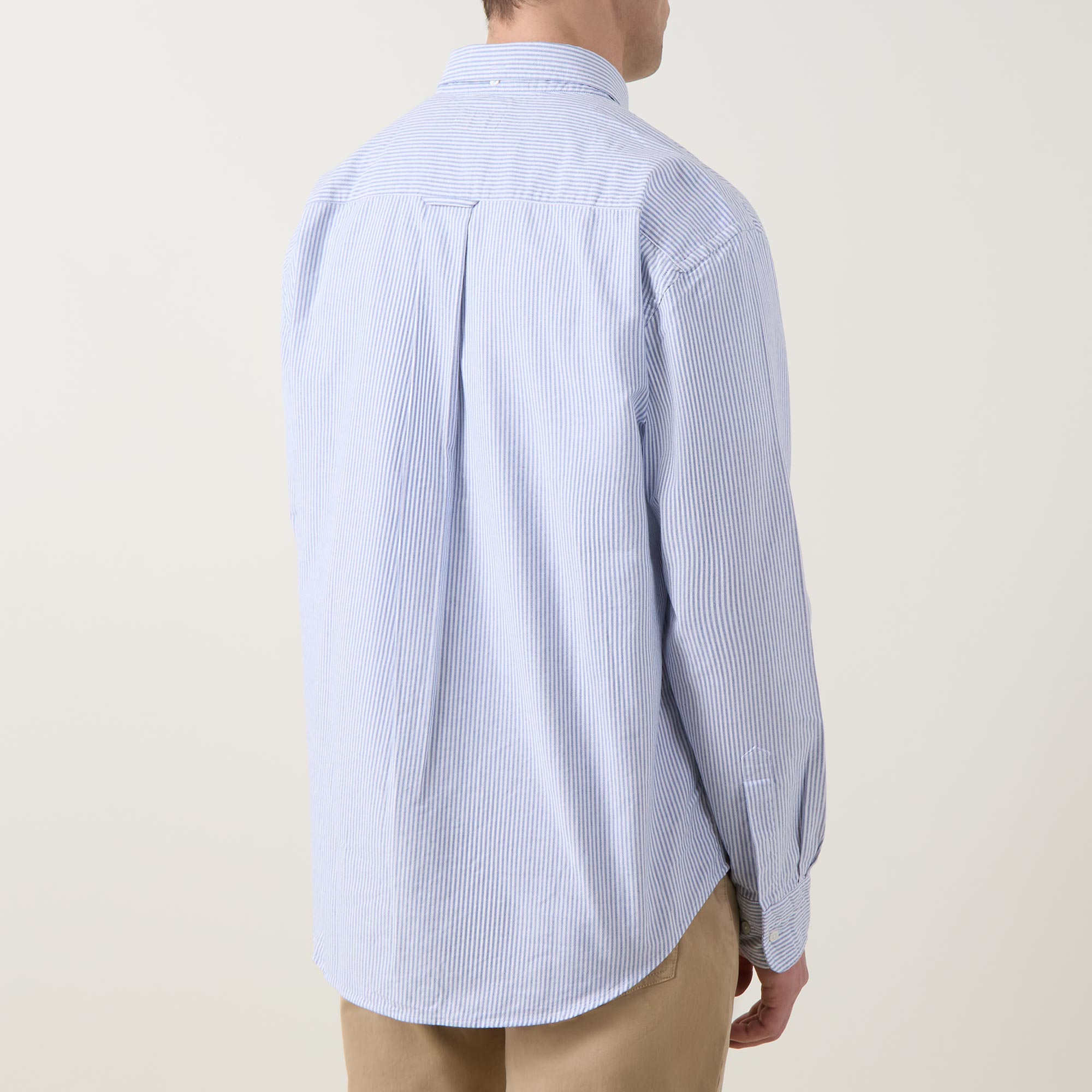 - Button-down collar, long sleeves, dropped shoulders, front button placket, logo branding detail, one chest patch pocket, single-button cuffs, tonal stitching, pinstripe pattern, back box pleat, curved hemline, smooth fabric