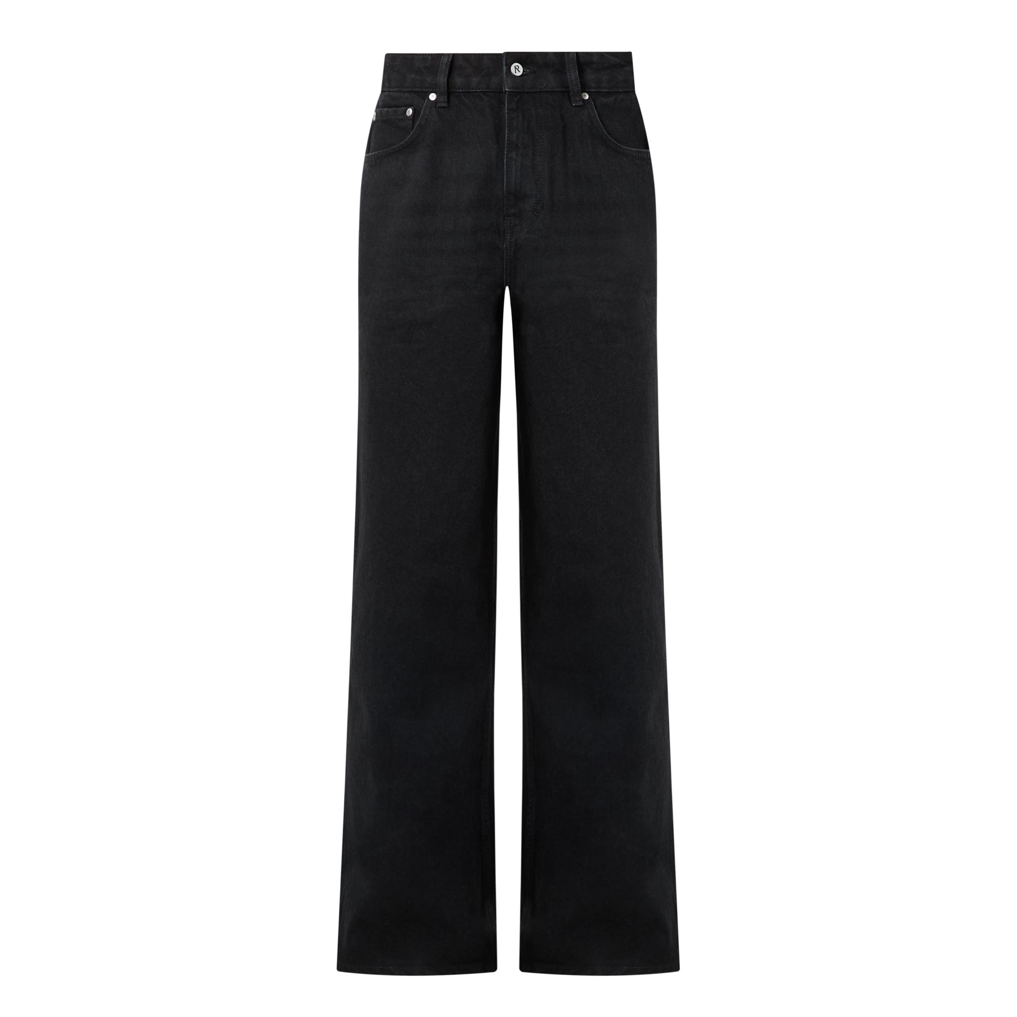 - Zip-fly and button fastening, belt loops, five-pocket design, tonal stitching, R initial embroidery to the reverse, mid-rise, baggy-cut leg, smooth denim finish