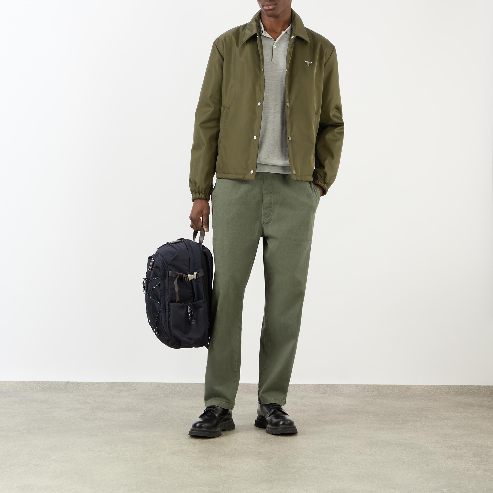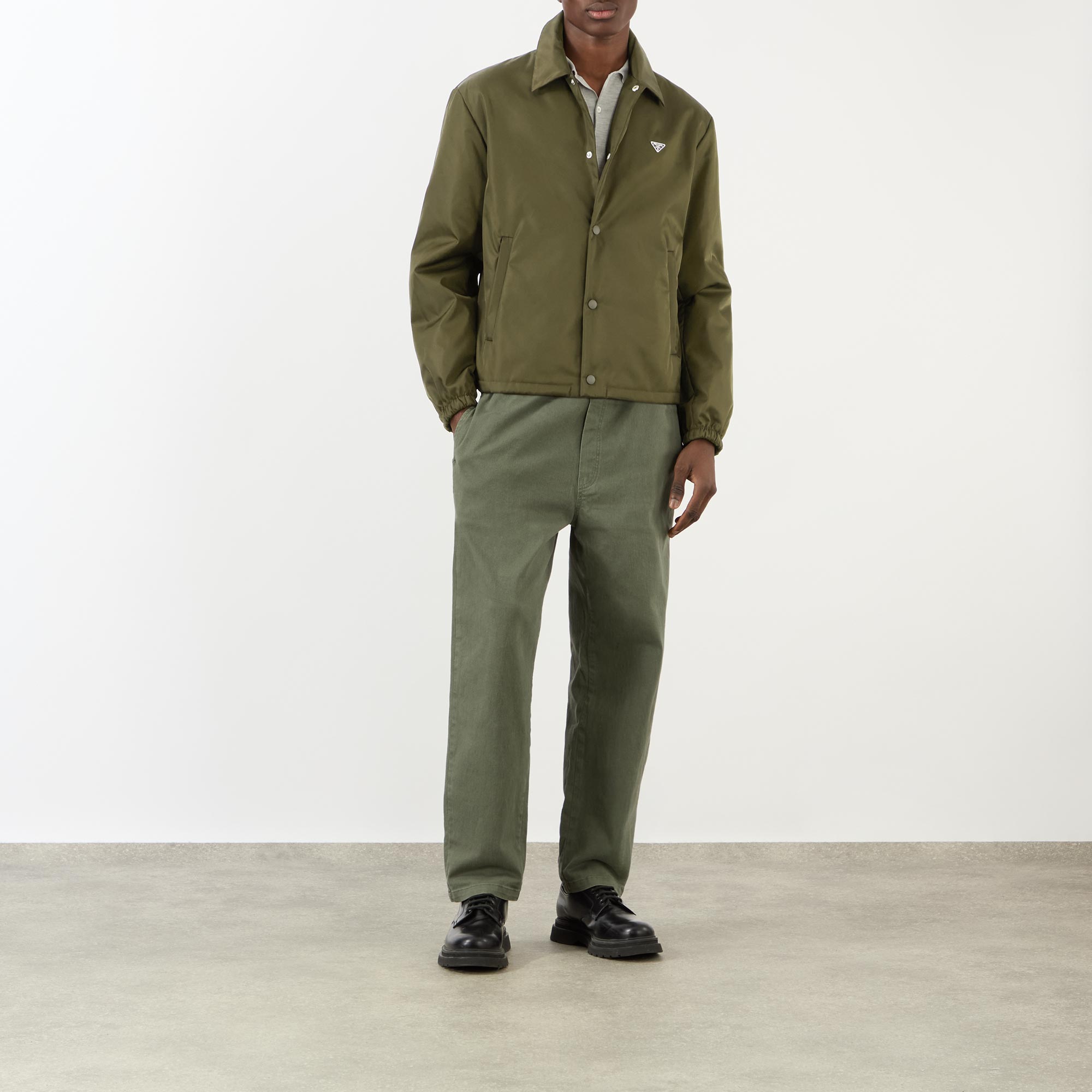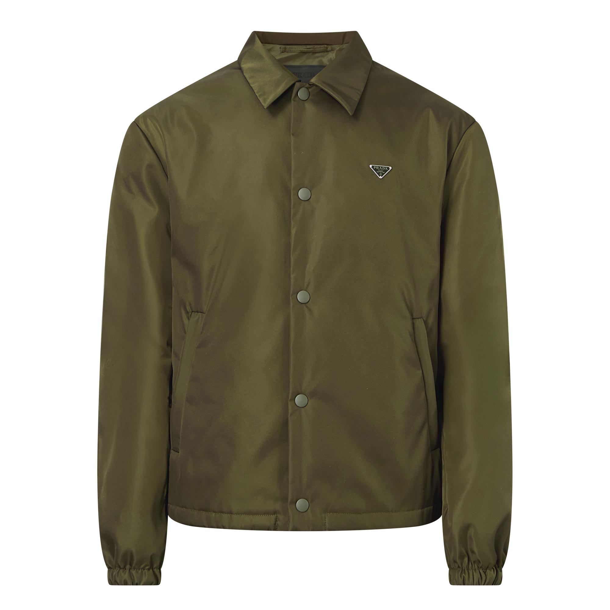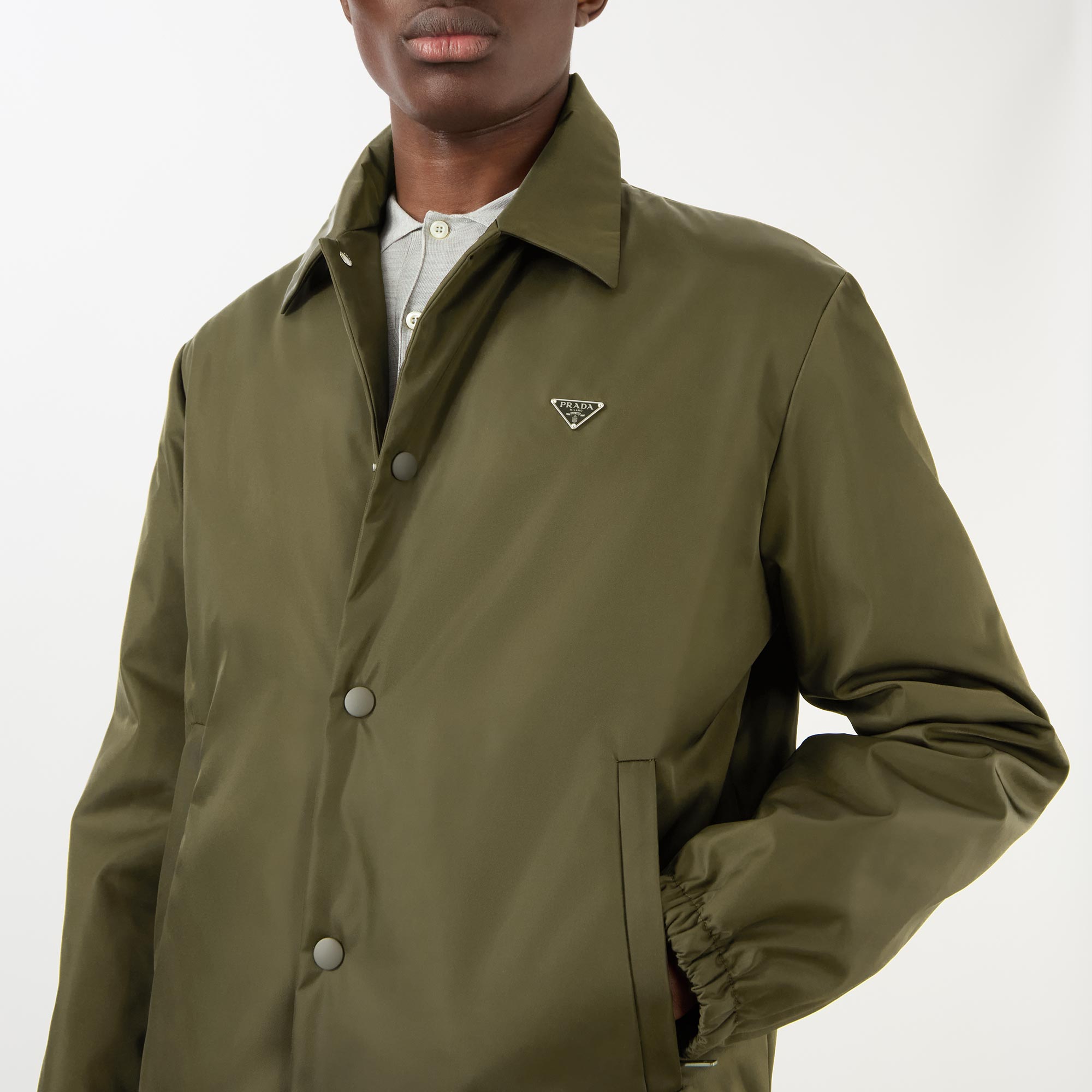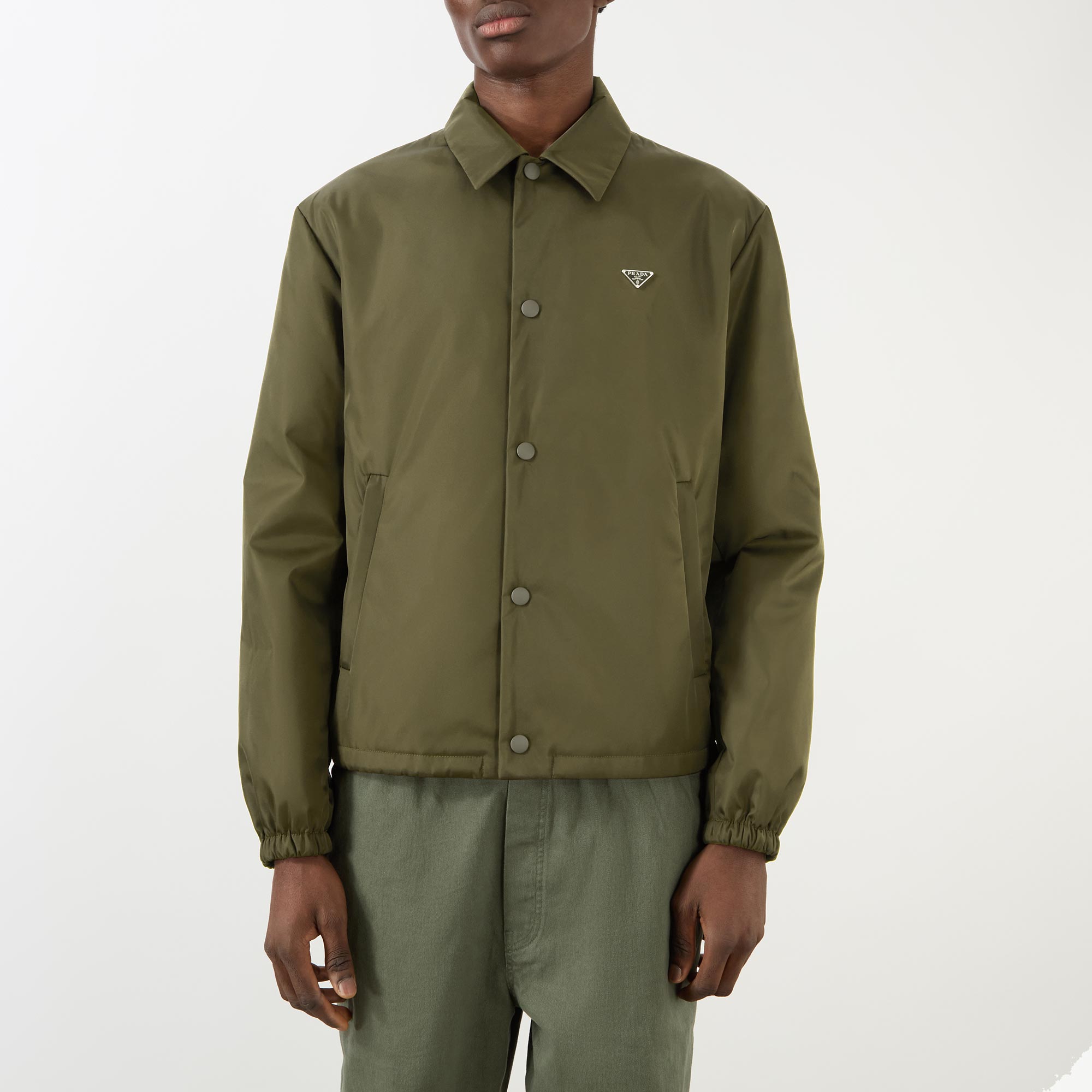 - Point collar, long sleeves, dropped shoulders, snap-button fastening, two side in-seam pockets, metal triangle logo plaque, elasticated hem and cuffs, padded finish