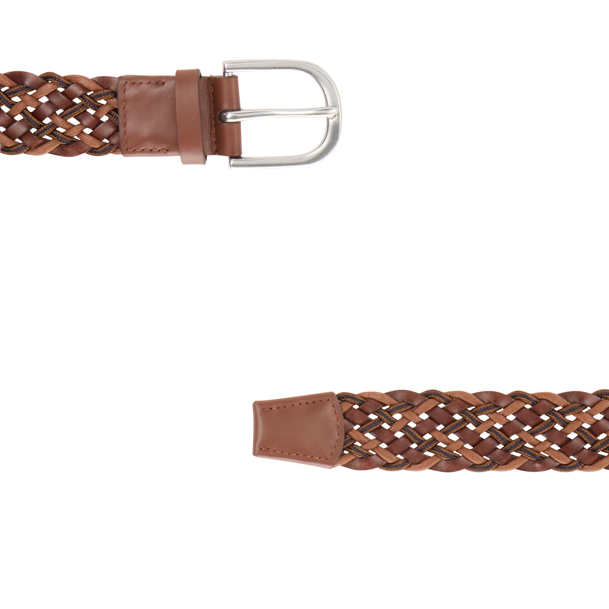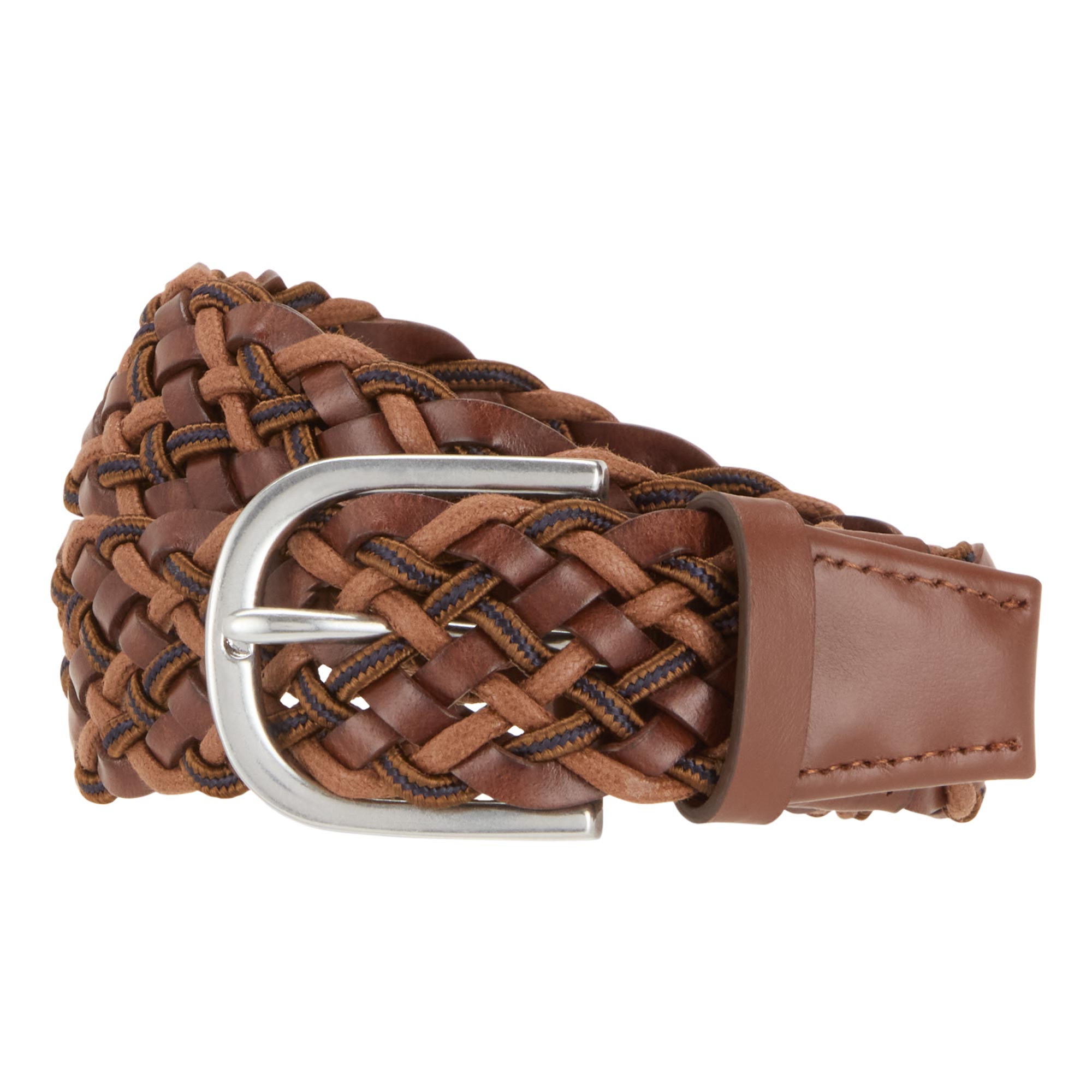 - Woven design, round buckle fastening, silver-tone finishes, smooth leather