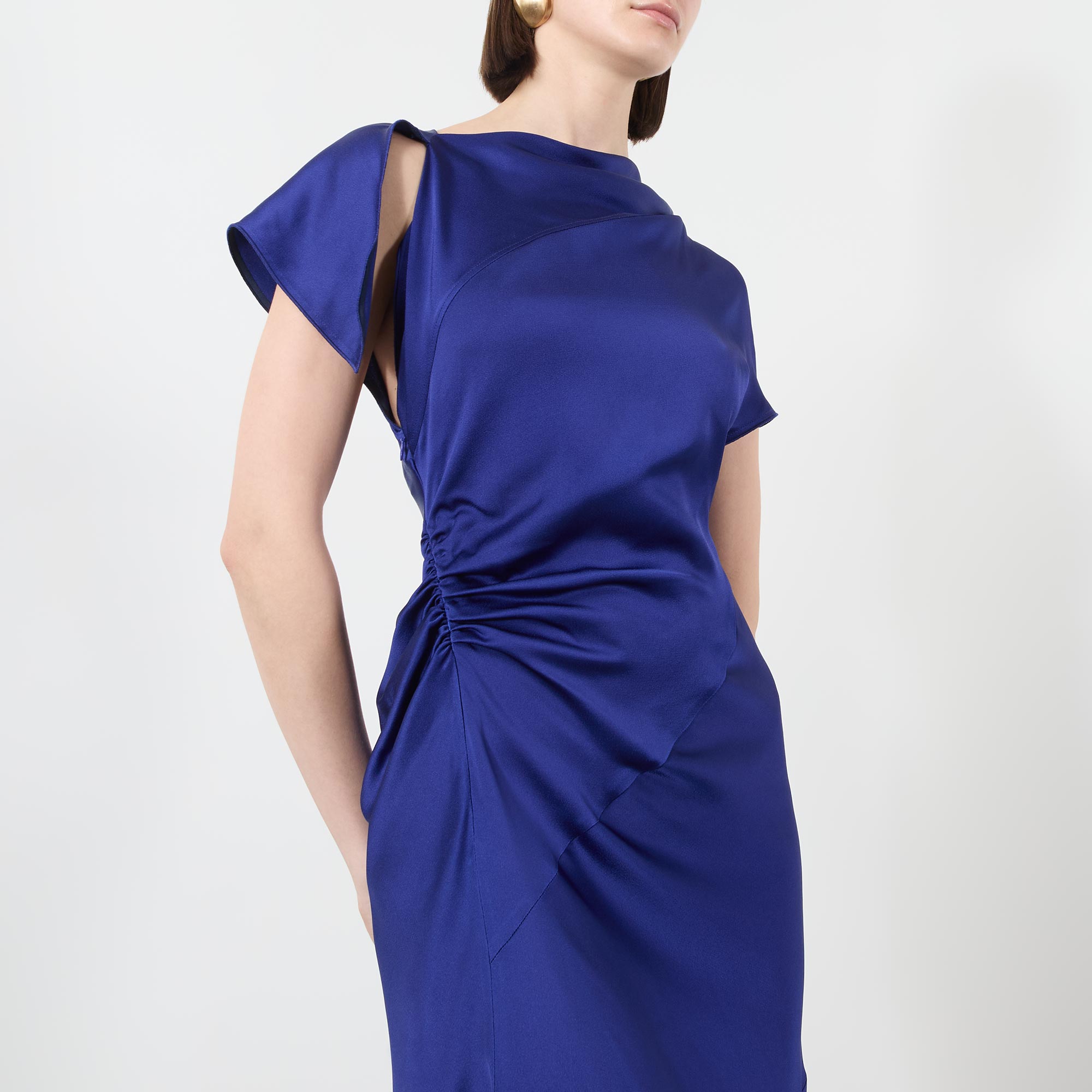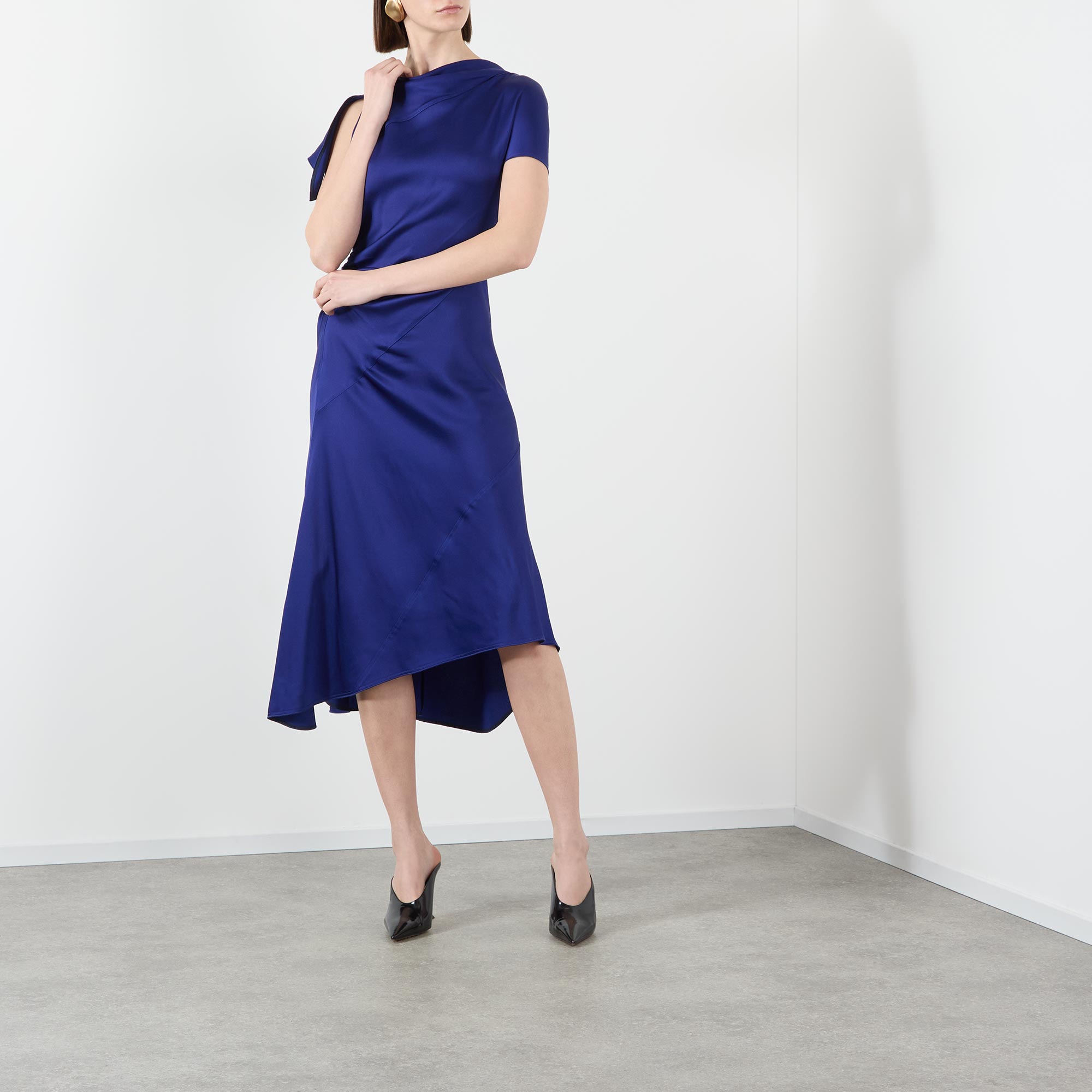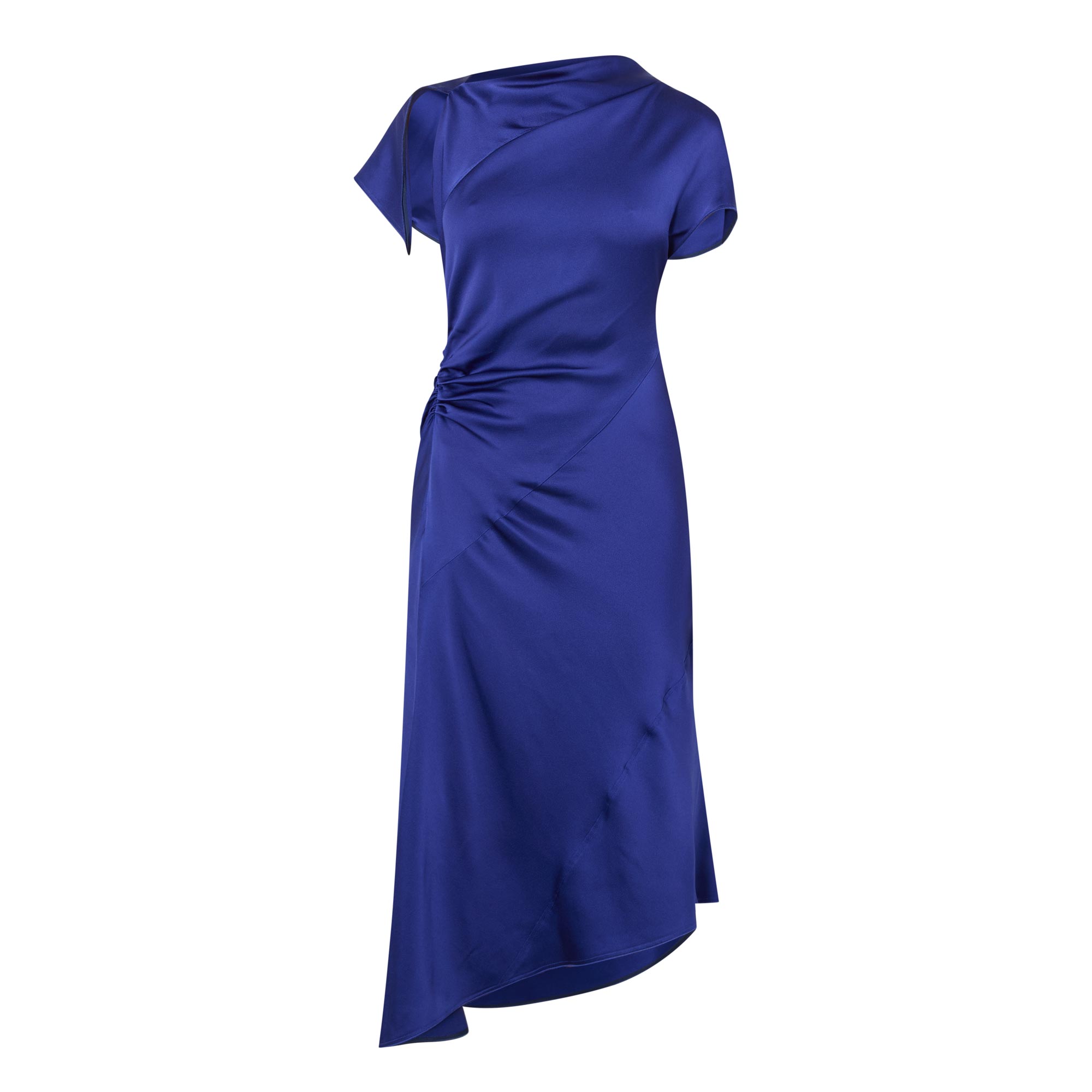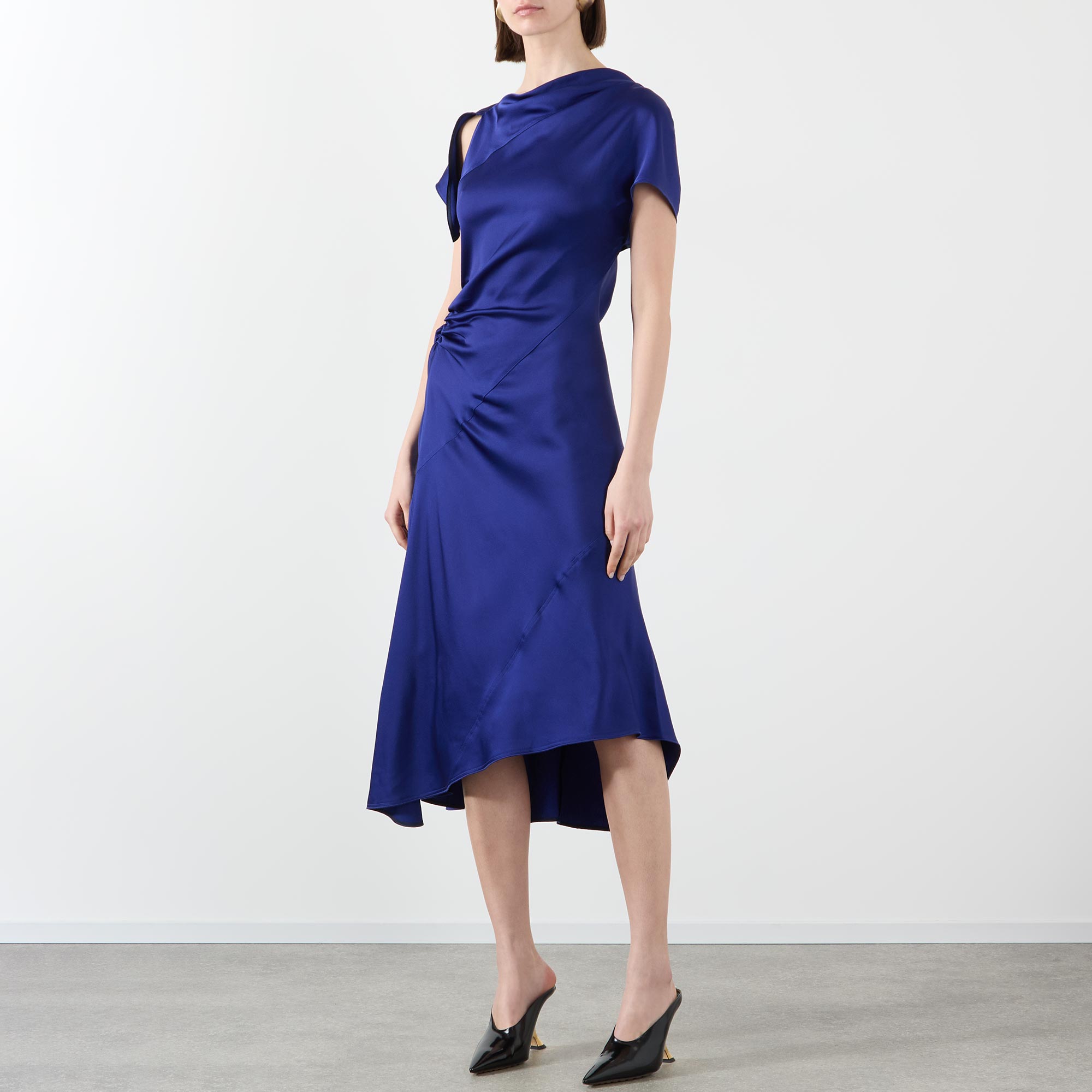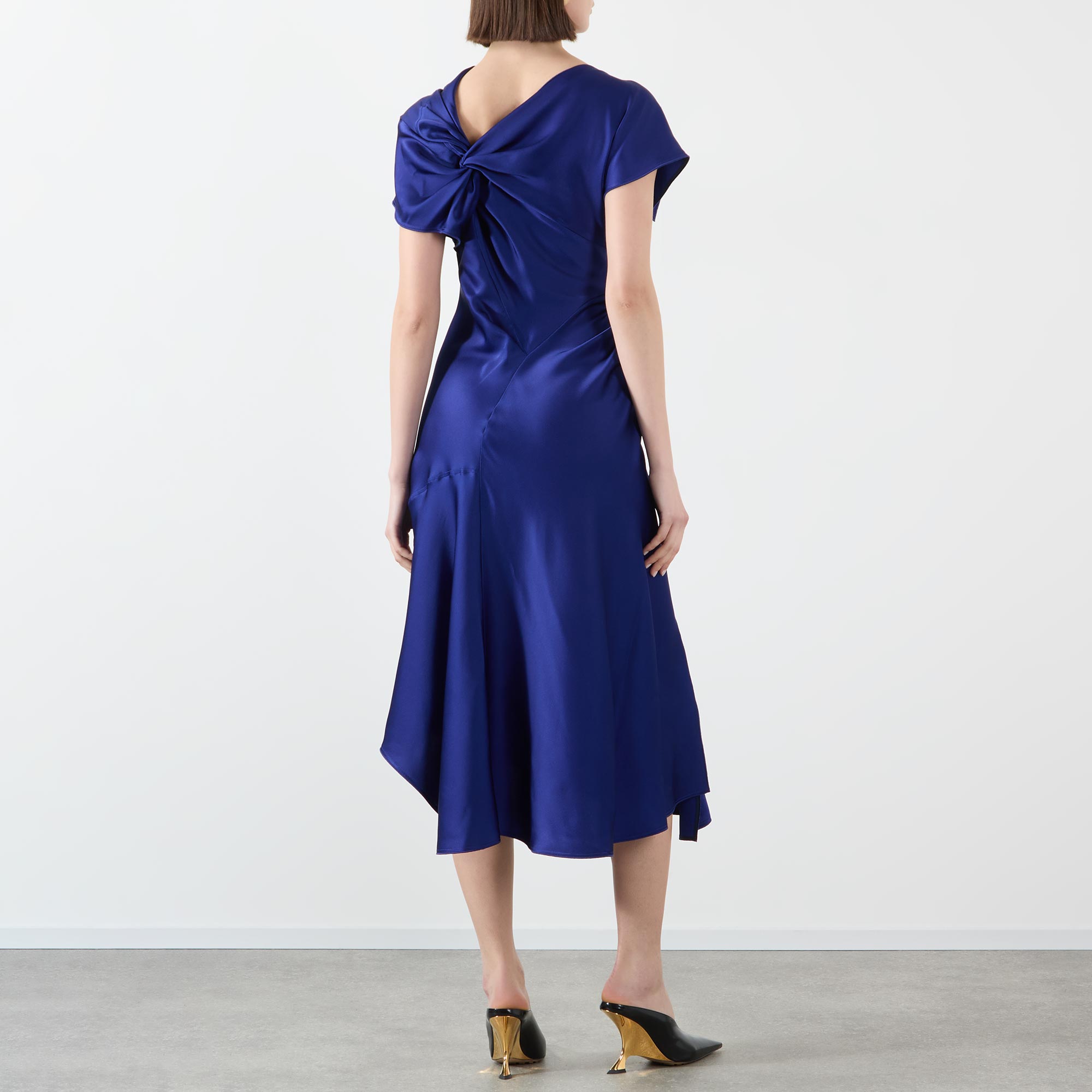 • Asymmetric neckline, short cap sleeves, rear knot detail, fitted through the waist and hips, flared asymmetric hem, smooth finish, midi length