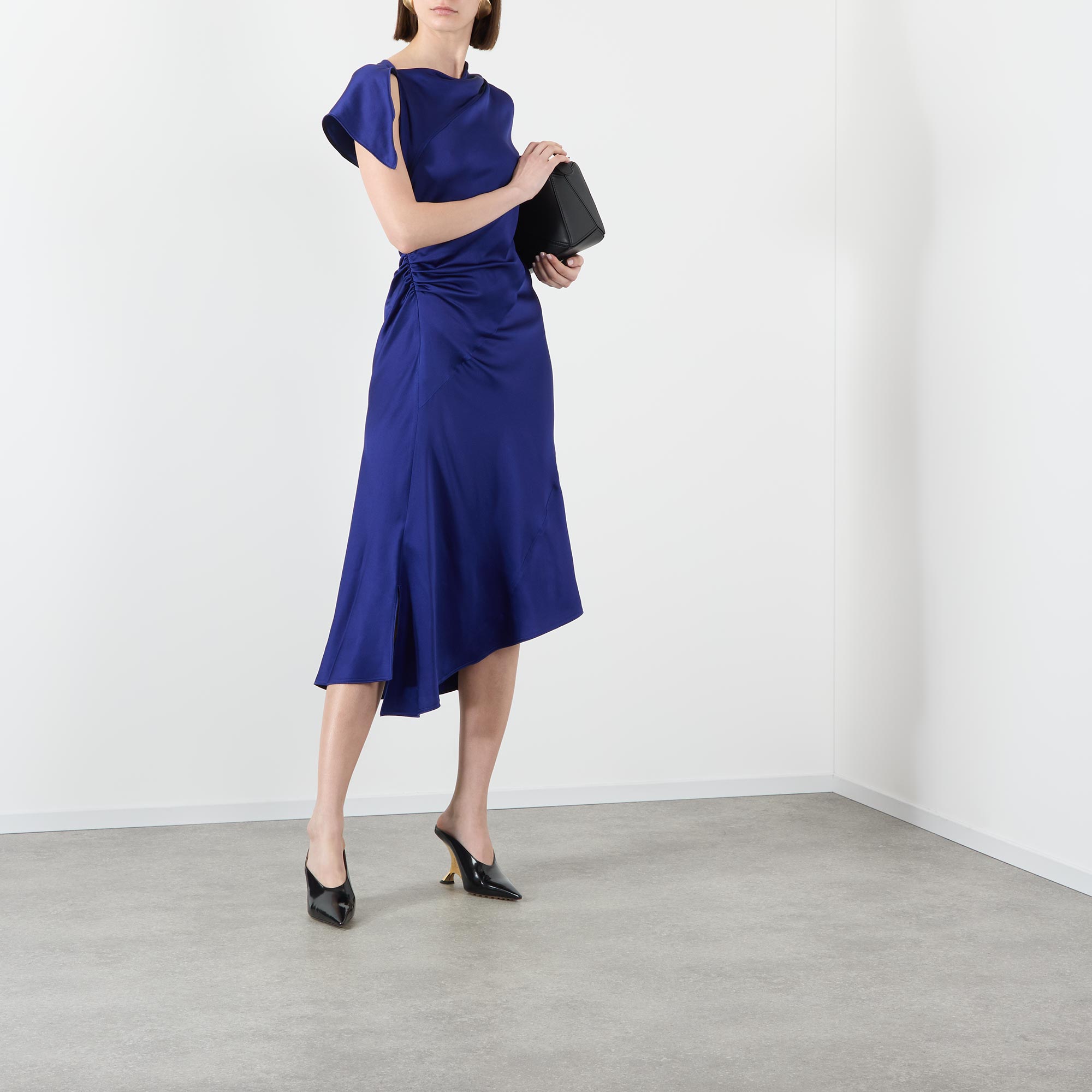 Twisted details and bias-cut silhouettes appear across the SS26 collection from Victoria Beckham, take this dress. Framed by an asymmetric neckline and short cap sleeves, it features a knot detail at the back and gathering along the side to add dimension, before falling to a flared midi length.