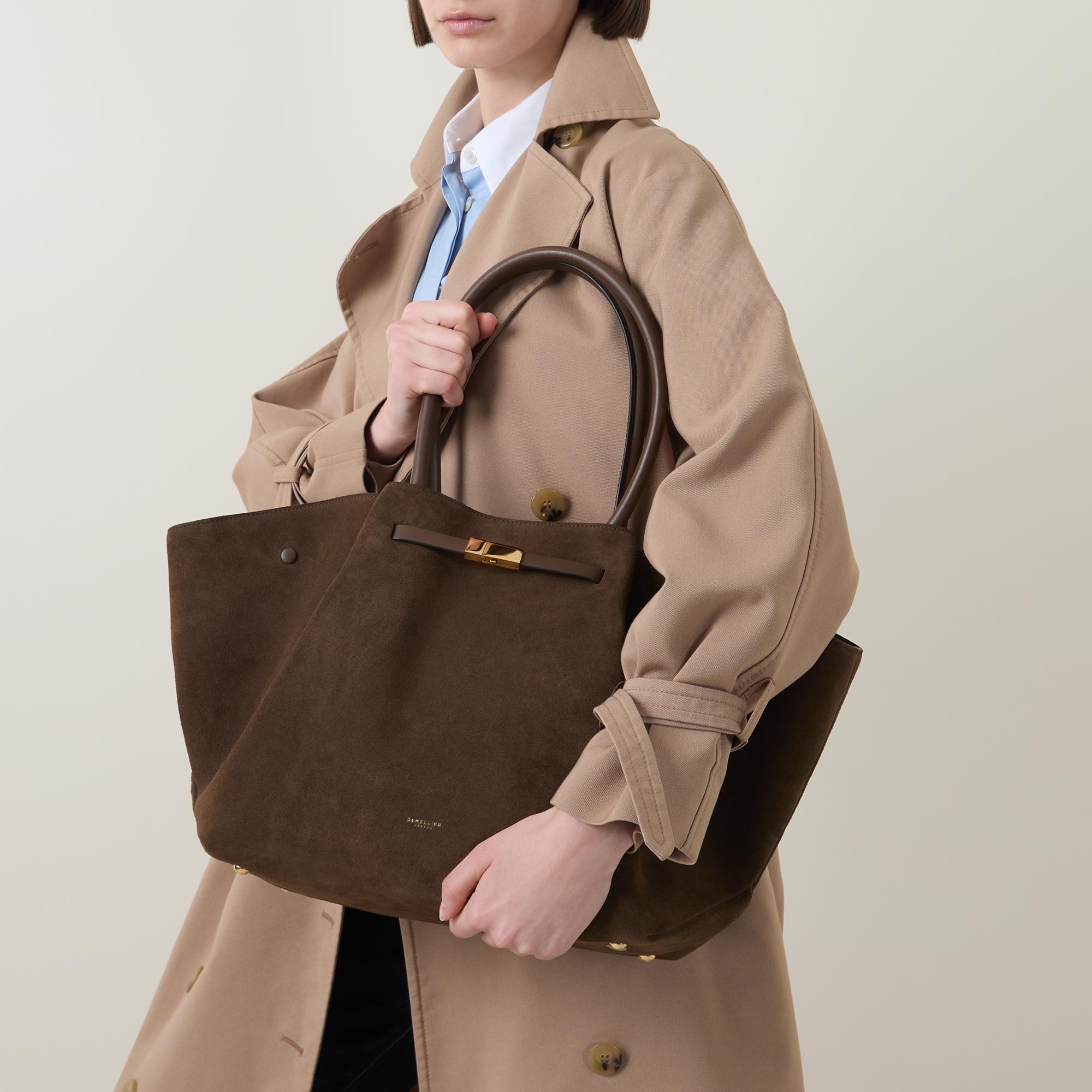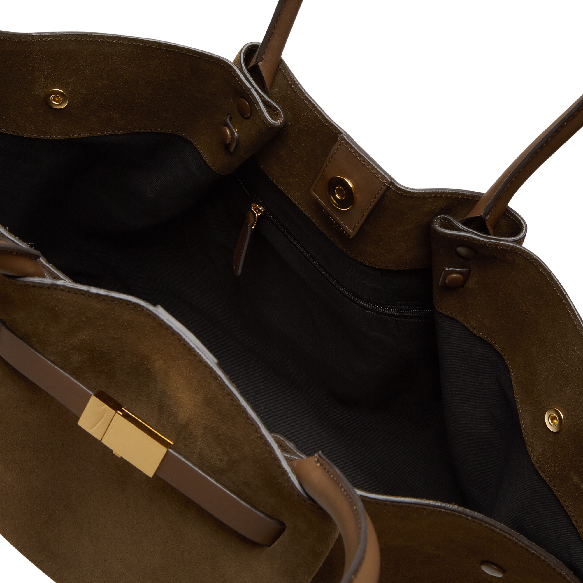 • Tubular carry handles, central internal magnetic snap fastening, belt with clasp closure, triangular folds on each side, metal foot studs, polished gold-tone hardware, logo detail, tonal stitching, smooth suede finish