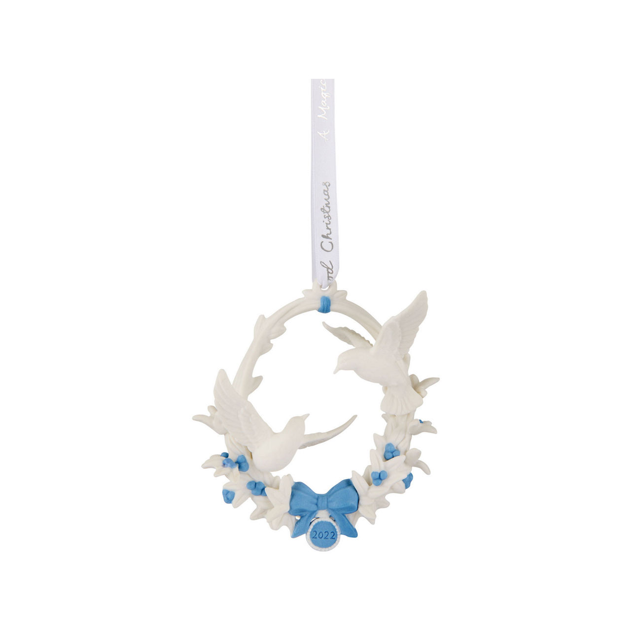 Celebrate the first year in a new home with this beautiful Wedgwood ornament. Etched with the year 2022, treasure this keepsake from the Christmas Collection. Made from porcelain, this special festive wreath takes centre-stage with two doves, holly and berries, all finished with a Wedgwood blue bow. Hang it from your tree or use a decorative piece, using the ribbon that reads ‘A Magical Wedgwood Christmas’.
