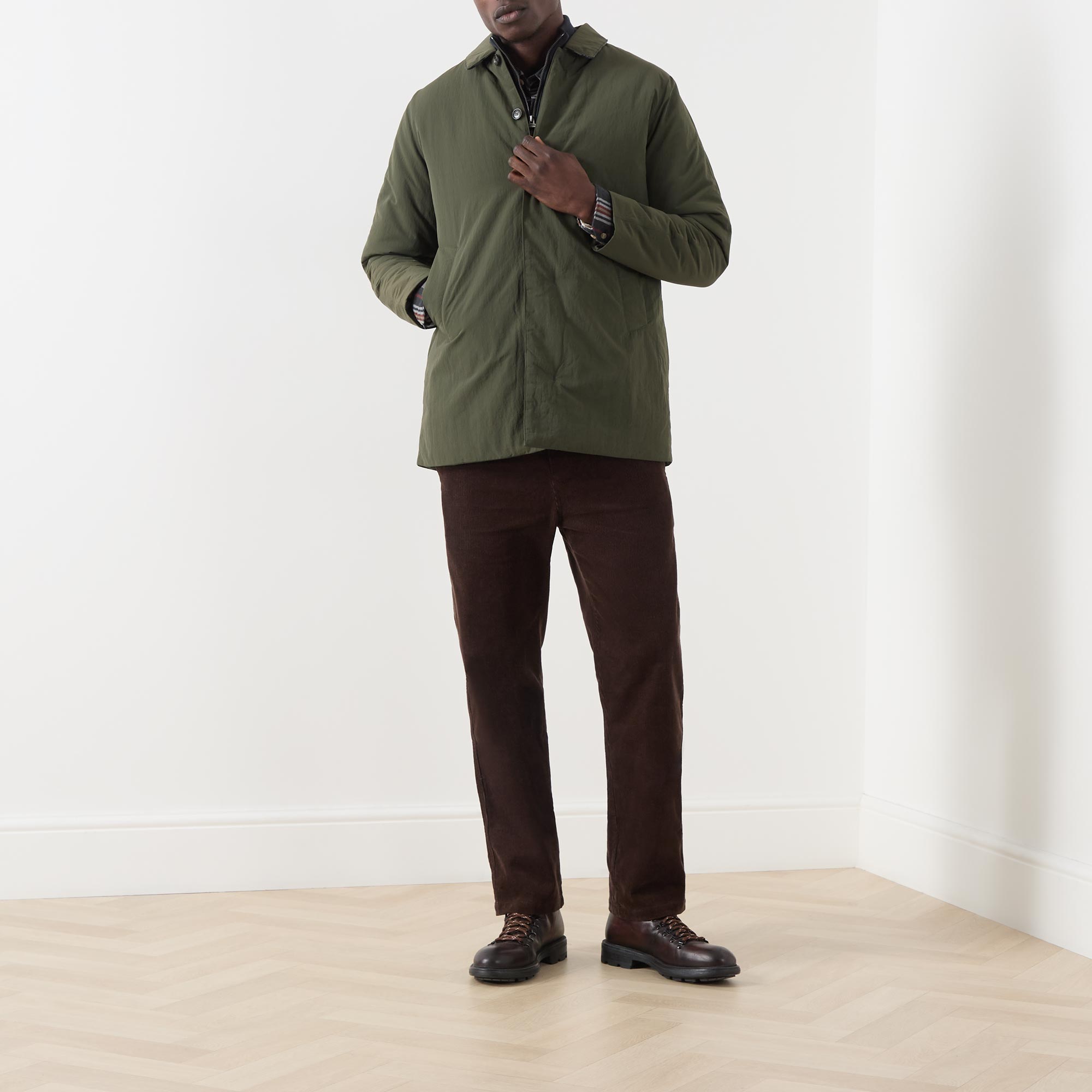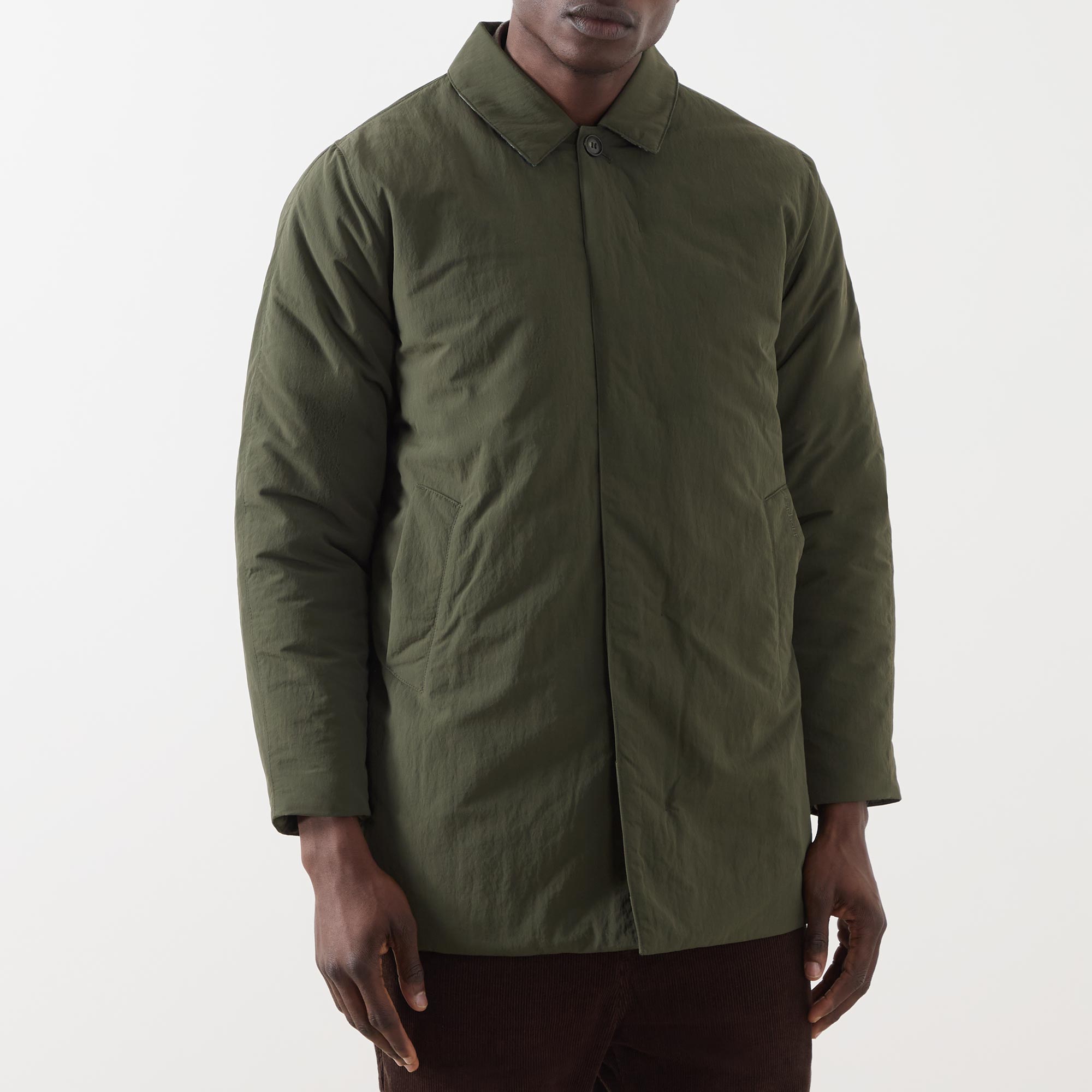- Lightly padded, long sleeves, pointed collar, showerproof, concealed button fastenings, straight hemline