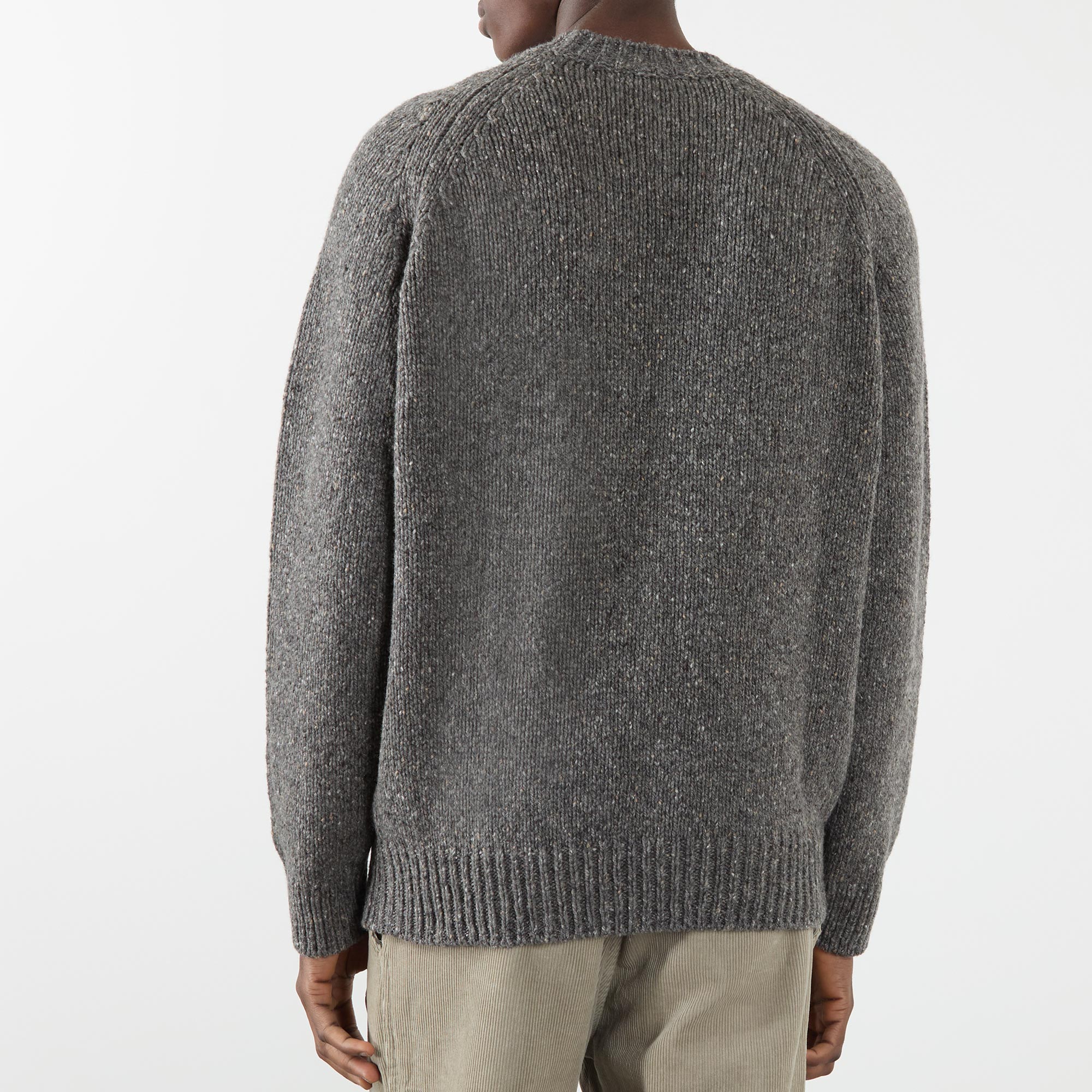 - Crew neck, ribbed trims, raglan sleeves, speckled yarn