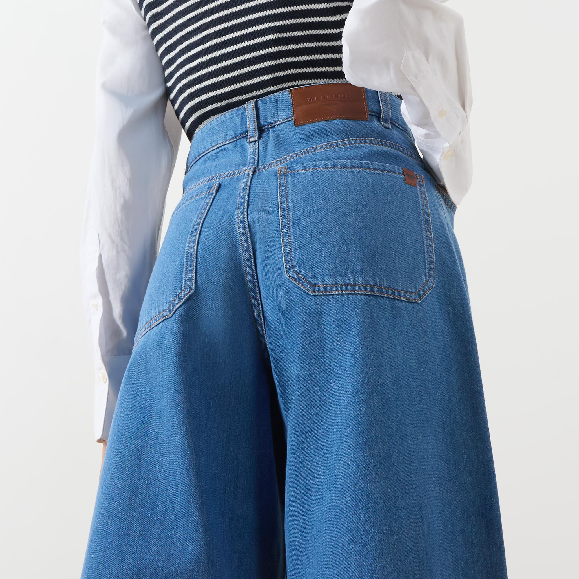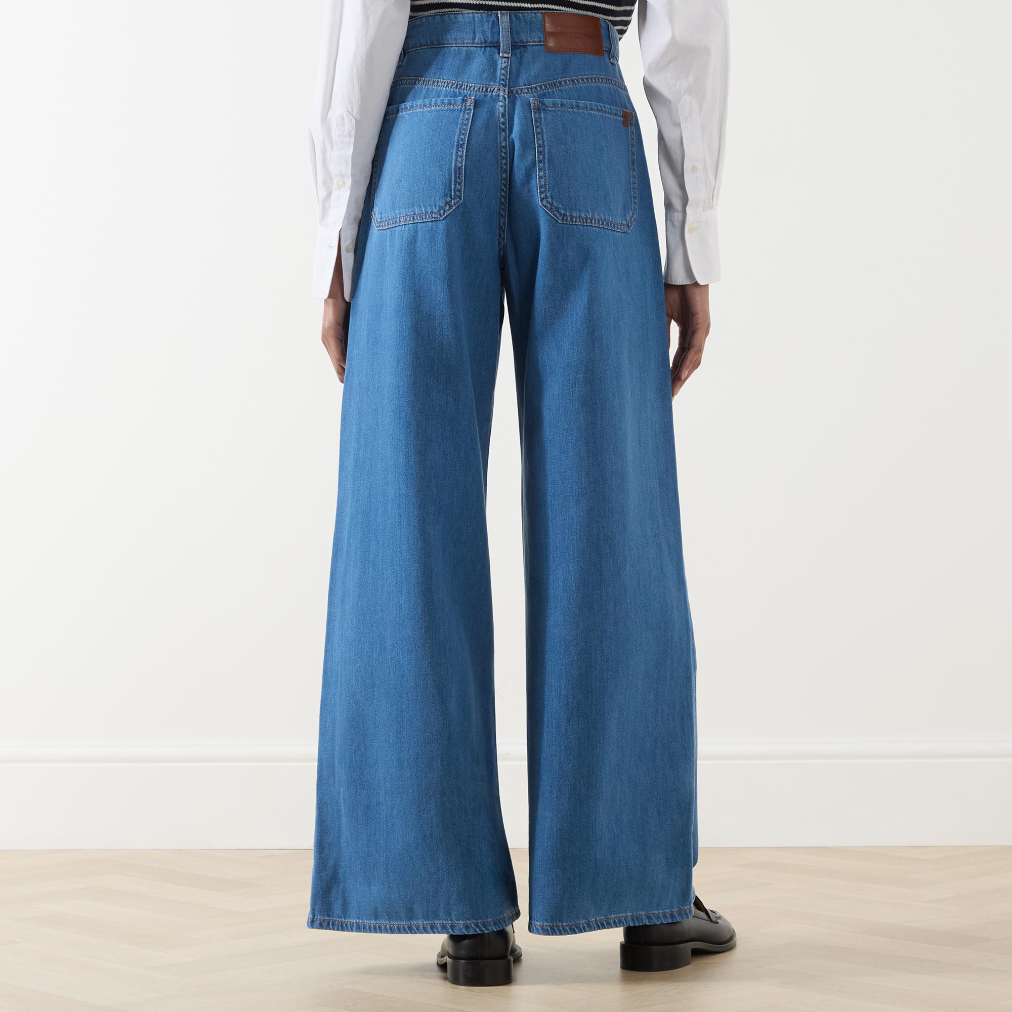 - Zip-fly and button fastening, belt loops, five-pocket design, tobacco stitching, rear logo patch, high-rise, wide-cut leg, smooth denim finish
