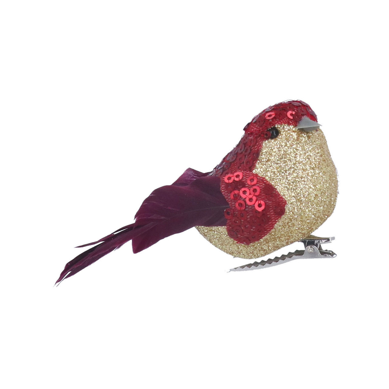 - Clip-on style, glittered bird with feather & sequin embellishment