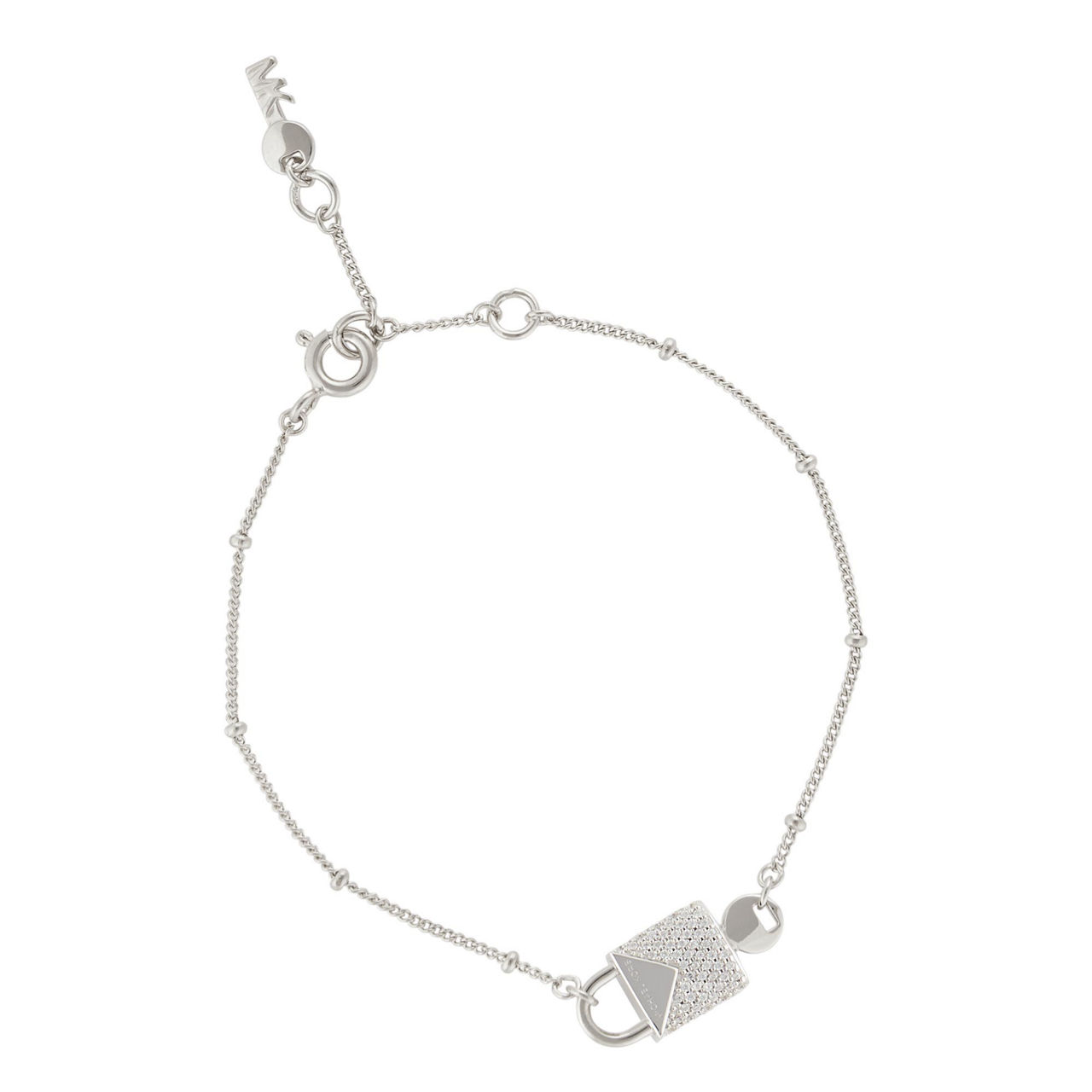 Up the ante on your accessories with this Mercer Padlock Bracelet from Michael Kors. Cut from sterling silver, the unique design boasts an embellished crystal pave padlock charm embossed with logo lettering, while the piece is finished with a lobster clasp closure and small key charm at the back. Pair up with the matching ring.