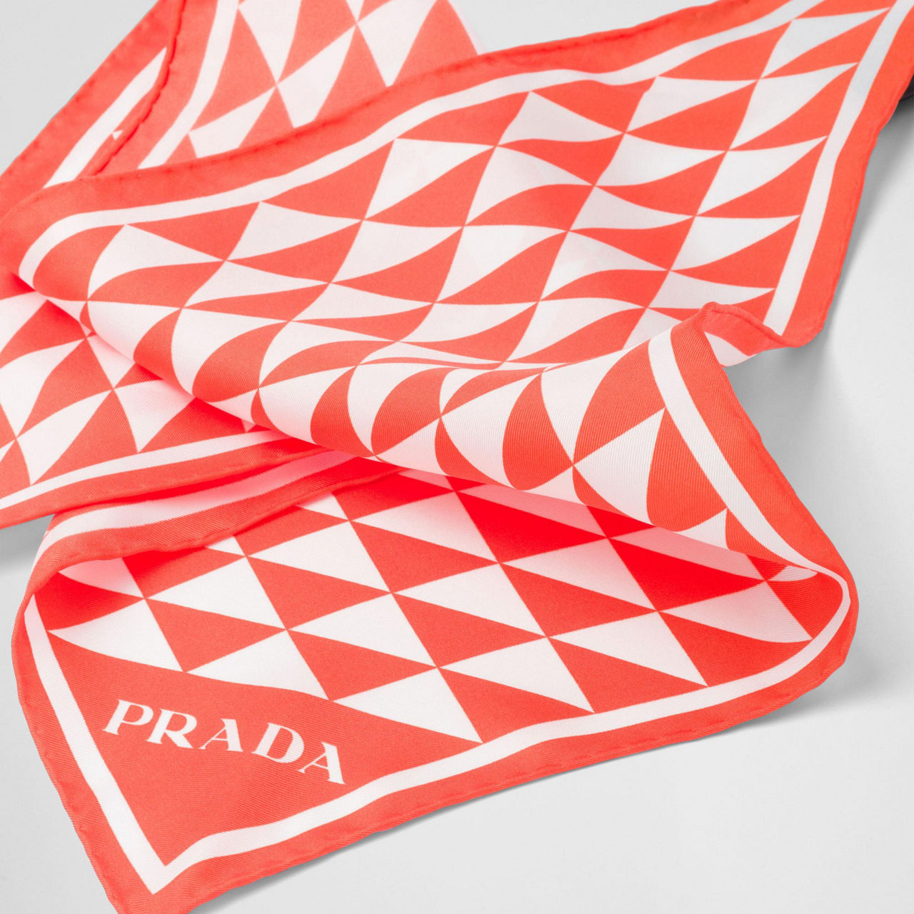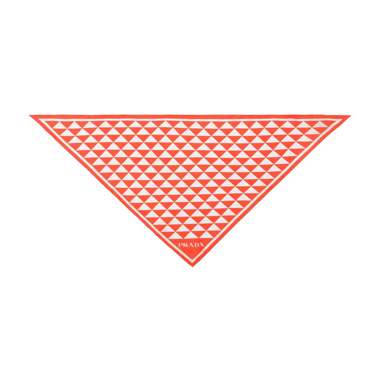 The triangle, Prada's iconic logo motif, is reimagined to create this delicate twill scarf. The triangular style scarf is printed with the brand's signature triangles, offering a chic and sophisticated accessory to finish an array of looks.