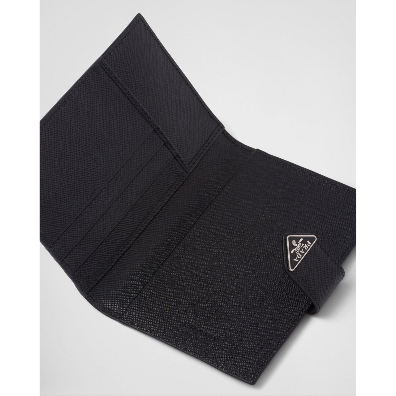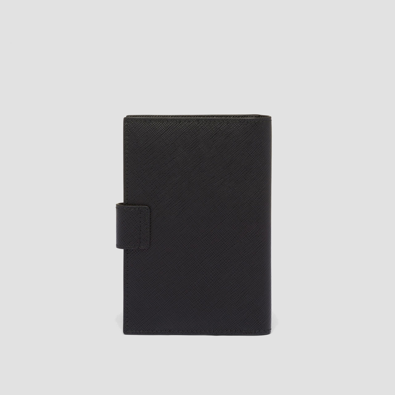 - Enamelled metal triangle logo, three card slots, three document pockets, moire and leather lining