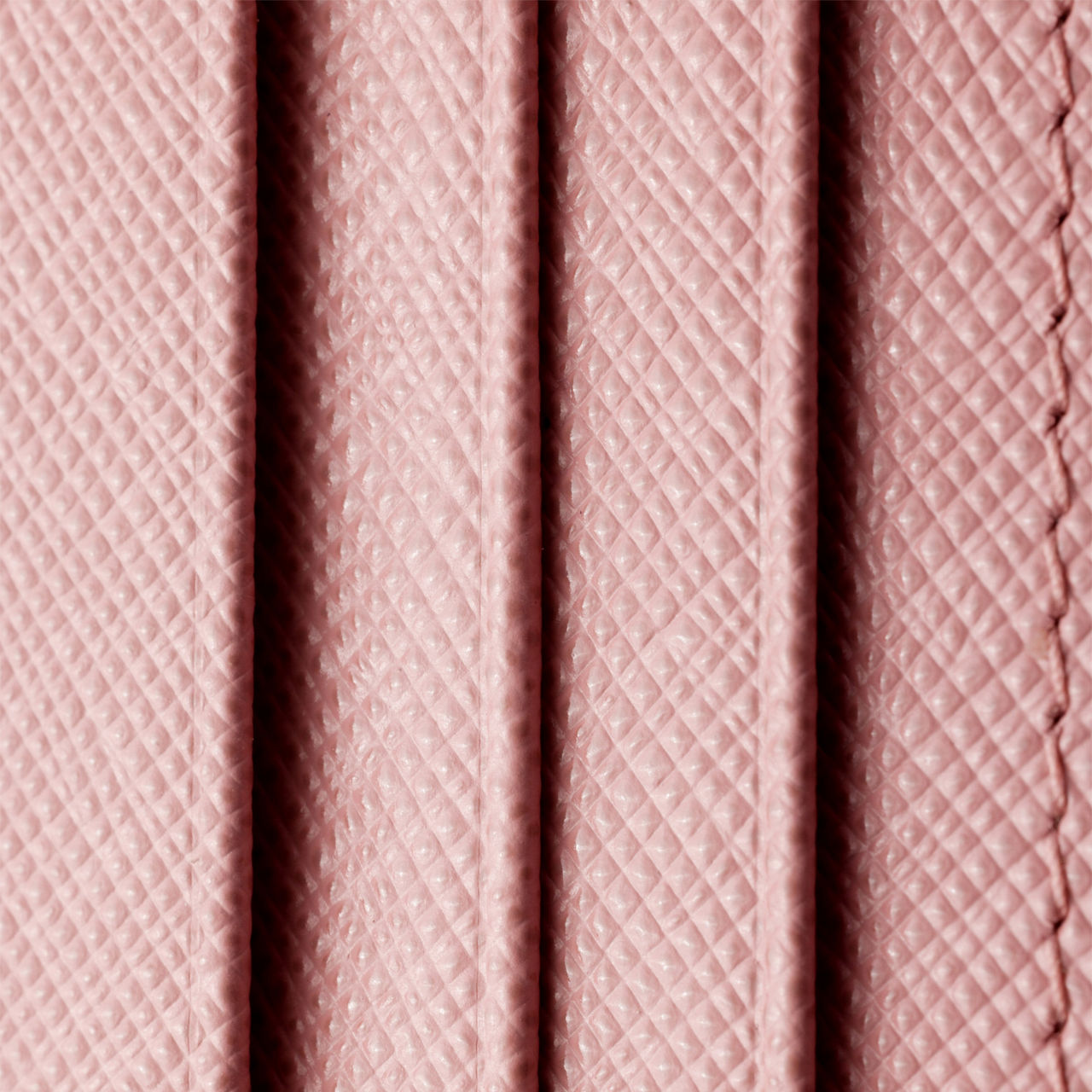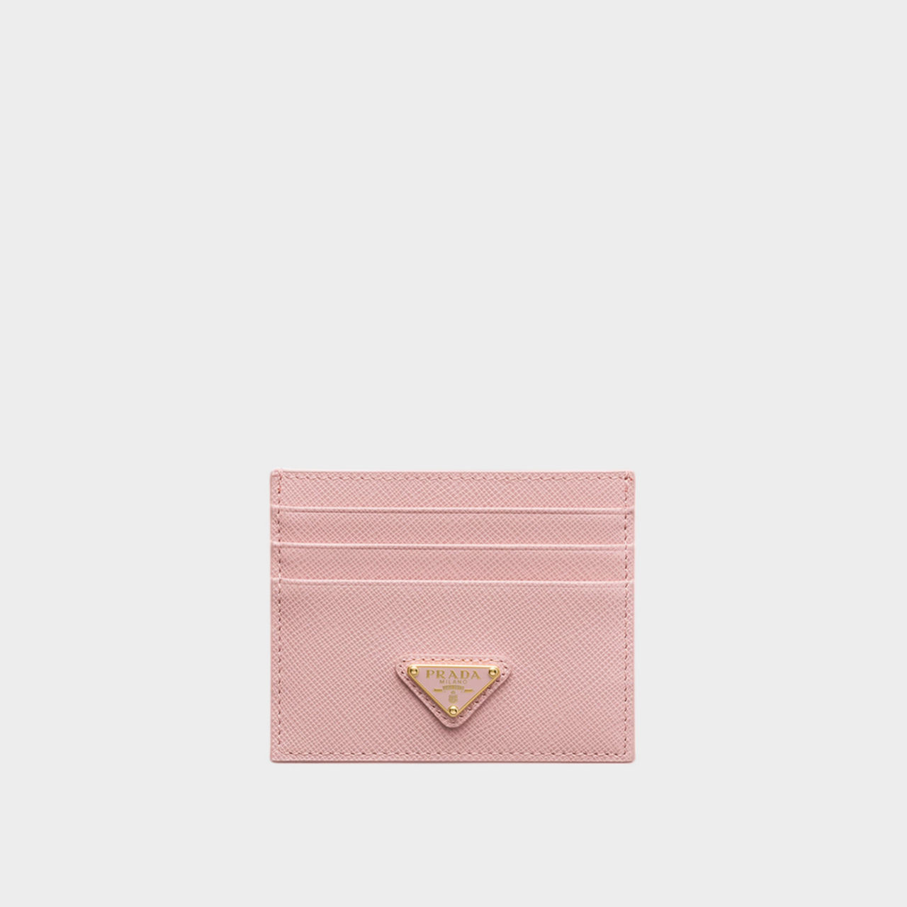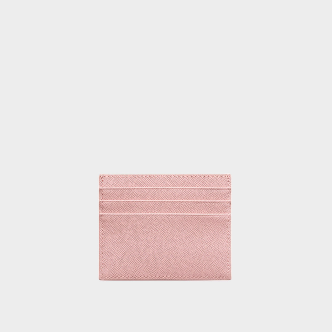 - Enamelled metal triangle logo, six card slots, one inside pocket, moire and saffiano leather lining