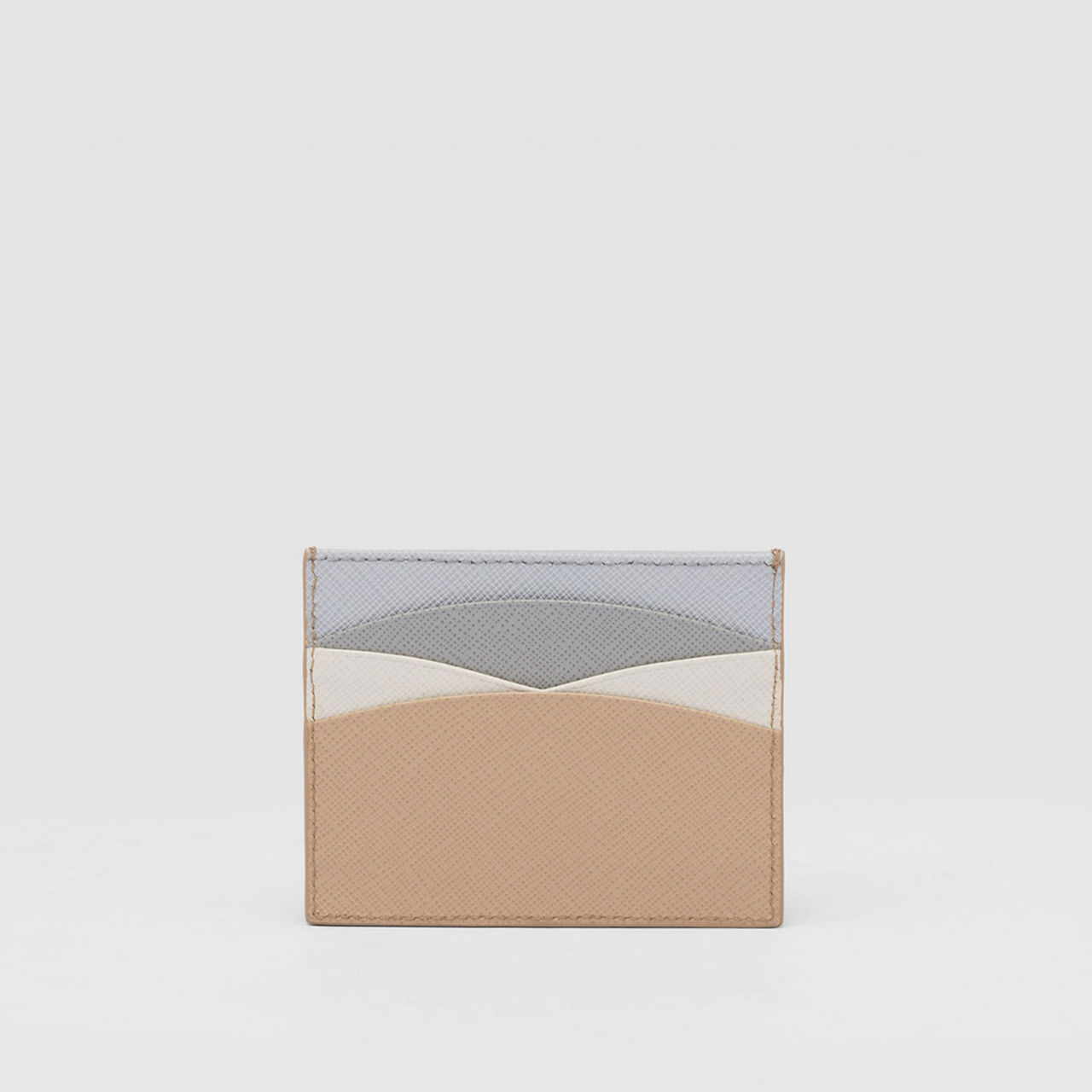 - Multi-coloured Saffiano leather lining, fabric-lined centre pocket, metal lettering logo, six card slots, one inside pocket, Moiré and Saffiano leather lining
