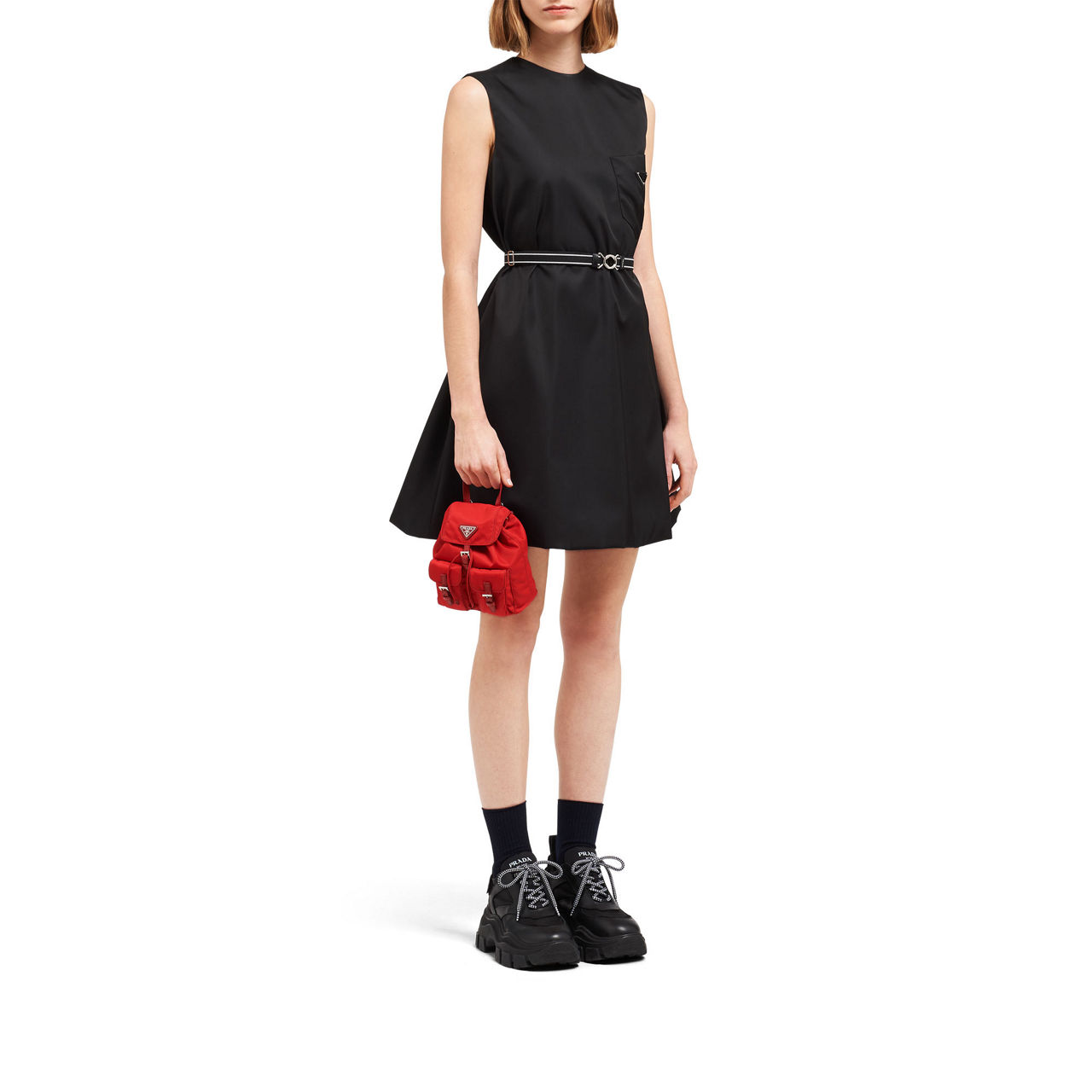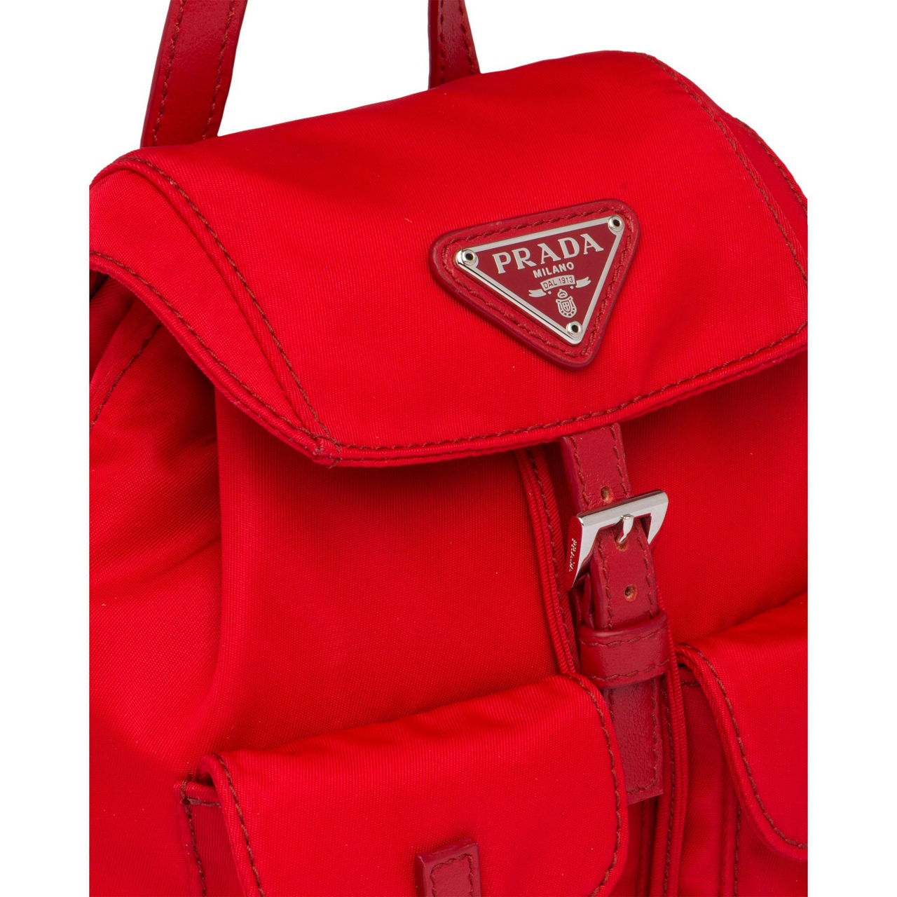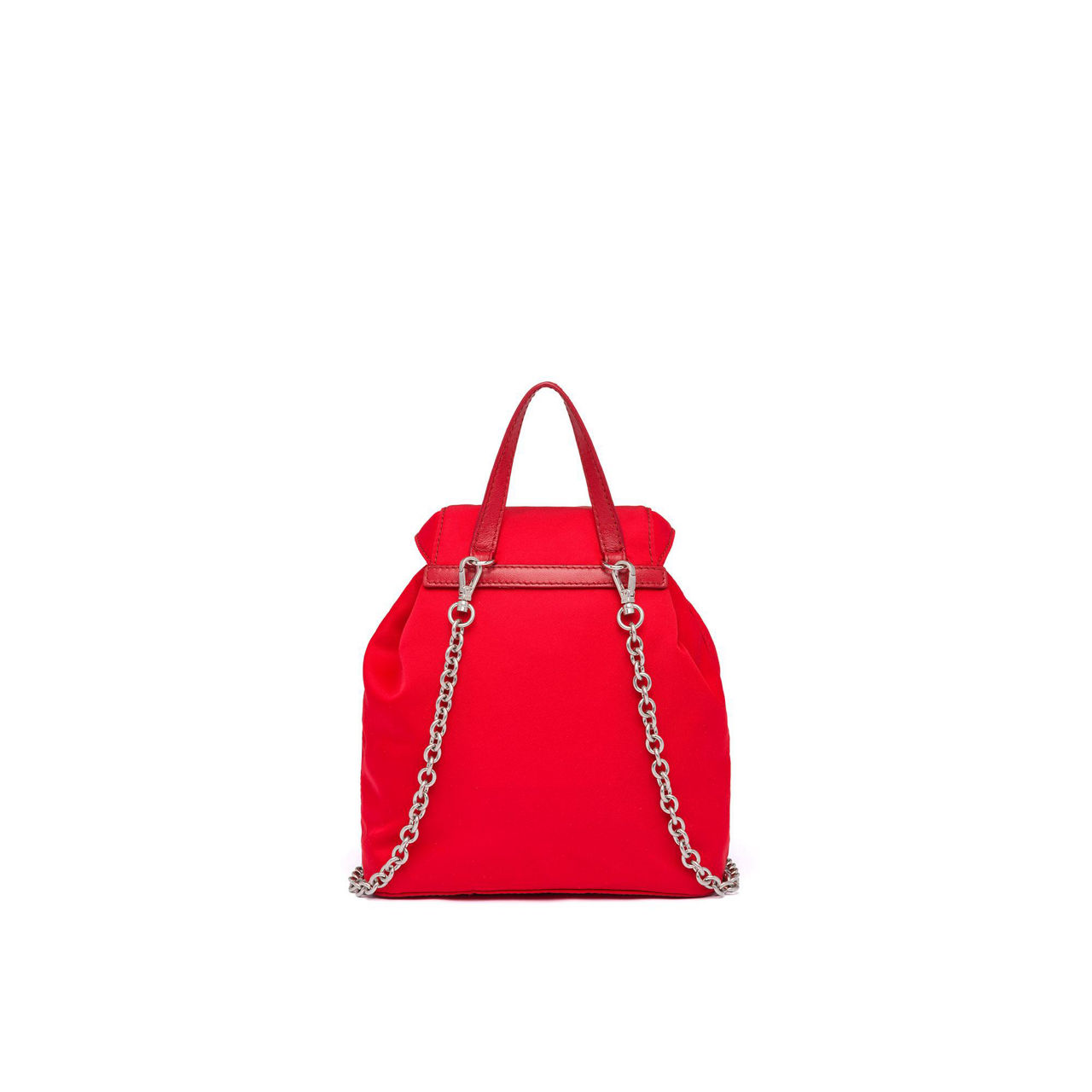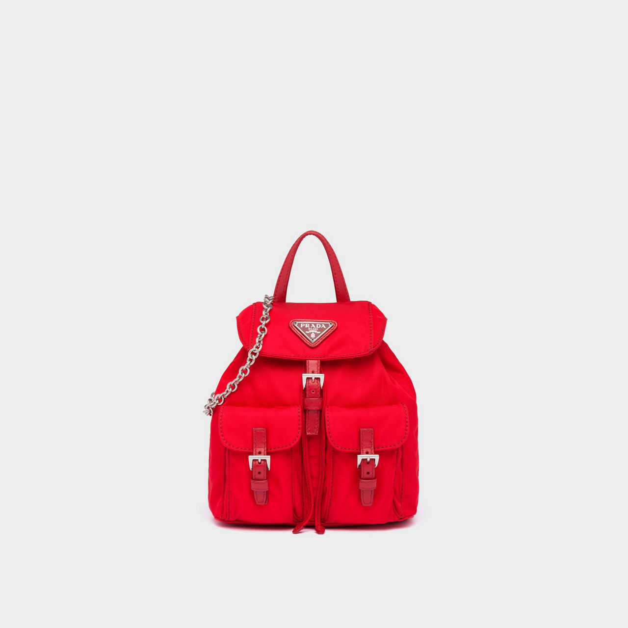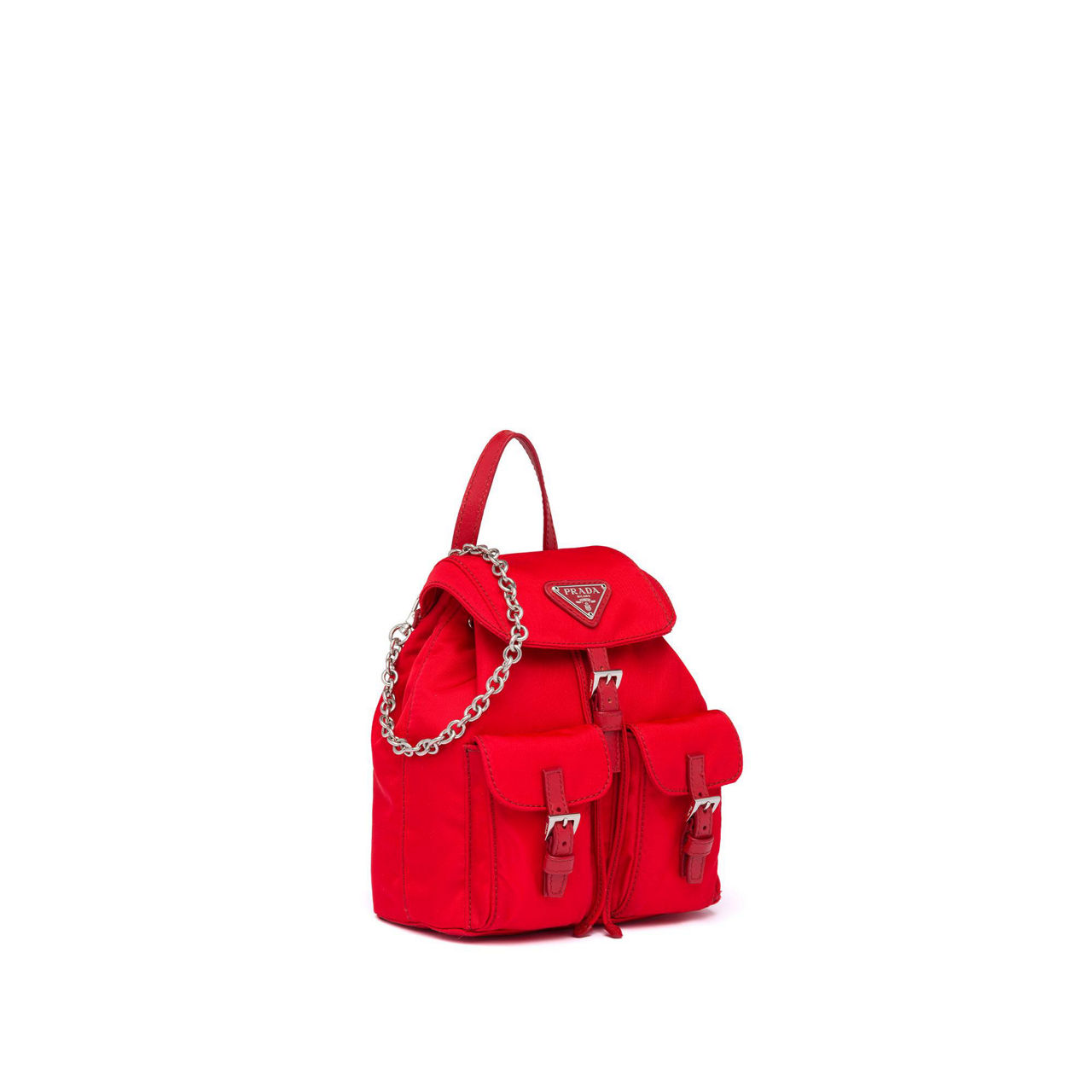 - Nylon structure, Saffiano leather handle, detachable metal chain shoulder strap, flap closure with leather strap and buckle, two outside pockets, enamelled metal triangle logo.