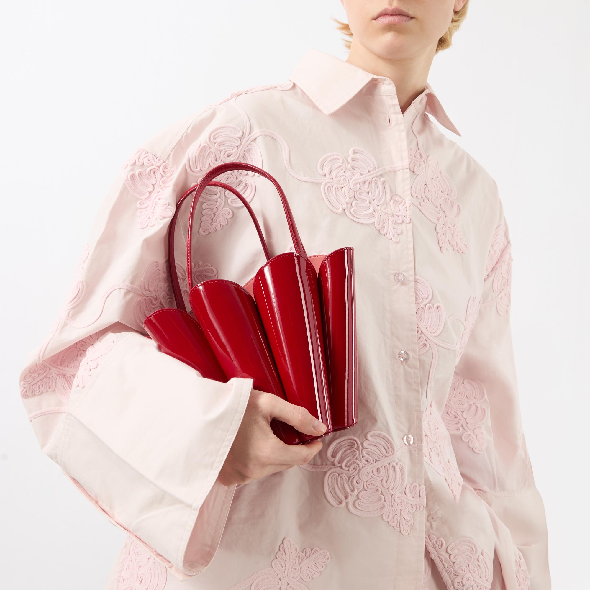 - Top carry handles, detachable and adjustable crossbody strap, open-top, engraved silver-tone hardware, structured floral silhouette, tonal stitching, patent finish