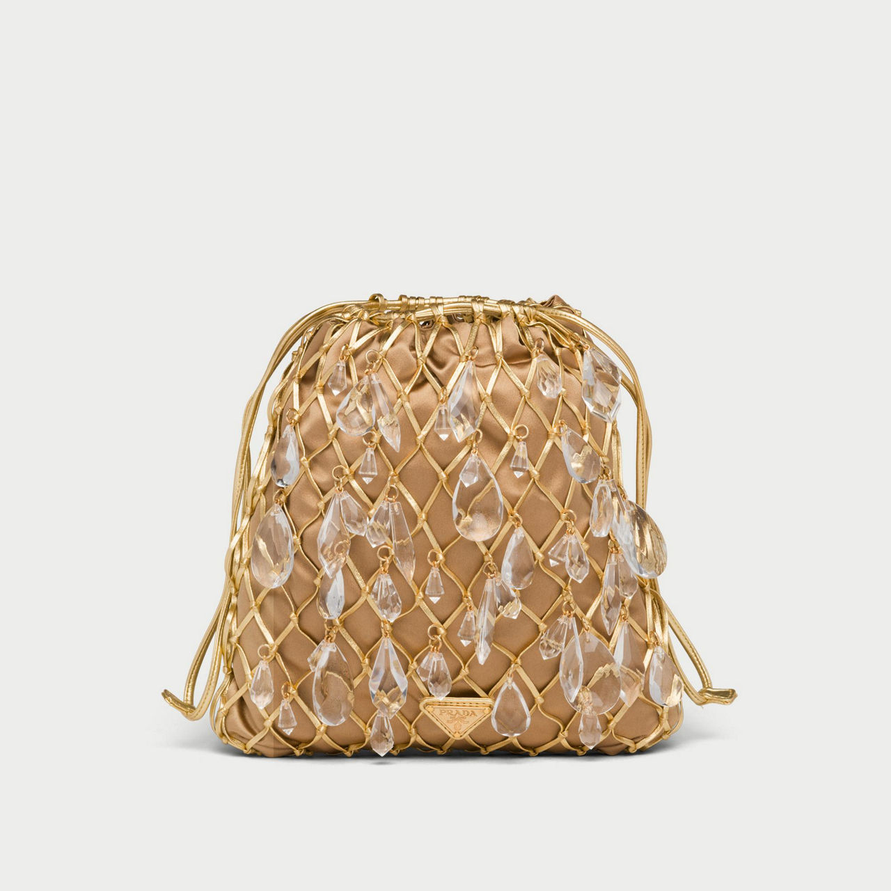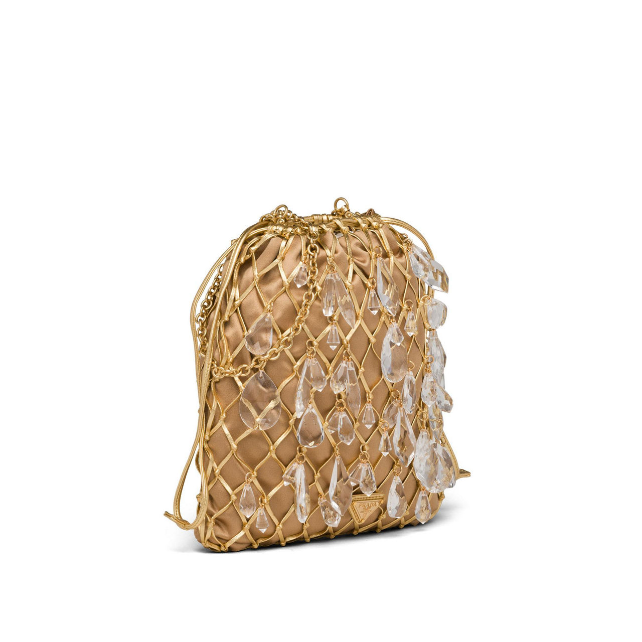 Embellished with dazzling drop-crystal details, the mesh outer of this ornate drawstring bag from Prada offers a striking complement to the satin structure within. A choice evening style you'll turn to for every occasion.