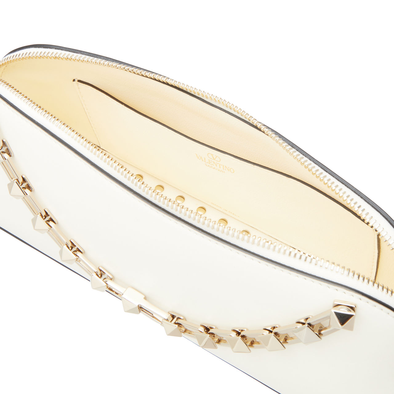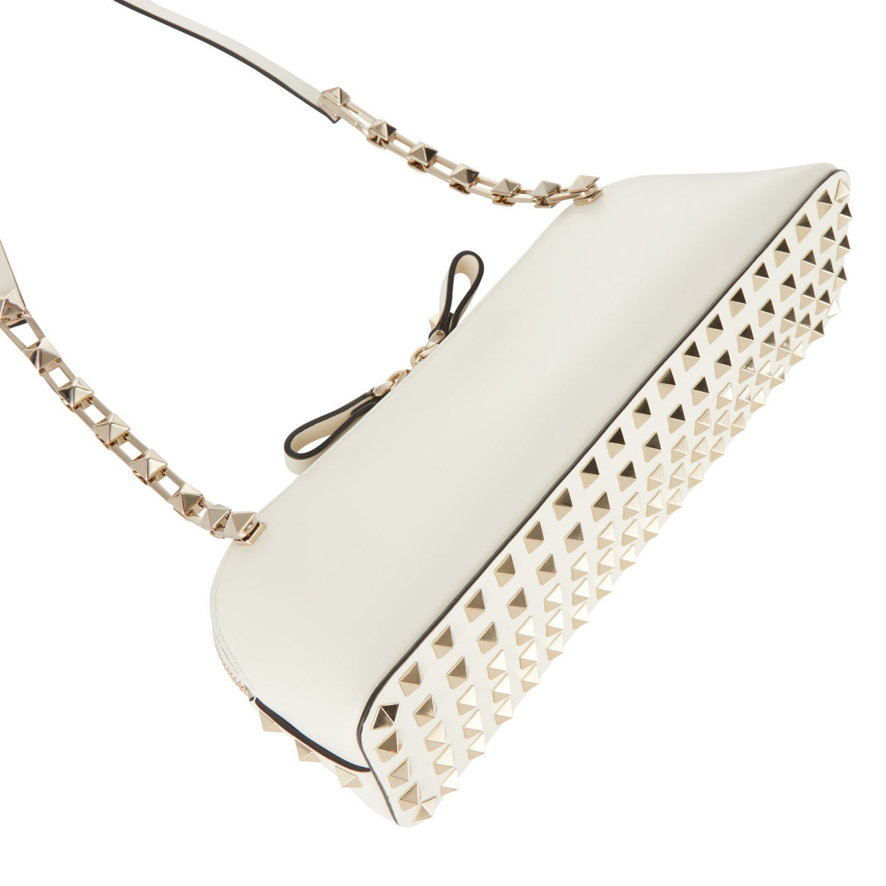 - Platinum-finish stud covered base, two-way zip fastening, leather lining, one interior card slot, extendable chain shoulder strap with central opening hook and additional leather section, can be handheld or worn as a crossbody or shoulder bag