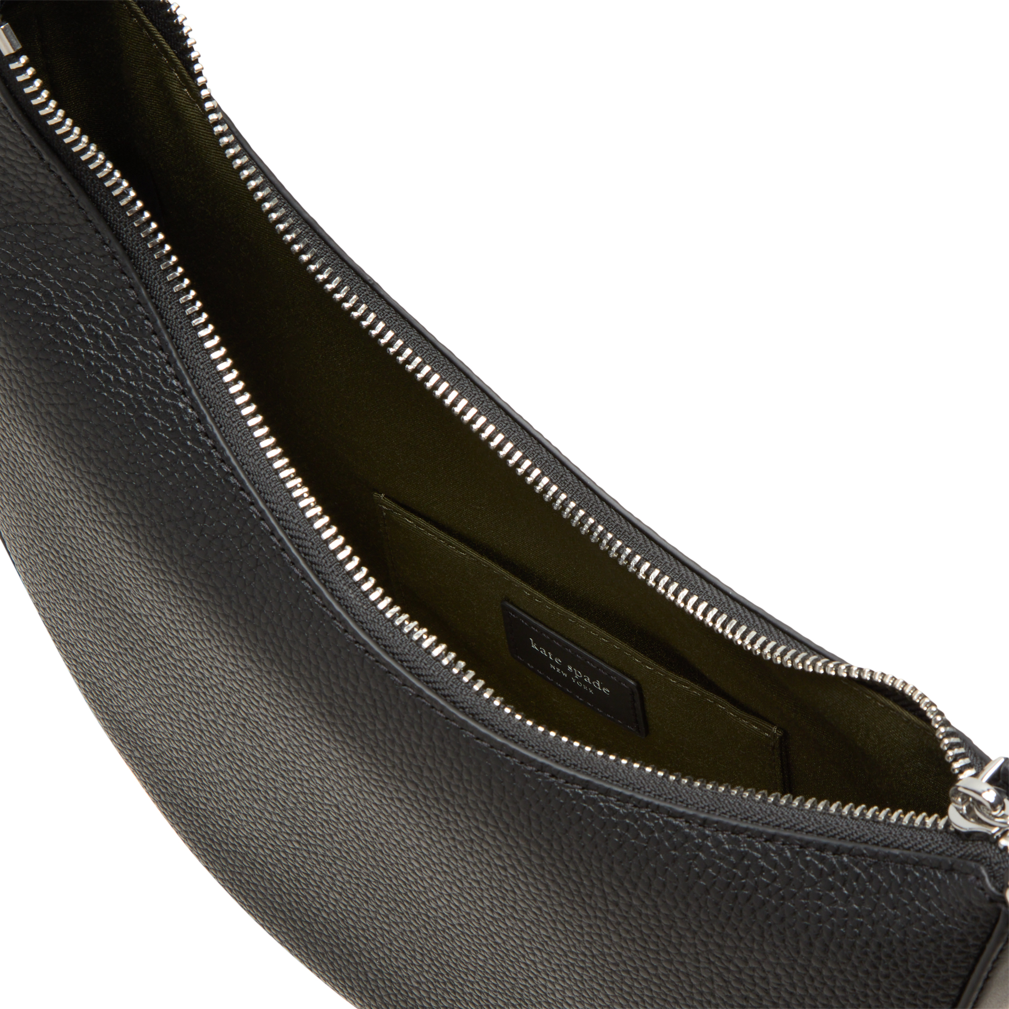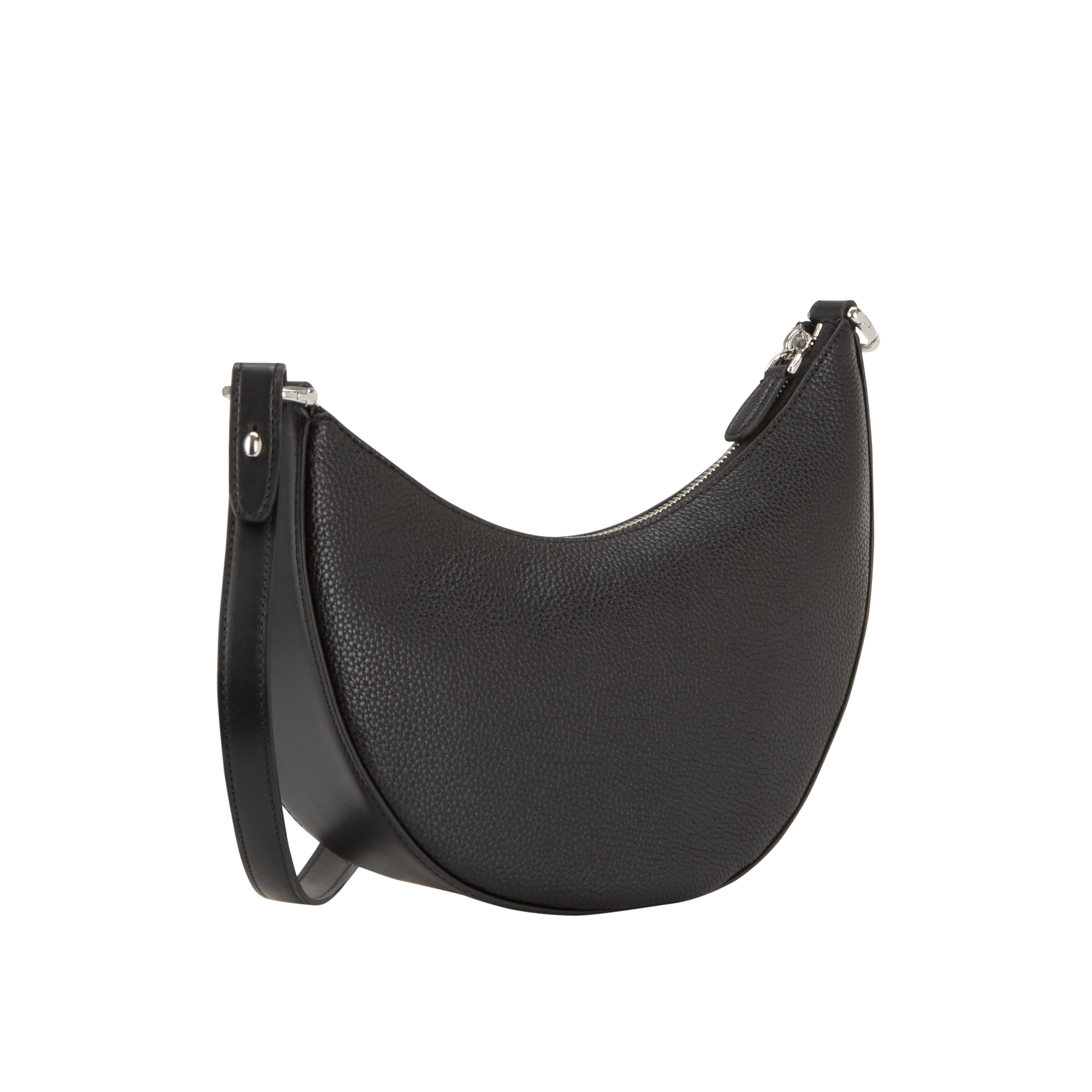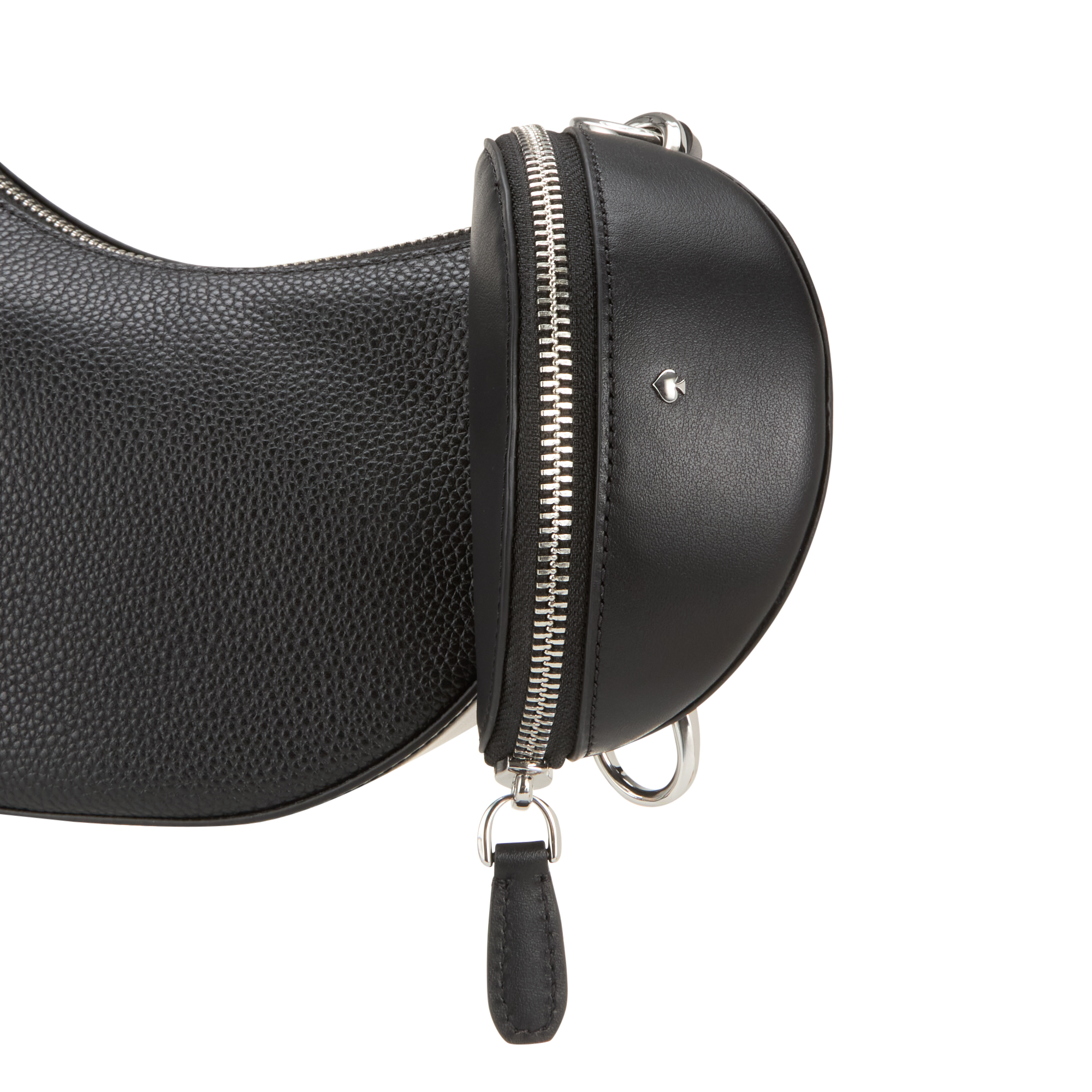 - Top zip fastening, adjustable crossbody strap, detachable mini purse, crescent silhouette, tonal piping, silver-tone hardware, textured finish